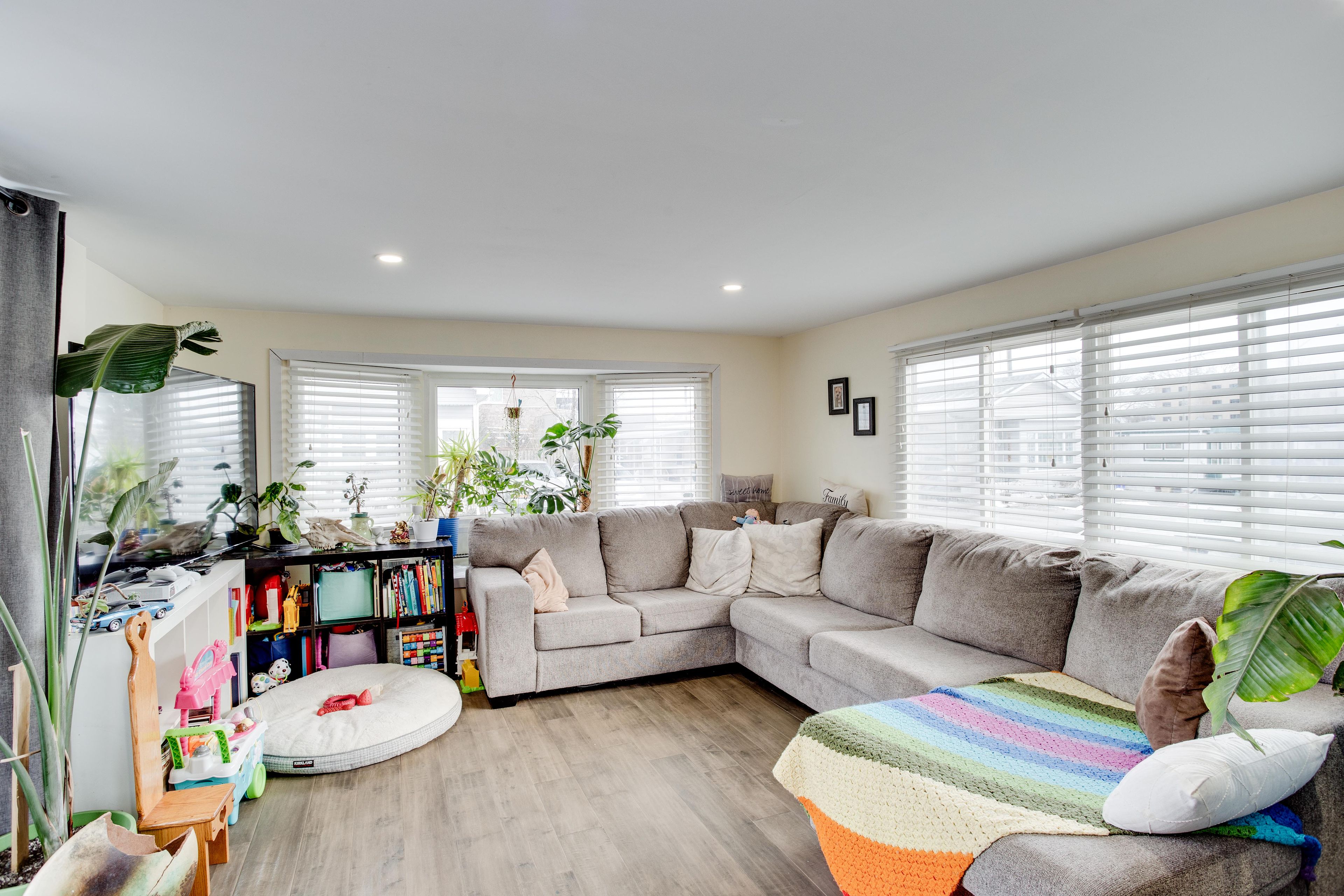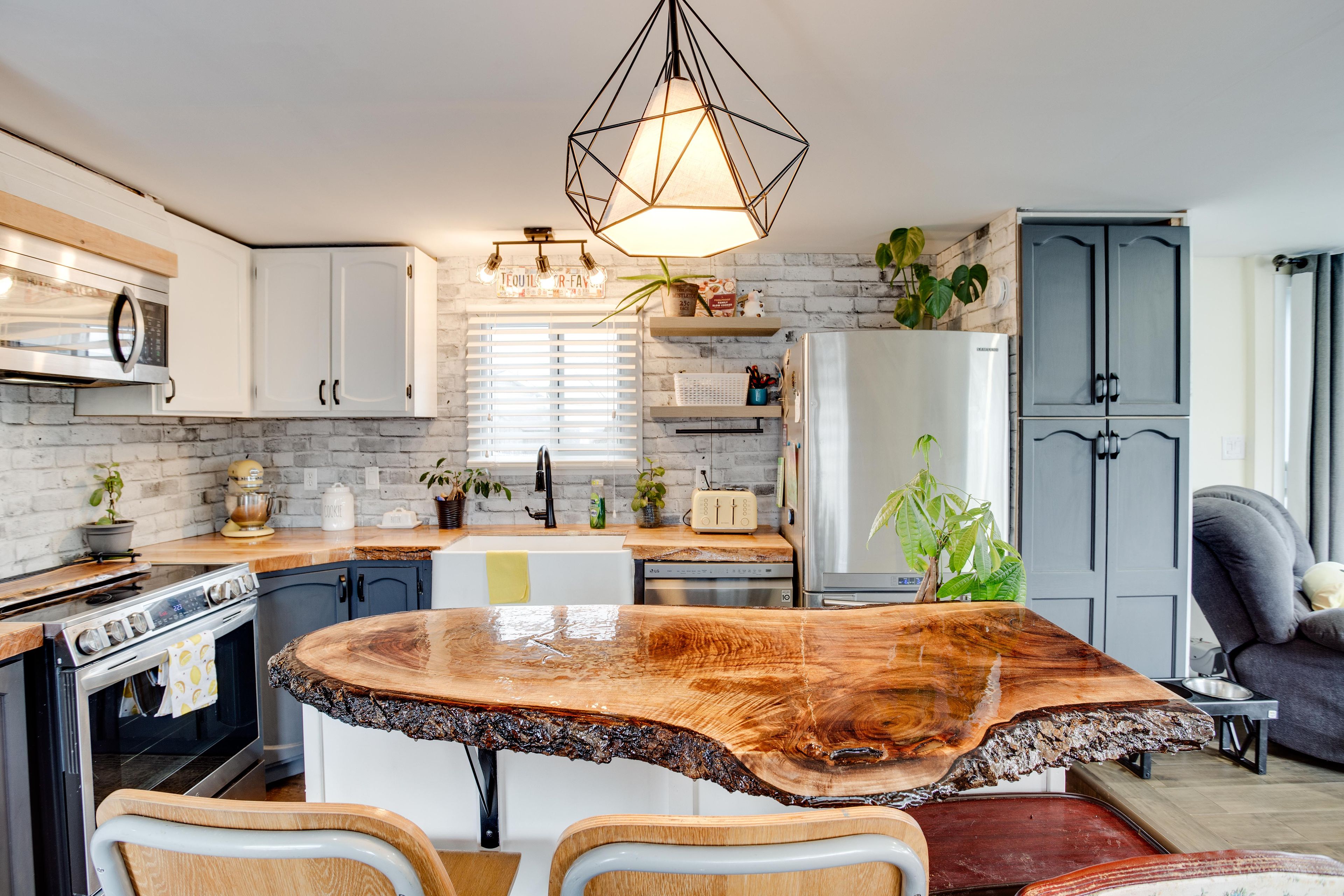 • Bright open-concept layout with updated kitchen and custom countertops.