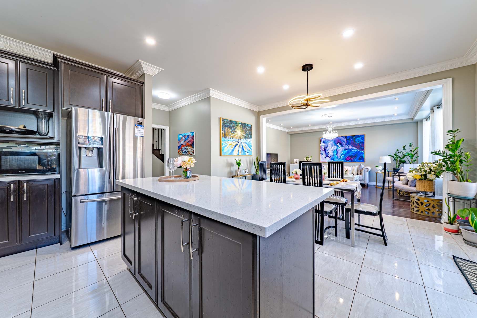 • Large gourmet kitchen with stainless steel appliances and central island.