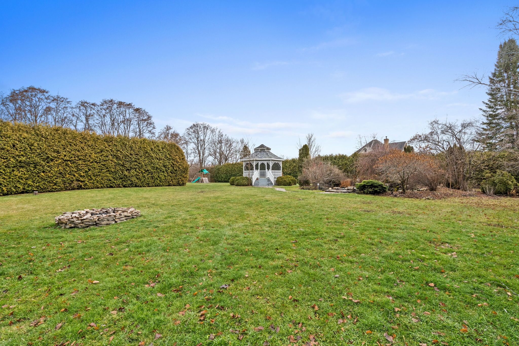 • Backyard retreat features a pond, gazebo, pool, play structure, and fire pit.
