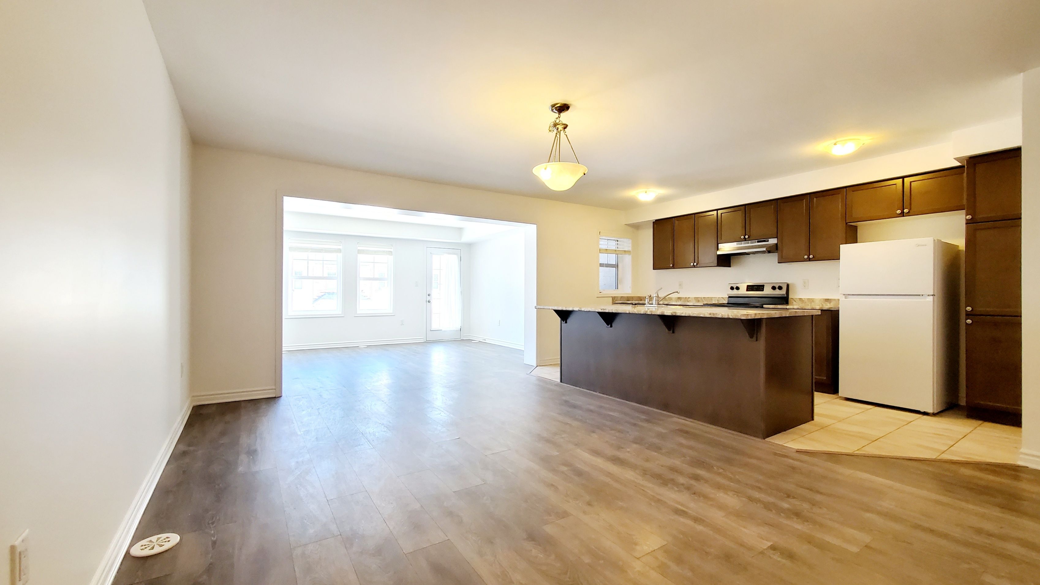 • Open concept second floor with kitchen, dining, and living areas.
