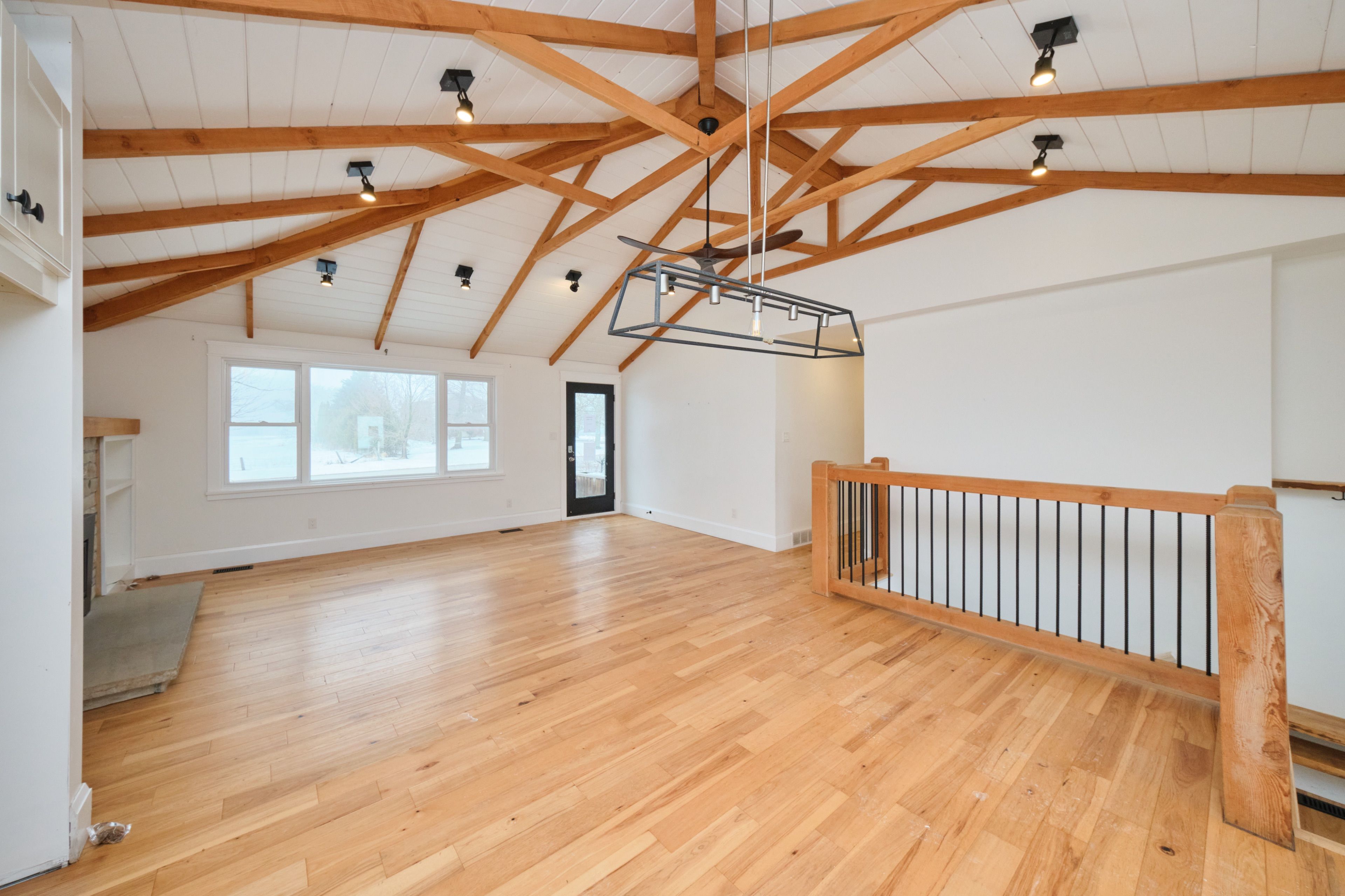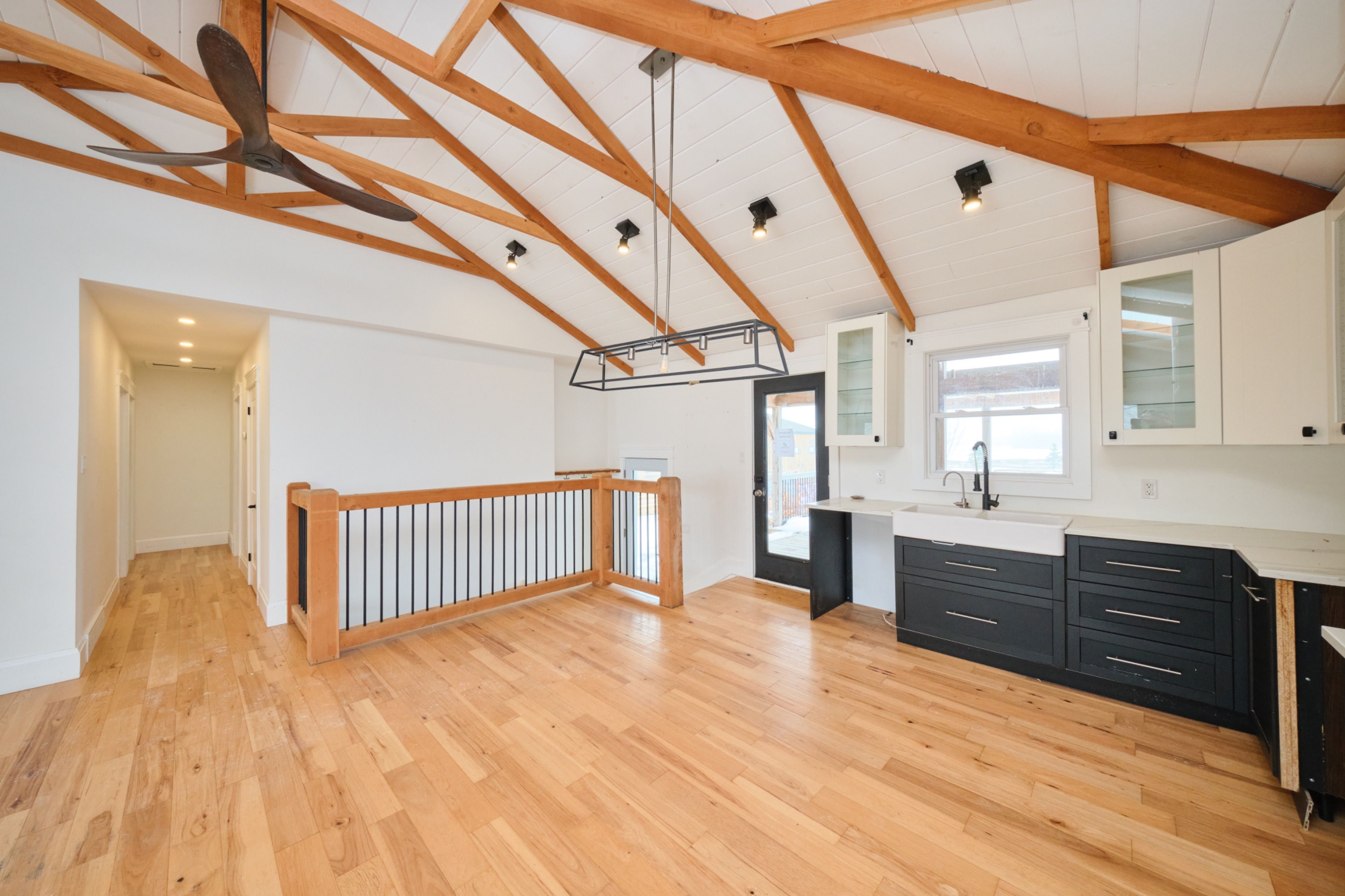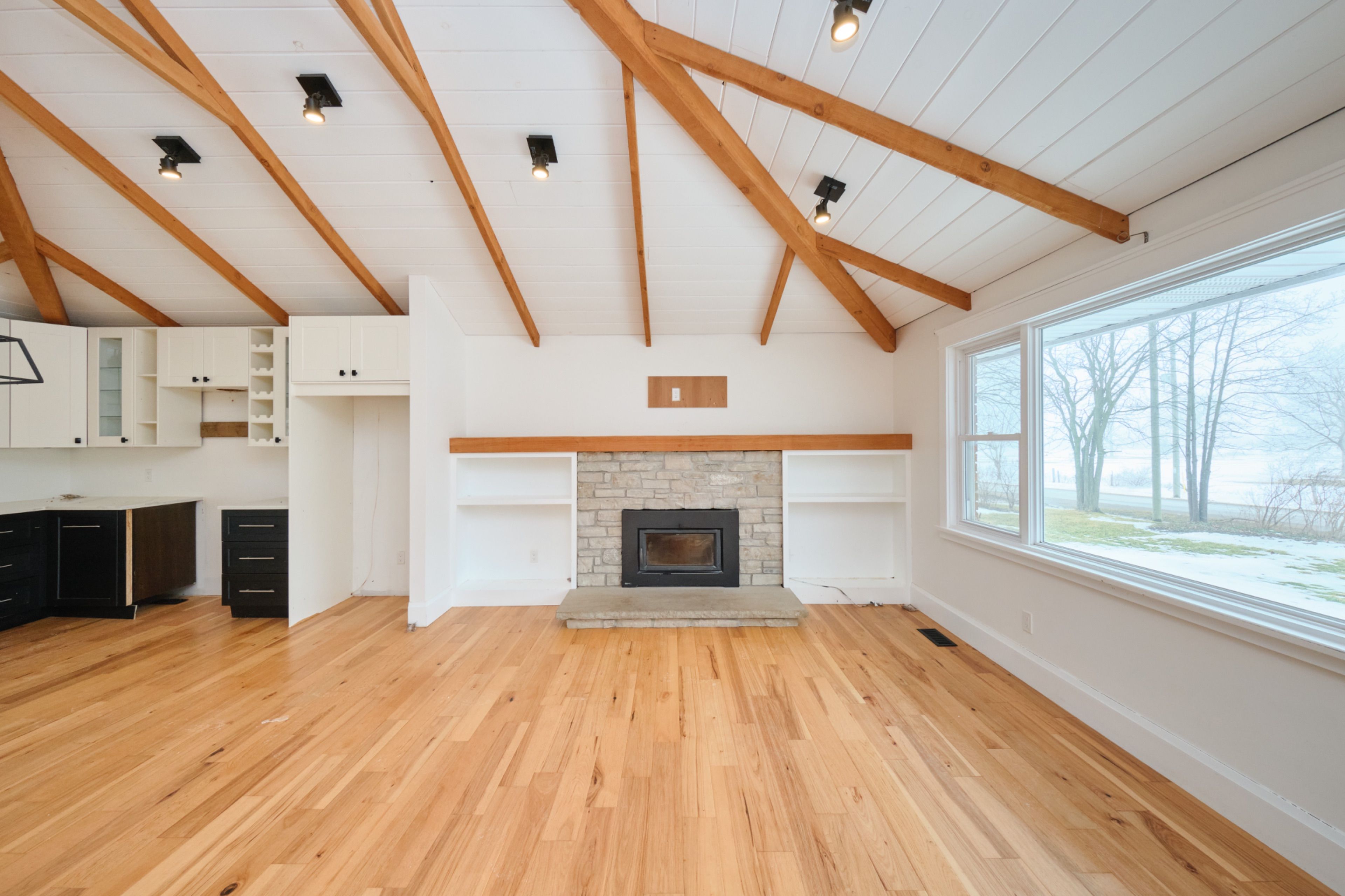 • Open concept kitchen and living room with vaulted ceiling and wood beams.