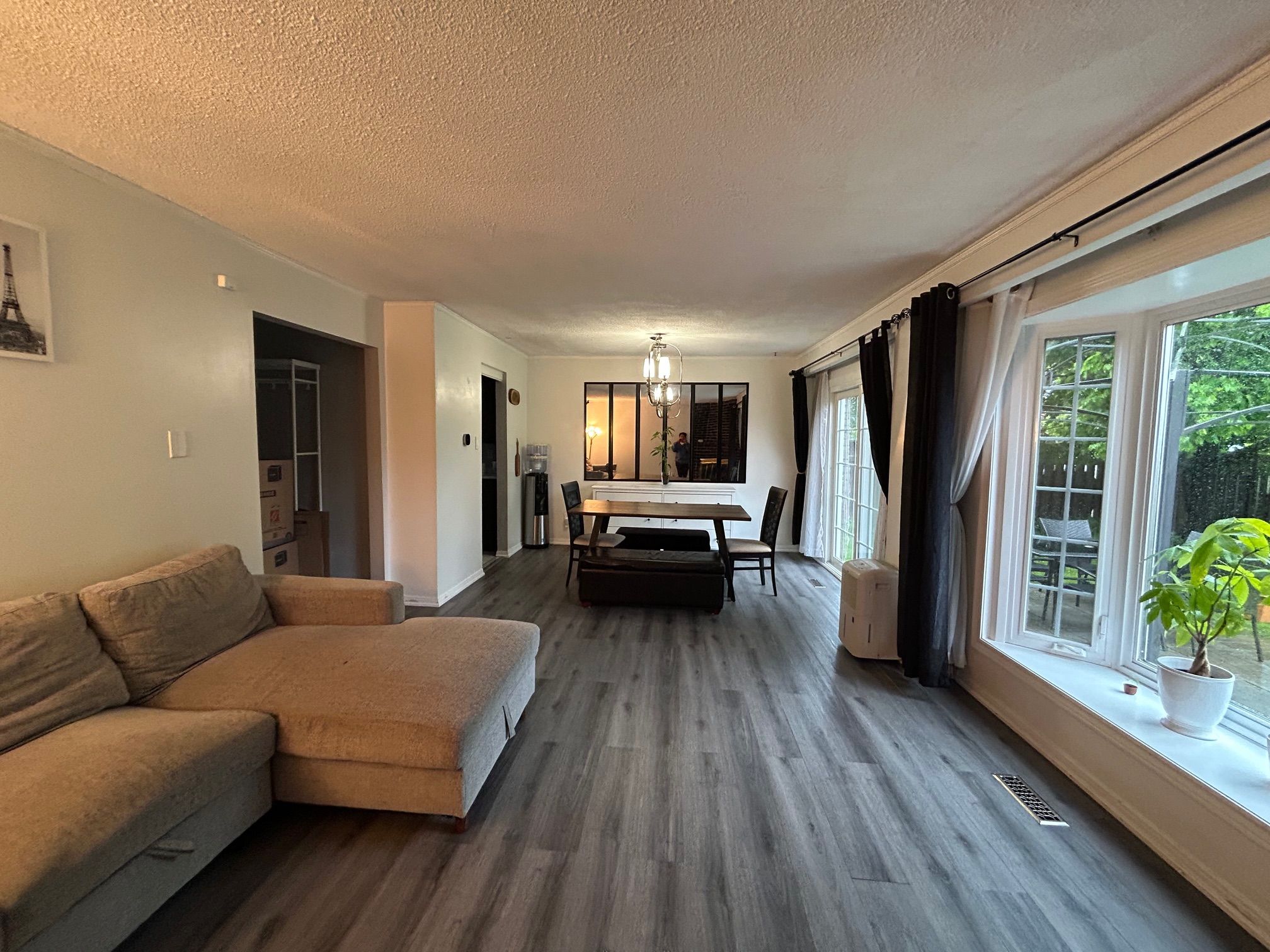 • Living/dining space features vinyl plank flooring and a wood-burning fireplace.