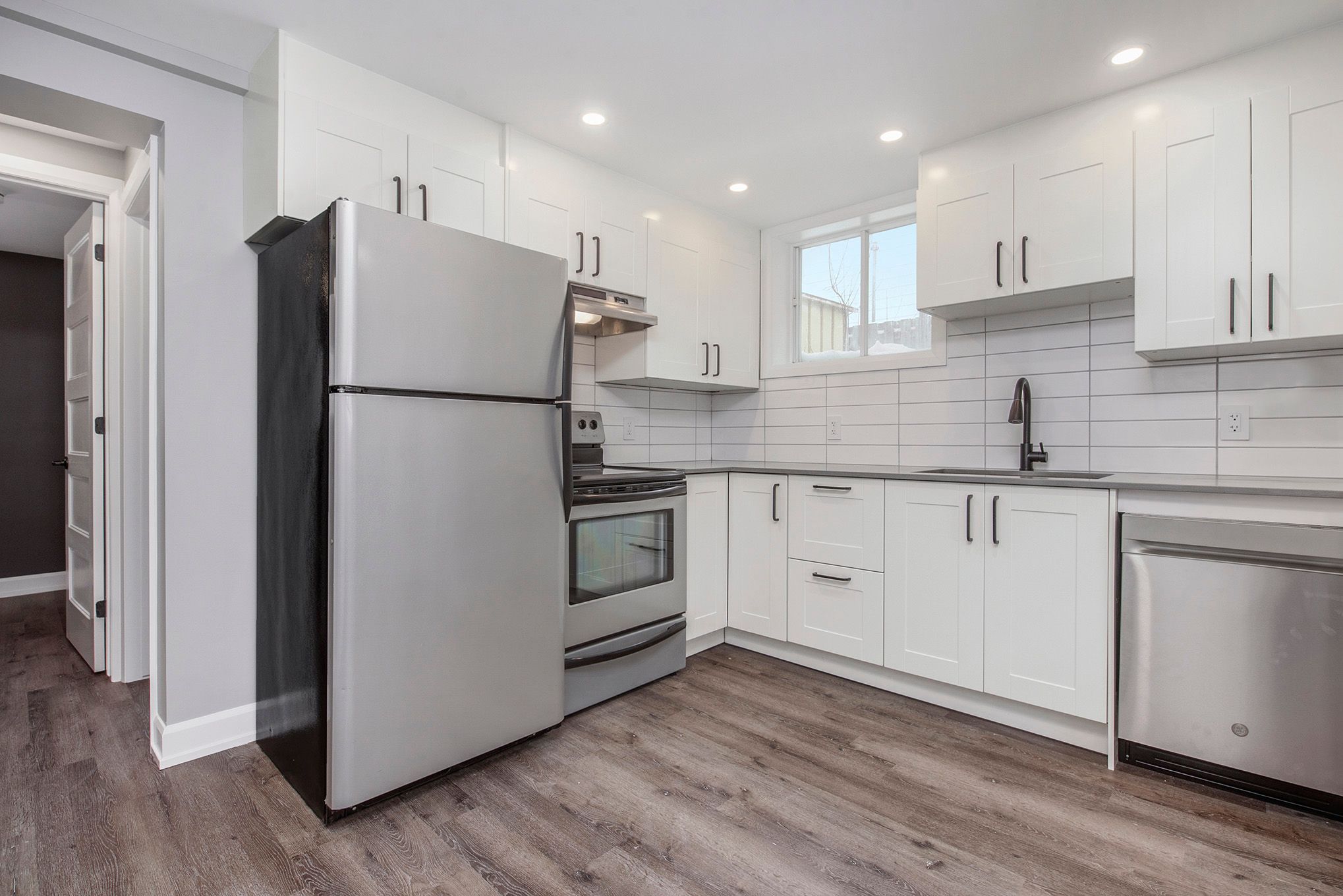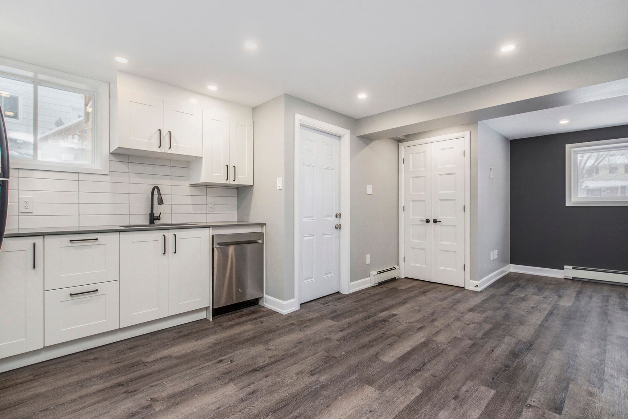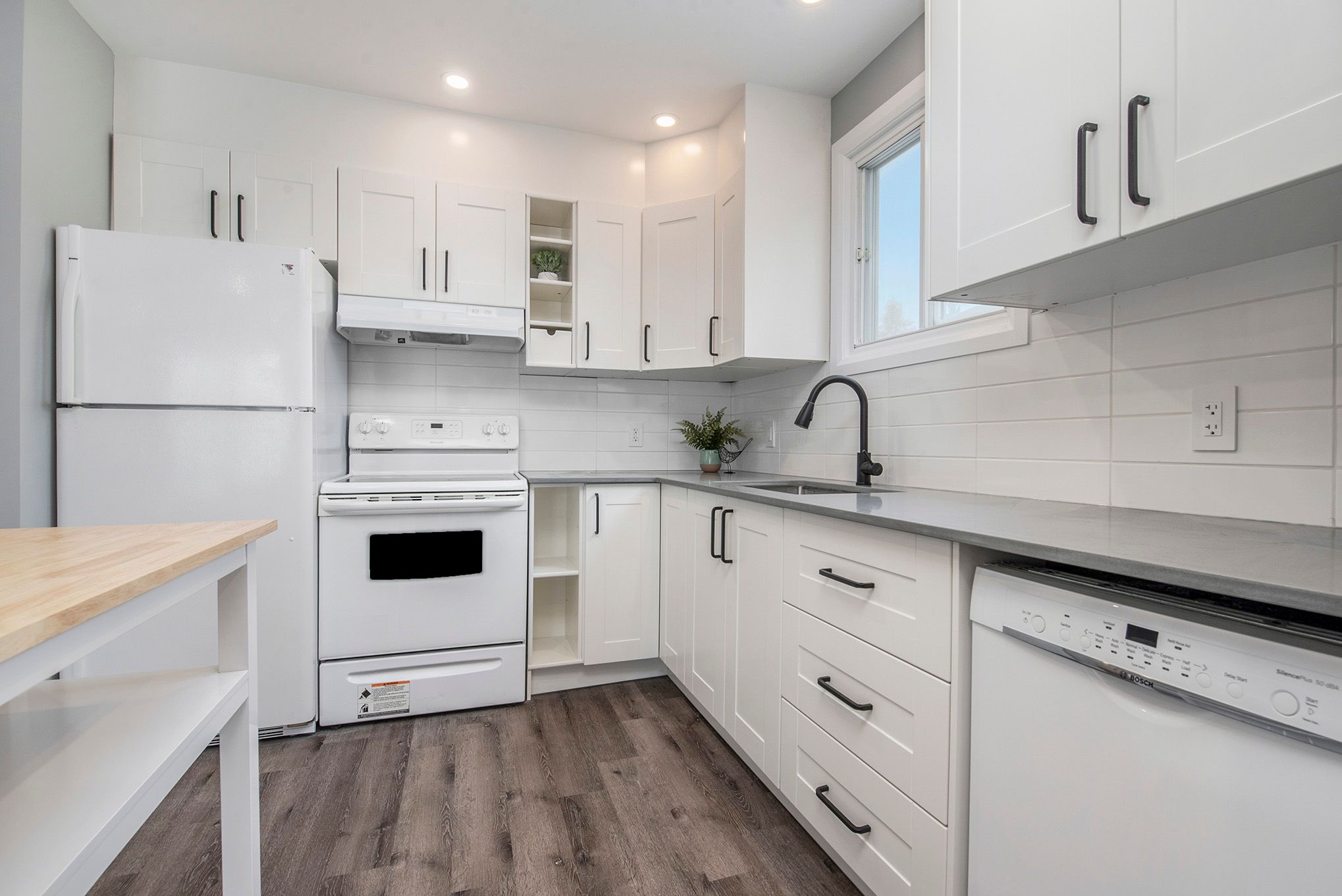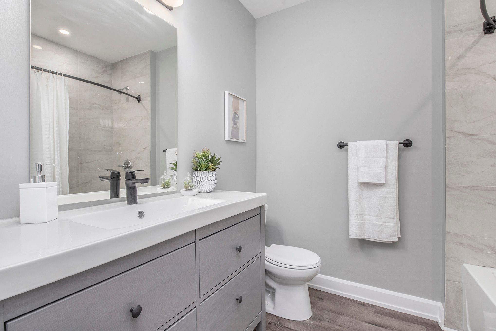 • Modern kitchens with quartz countertops and luxury vinyl plank flooring.