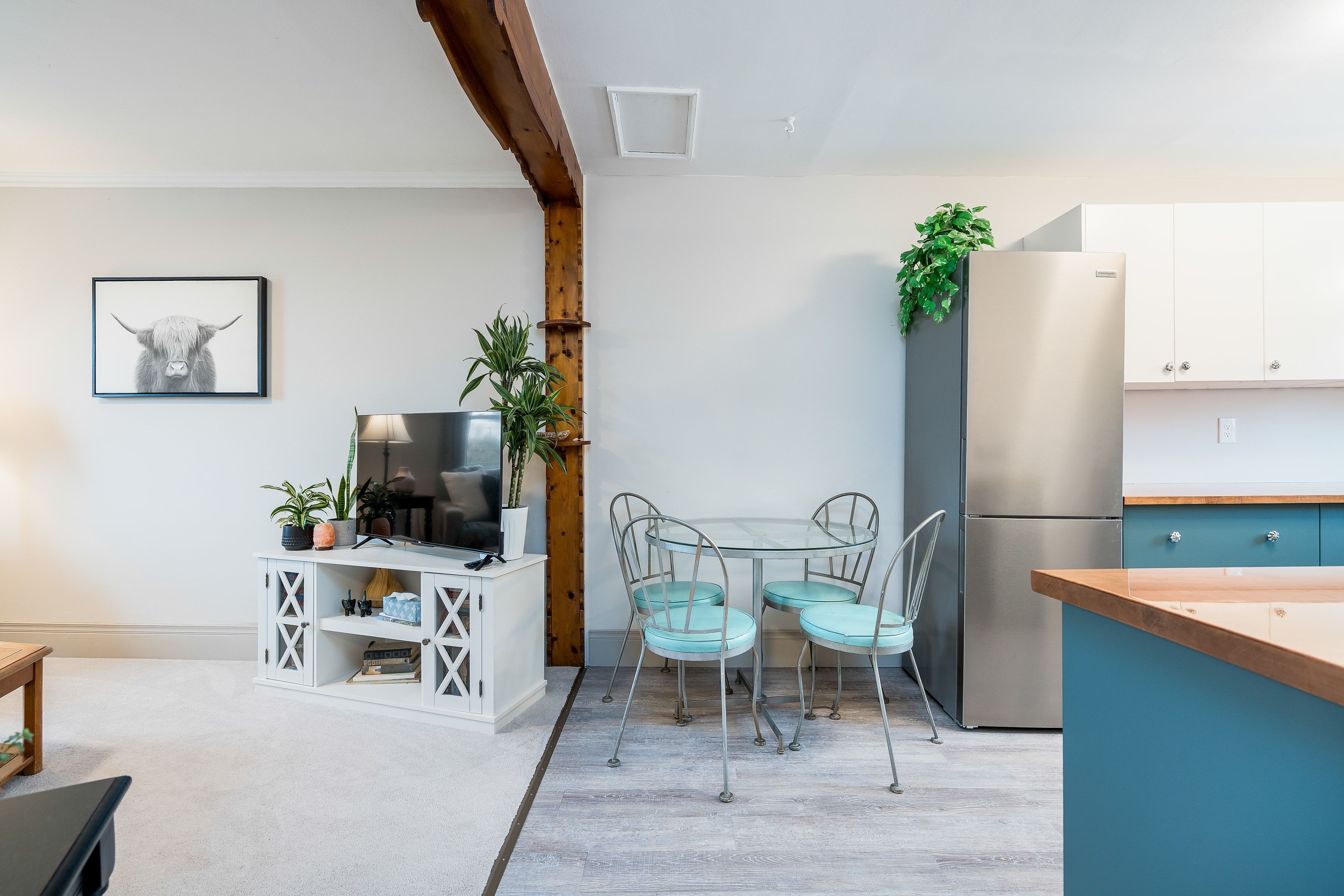 • Upper-level apartment features open-plan kitchen, bedroom, and in-suite laundry.