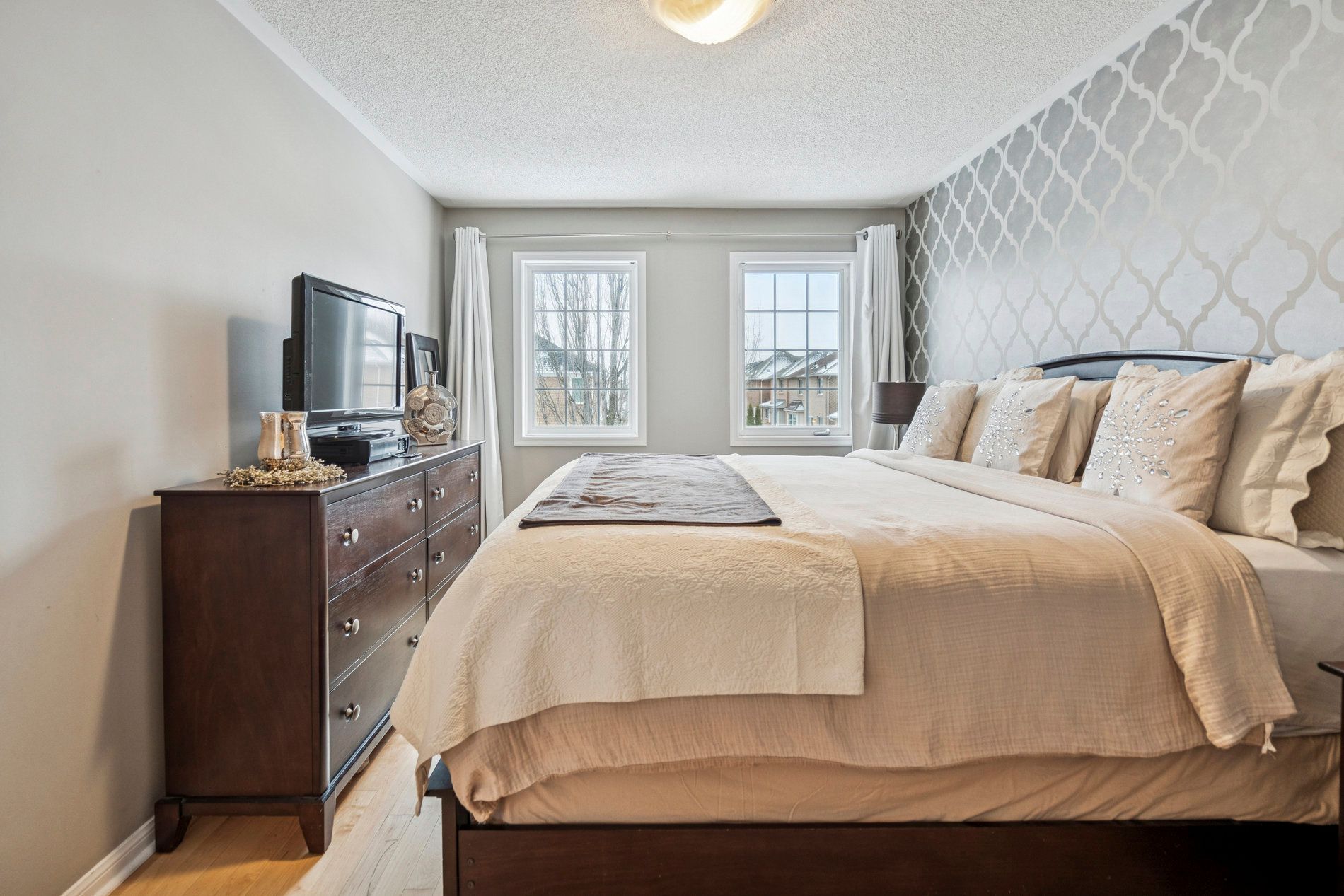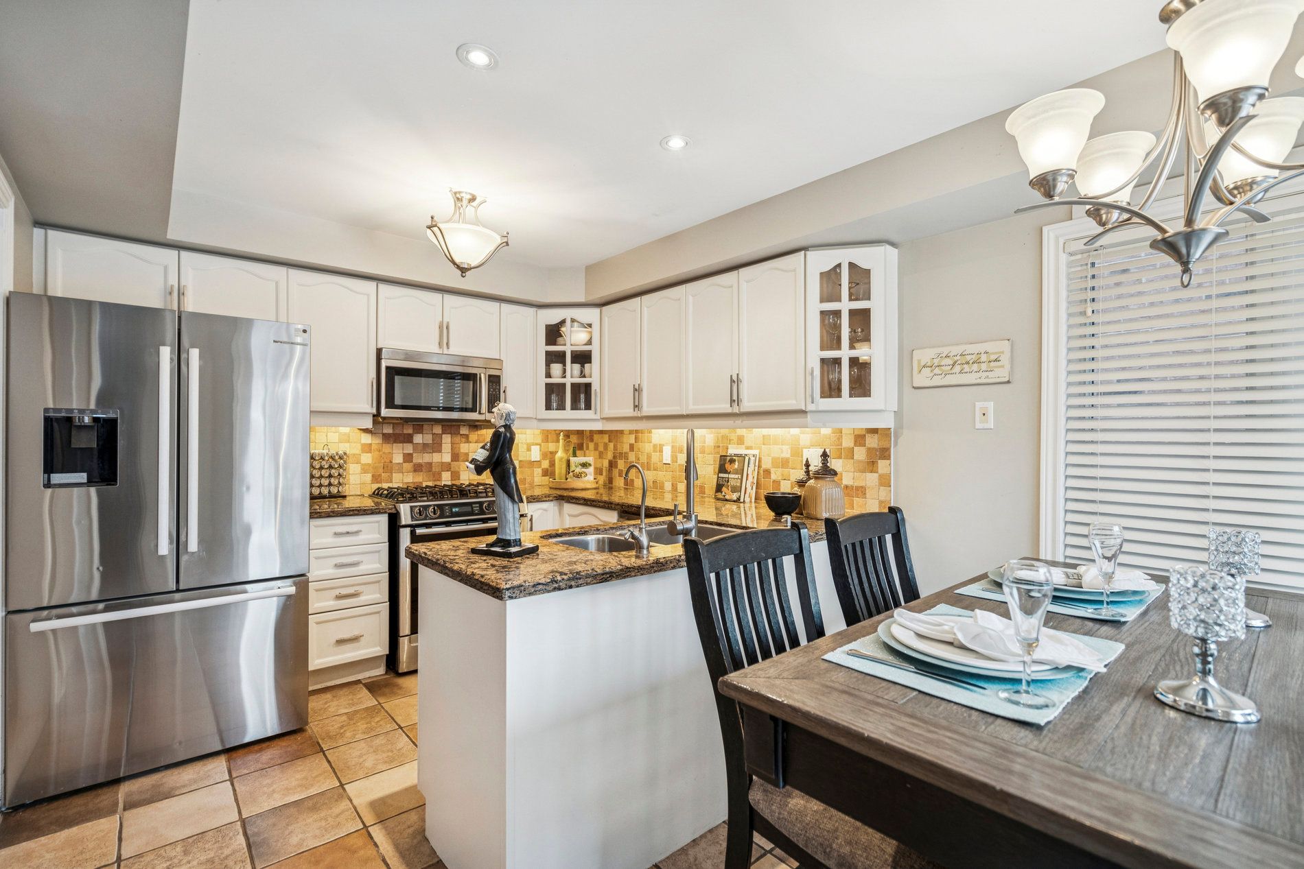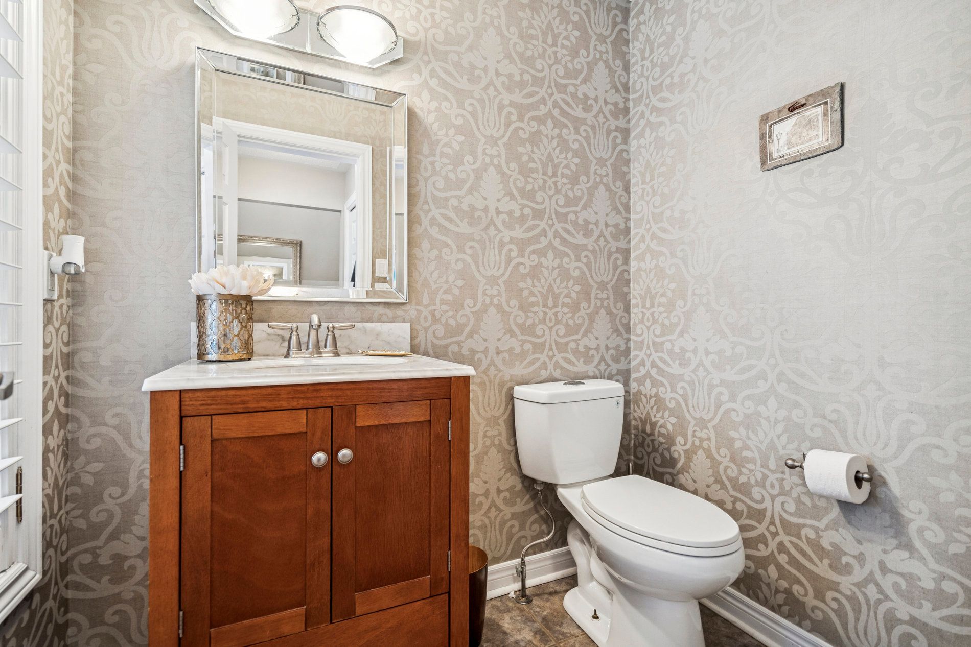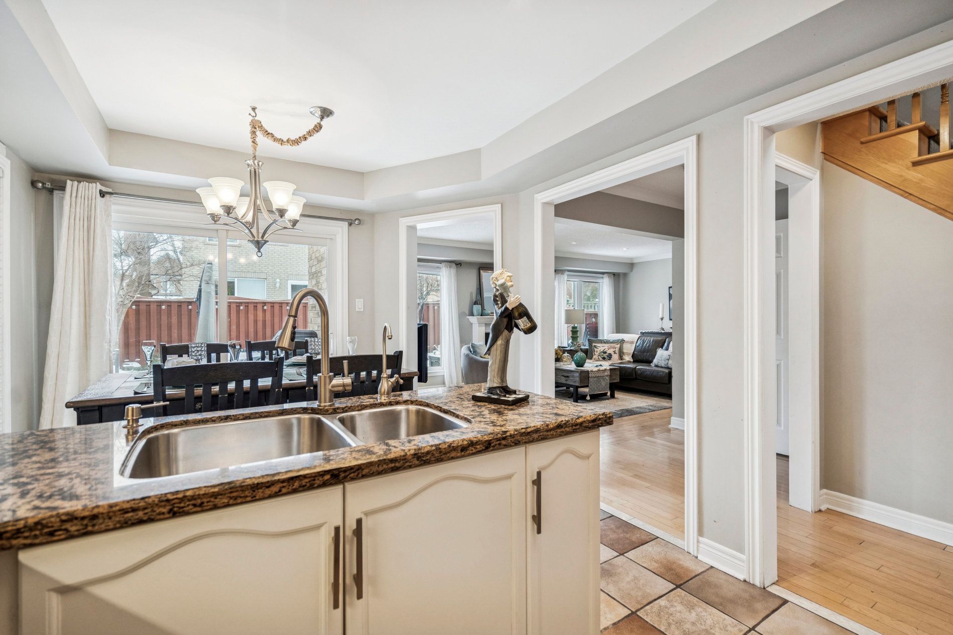 This beautifully maintained detached home welcomes you with a soaring cathedral ceiling entrance that immediately impresses. The main floor features a bright, open-concept living and dining room perfect for entertaining, flowing seamlessly into a large eat-in kitchen. The gourmet kitchen boasts marble countertops, gas stove, a breakfast bar, stainless steel appliances, ample cabinetry, and plenty of space for family meals. Hardwood floors run throughout the main and upper levels, complemented by ceramic tiles in wet areas, crown moulding, california shutters, and updated lighting. Upstairs, you'll find three generously sized bedrooms, including a primary suite with a walk-in closet and 4-piece ensuite bathroom. A second 4-piece family bathroom serves the additional bedrooms. The fully finished basement significantly expands the living space, offering a recreation room, a 2-piece bathroom, and rough-in plumbing ready for a kitchen or wet bar-ideal for an in-law suite, home office, gym, or entertainment area. The exterior showcases a fully redone stamped concrete driveway, front porch, and backyard patio, creating impressive curb appeal and a low-maintenance outdoor oasis. A convenient gas bbq hookup is included for effortless summer entertaining. Additional highlights include a attached garage, newer windows, and roof. Located in the highly desirable west oak trails neighbourhood of oakville, this home is steps from top-rated schools (including west oak trails public school and garth webb secondary), parks, sixteen mile creek trails, shopping, the new oakville trafalgar memorial hospital, and major highways (qew, 403, 407). Commuters enjoy quick access to the bronte go station and a 30-minute drive to downtown toronto. West oak trails remains one of oakville's most sought-after communities for its blend of natural beauty, convenience, and strong sense of community.