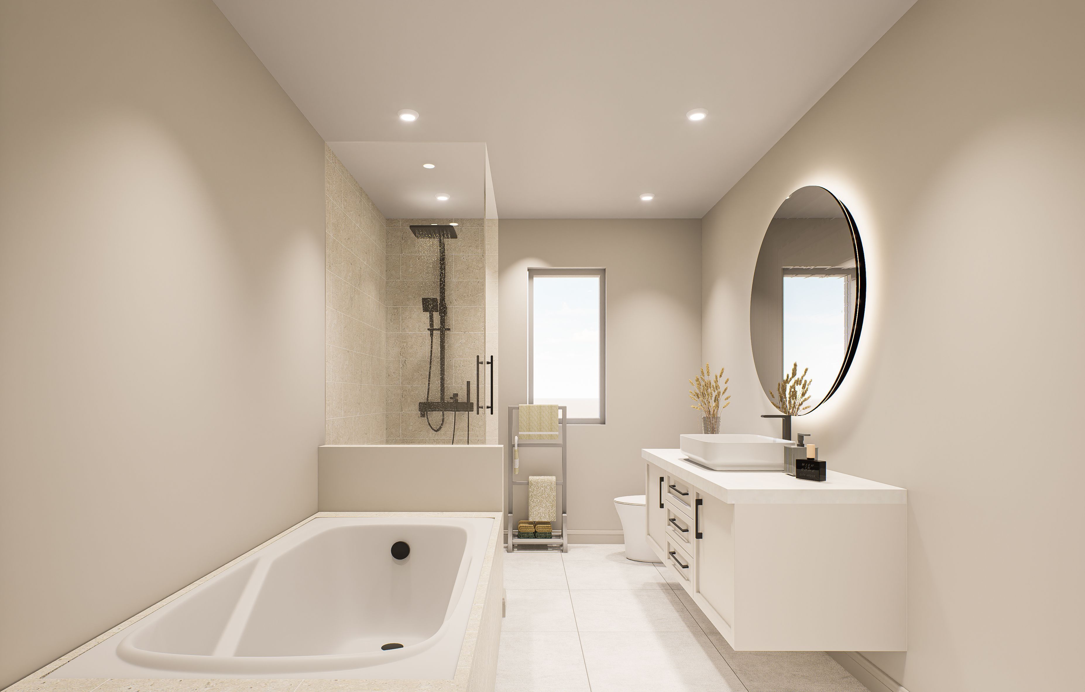 • Elegant main bathroom with a freestanding tub and glass shower.