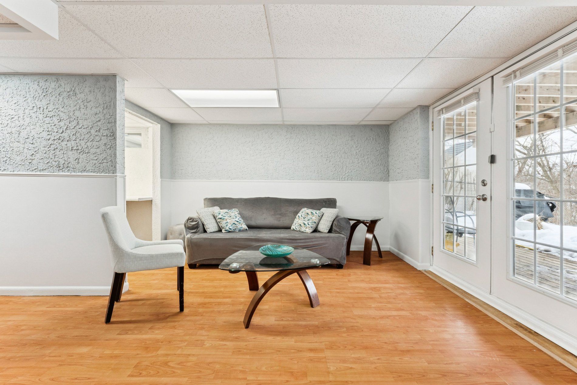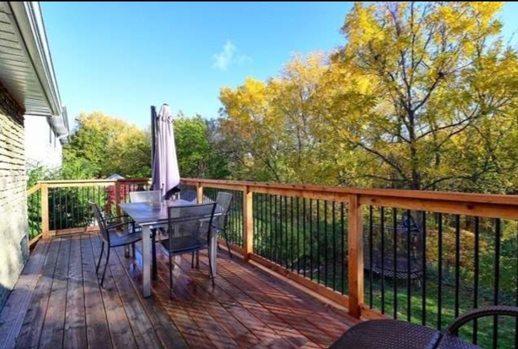 • Finished walkout basement with a deck overlooking lush greenery.