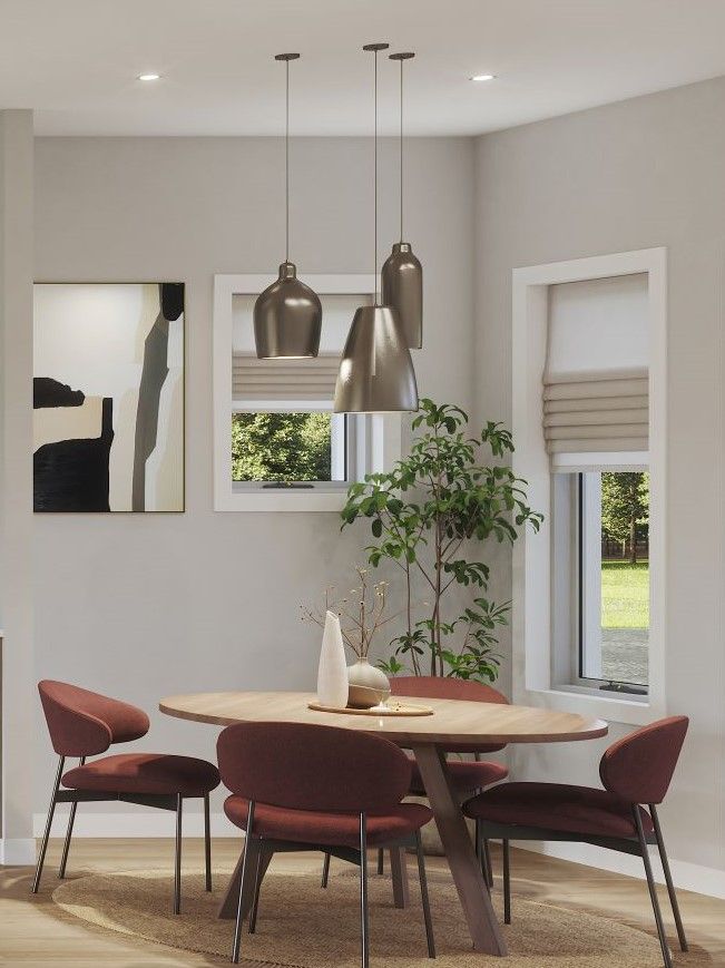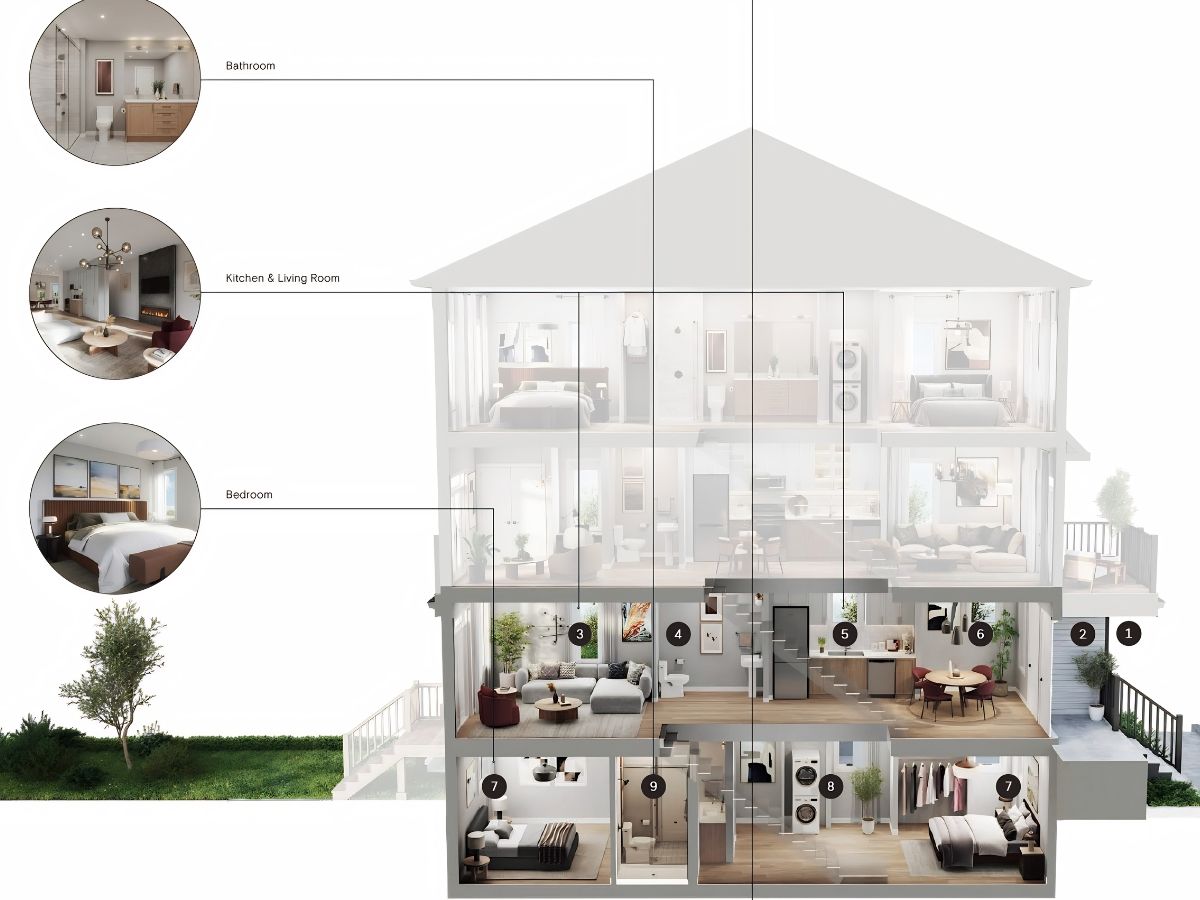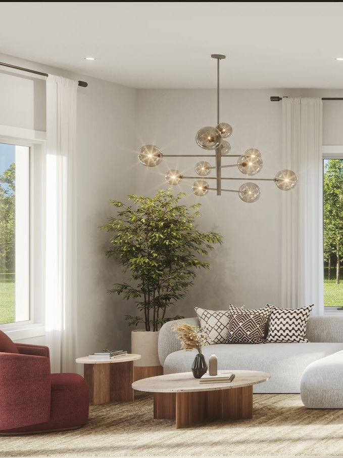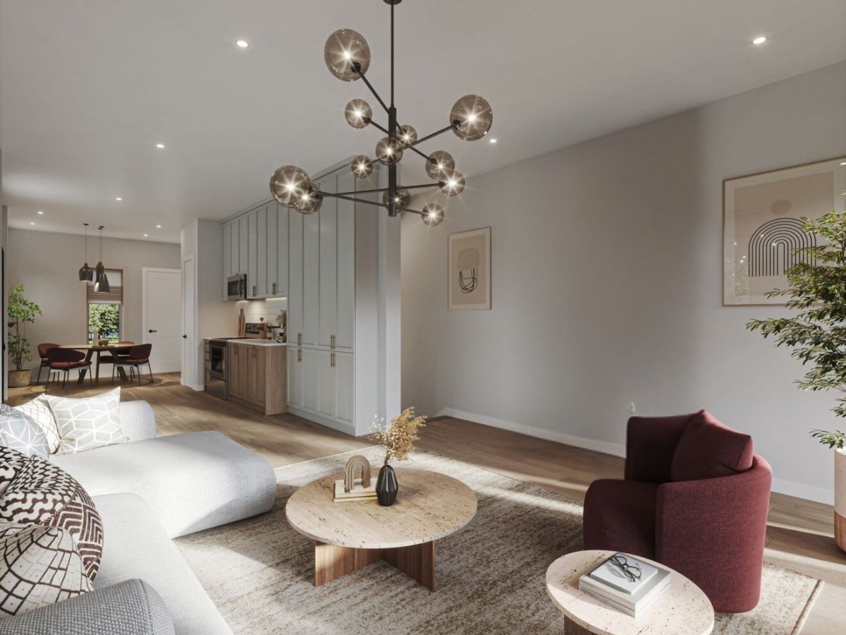 • Bright open-concept living area with kitchen, dining, and living spaces.