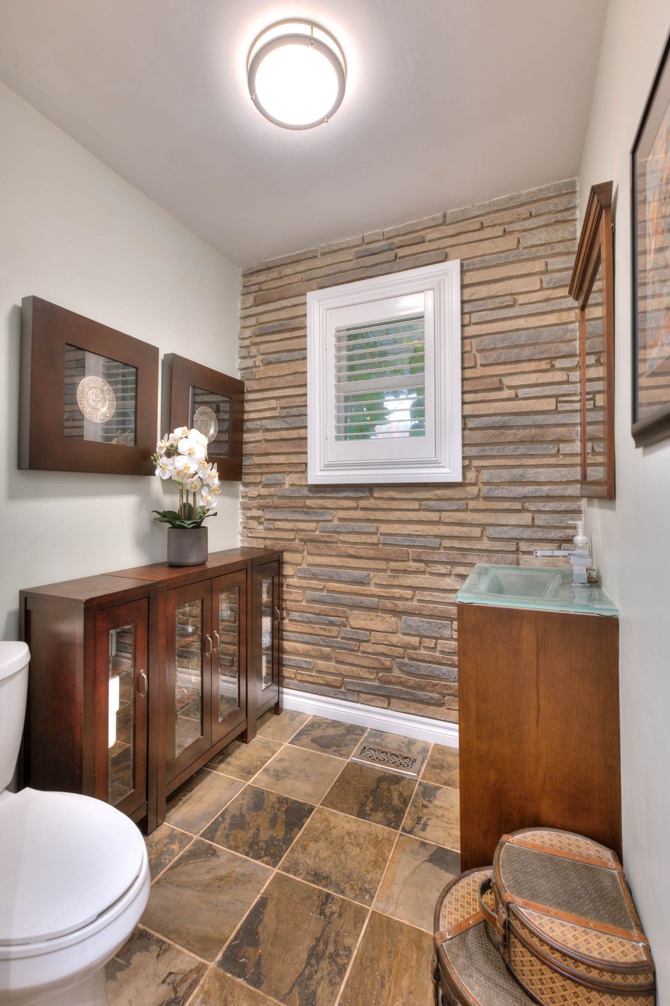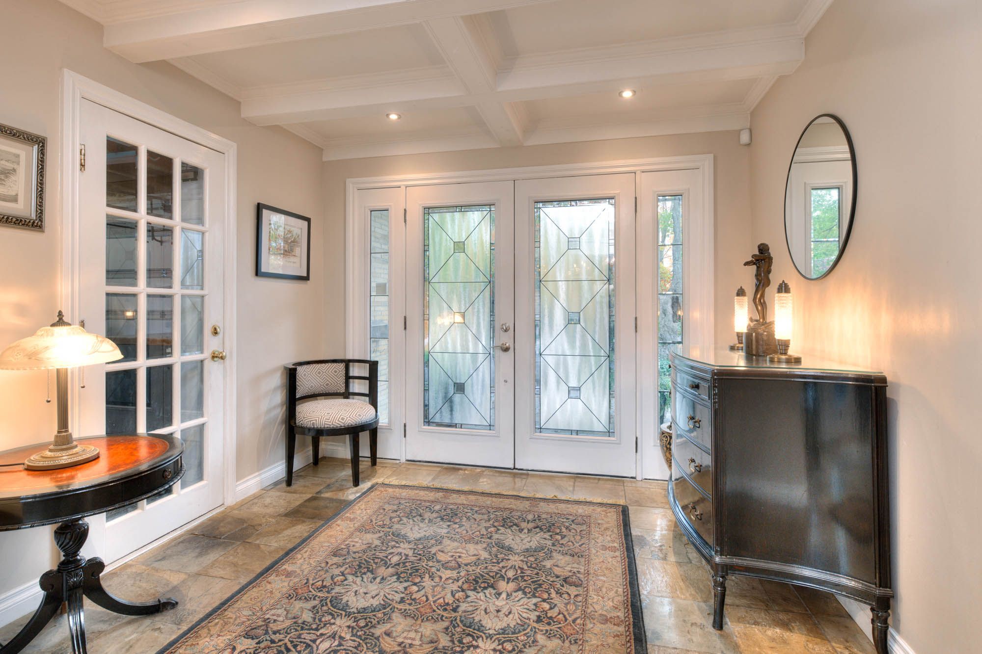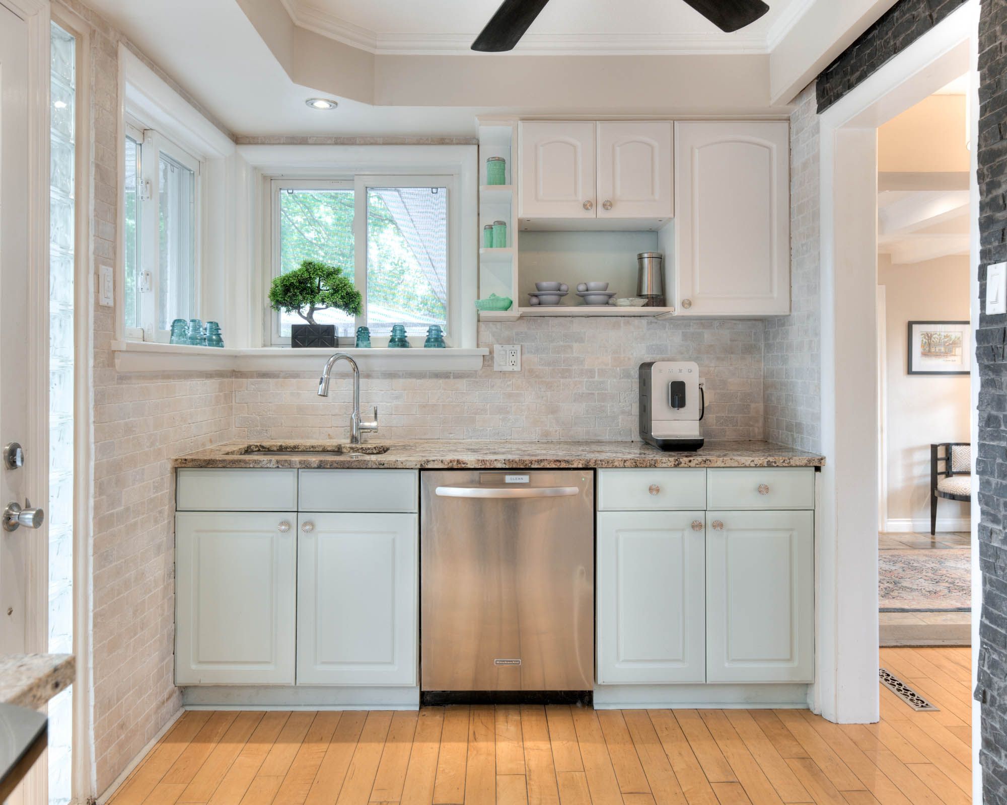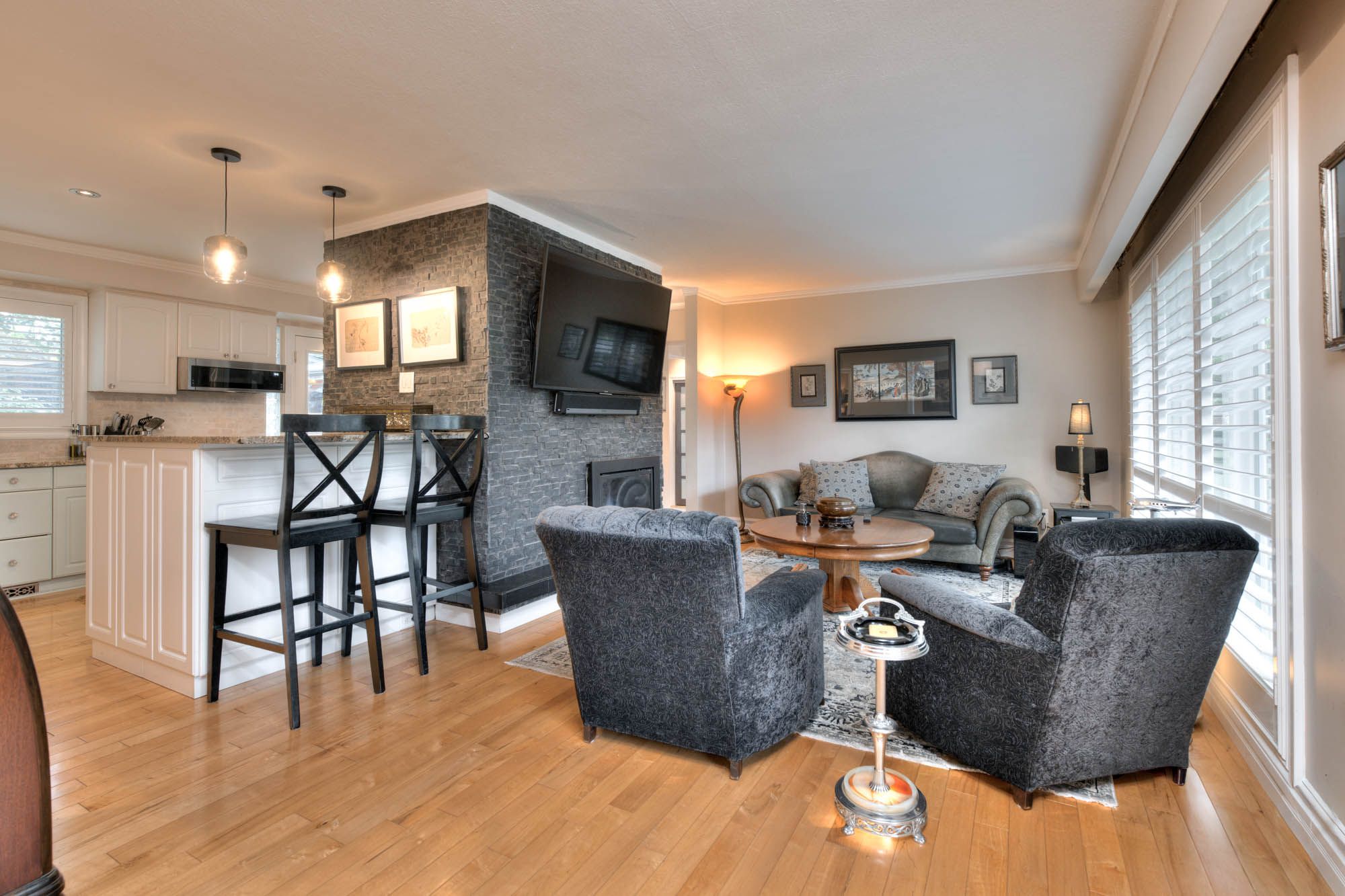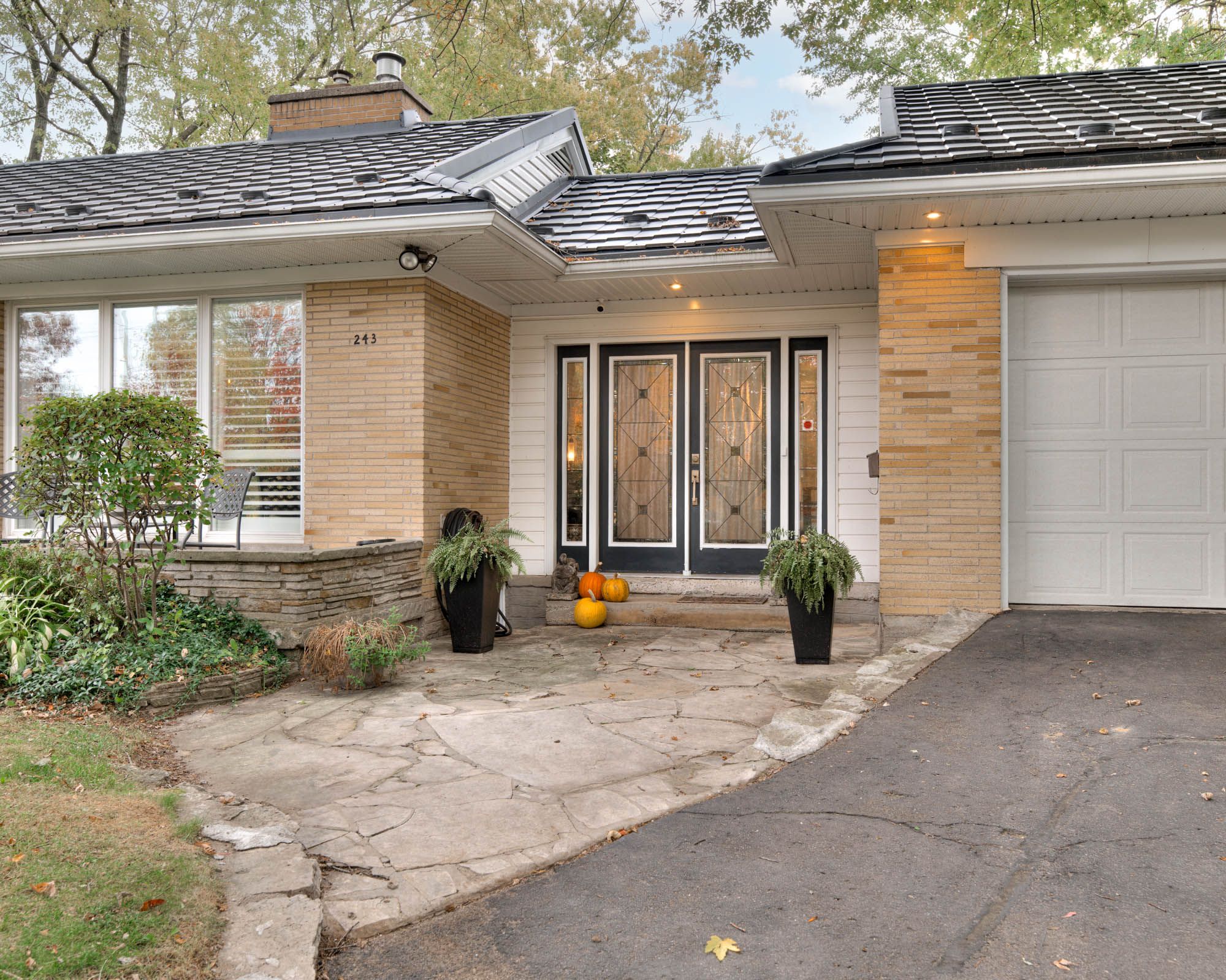 Perfect in every season, this stylish bungalow on a . 40-acre lot embodies mid-century modern charm. Professionally landscaped the backyard feels like a secluded private country retreat, yet in the heart of the city. The outdoor space is designed for entertaining, with newer fencing, a three-tier deck, and two expansive granite patios on off the foyer and one off the walkout basement. From the steel roof with leaf guards to the landscape lighting and the gas line for the bbq, every detail has been carefully considered. The grand foyer showcases a coffered ceiling and provides easy access to both the garage and the yard. Quality is evident throughout the bright home, with 3 gas fireplaces, smart-lighting, stone and hardwood flooring, crown moldings, and california shutters. The upgraded kitchen boasts tumbled marble, classic white and antique green cabinetry, stainless steel appliances, and a built-in bar-height peninsula for an ideal workstation. The dining area features a dry bar with matching stone countertops and built-ins. The primary suite is complete with a gas fireplace, a walkout to the 12 x 12 composite deck, dual closets, and a spa-inspired ensuite. This 5 piece bathroom hosts the fully customized walk-in closet, a large glass shower, a standalone soaker tub, and an exposed angel stone wall. A second bedroom and a guest powder room complete the upper level. The walkout basement offers over 900 square feet of beautifully finished living space, including large windows, a gas fireplace, a full bathroom, and a contemporary kitchenette, ideal for extended family. The granite patio from the walkout basement hosts stone retaining walls. The home is protected by a security system and a 50-year warranty on the steel roof. The heated and insulated oversized double garage with workshop space is a dream for hobbyists. This property lets you live as if you've already escaped the city, without ever leaving the comfort of your own home. Only a 15 min walk to uptown.