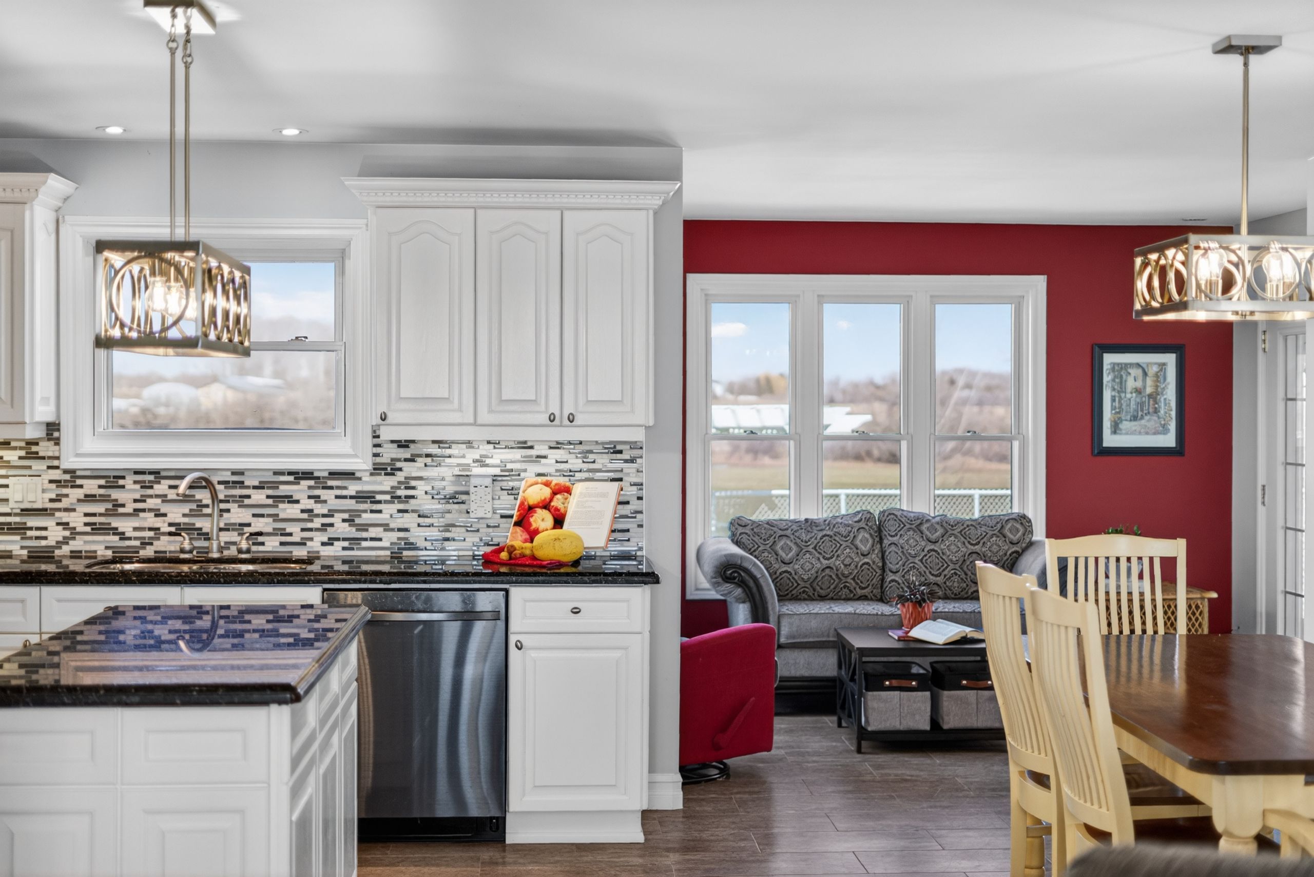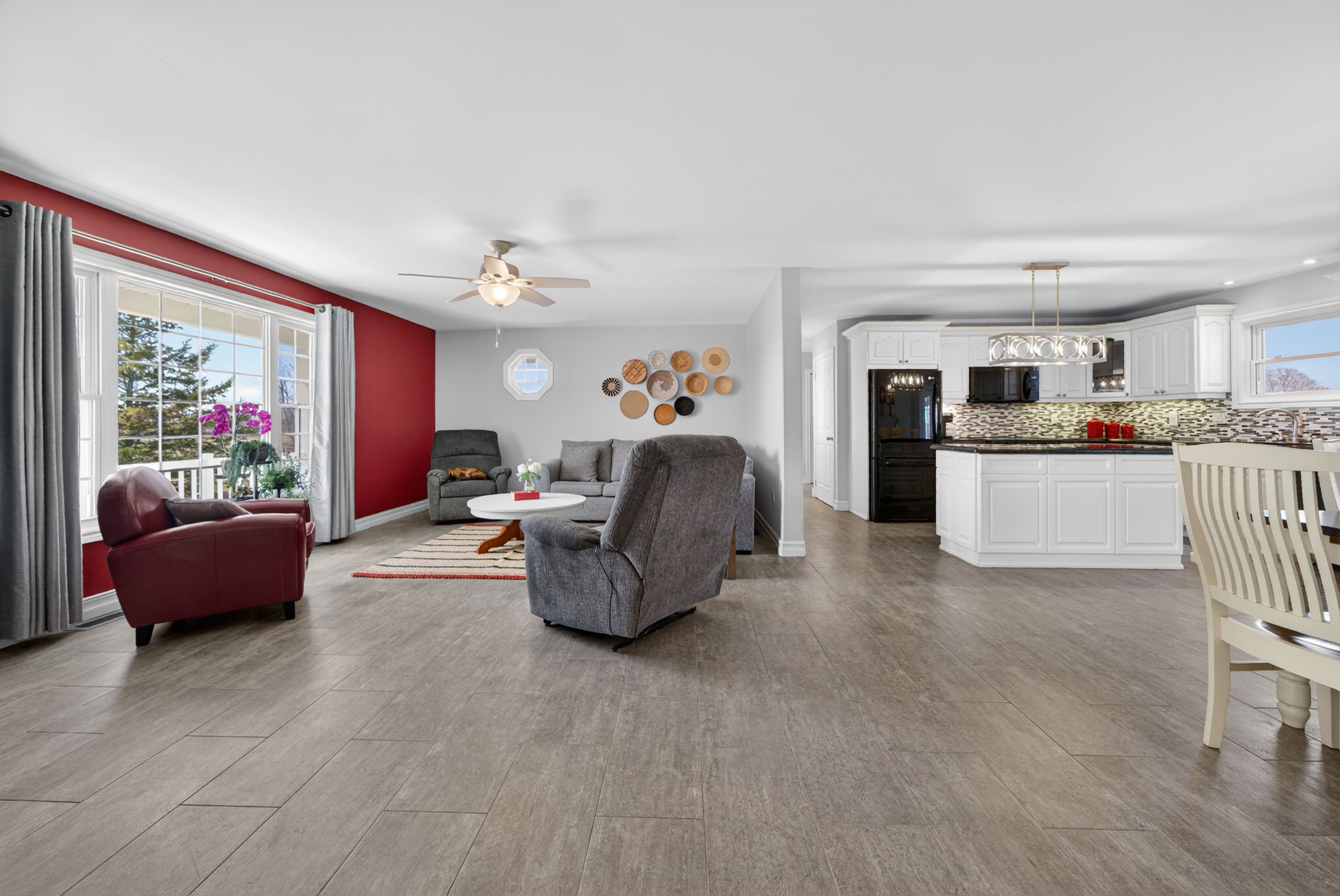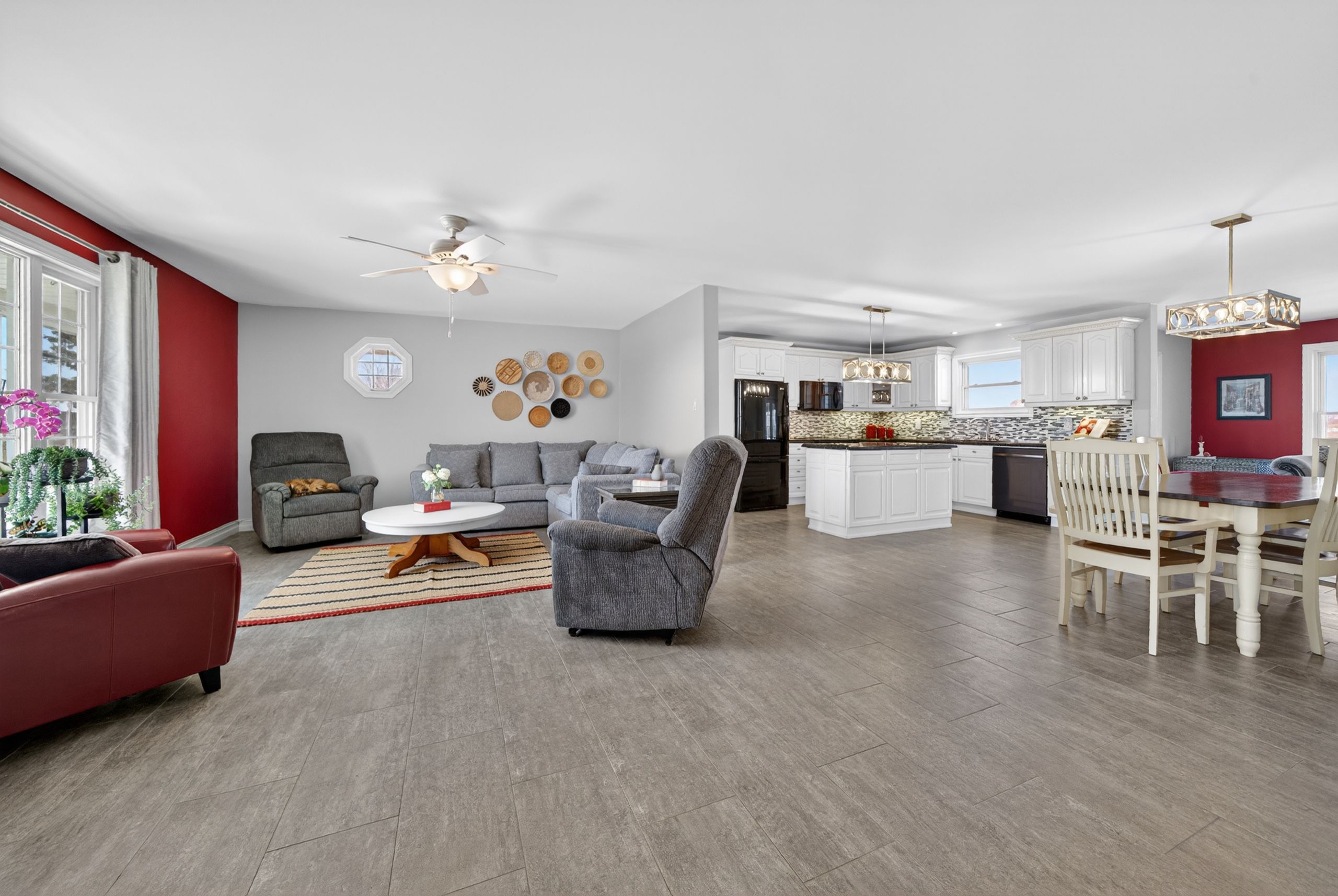 • Open-concept layout with a bright kitchen, dining, and living area.