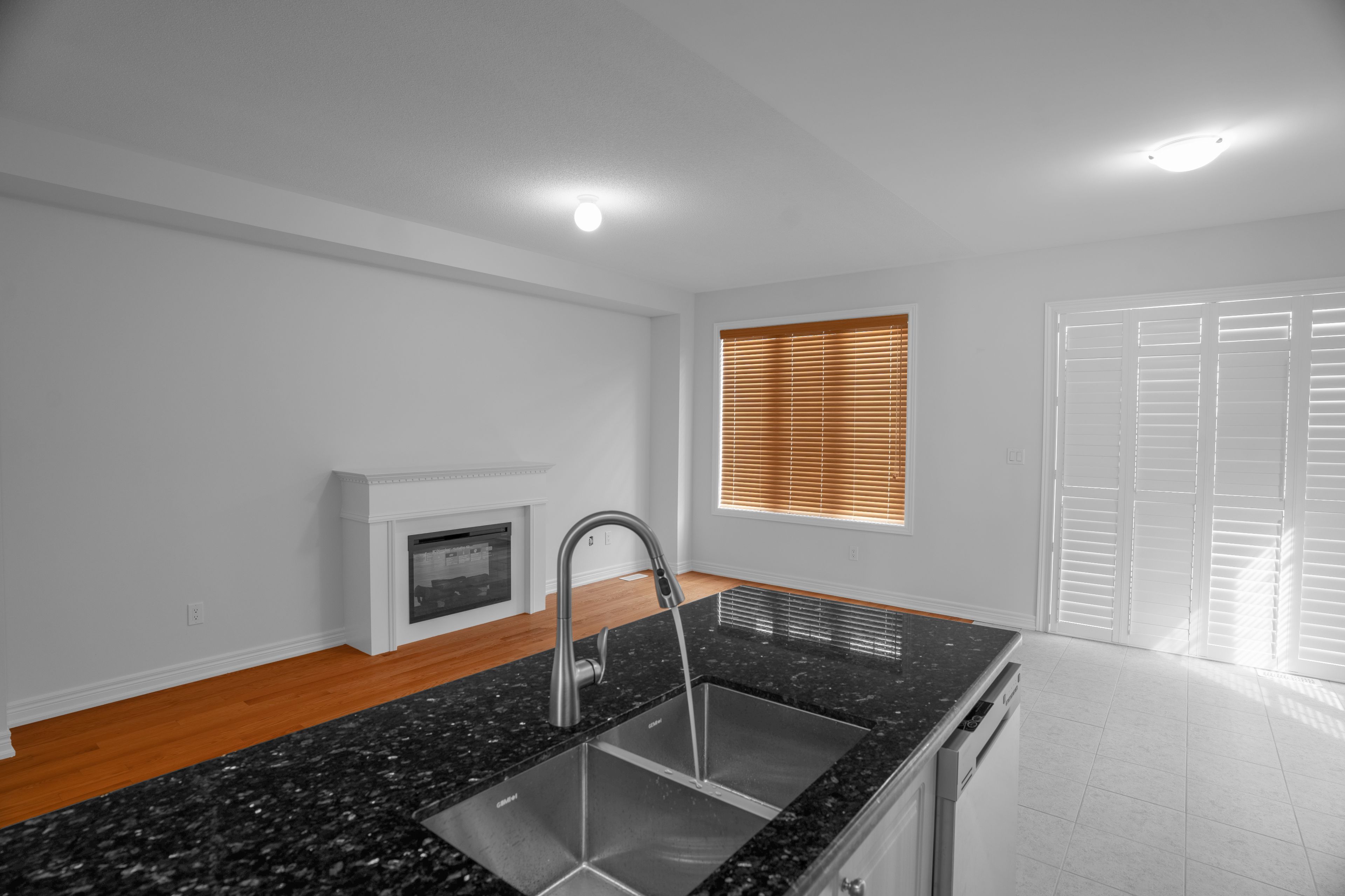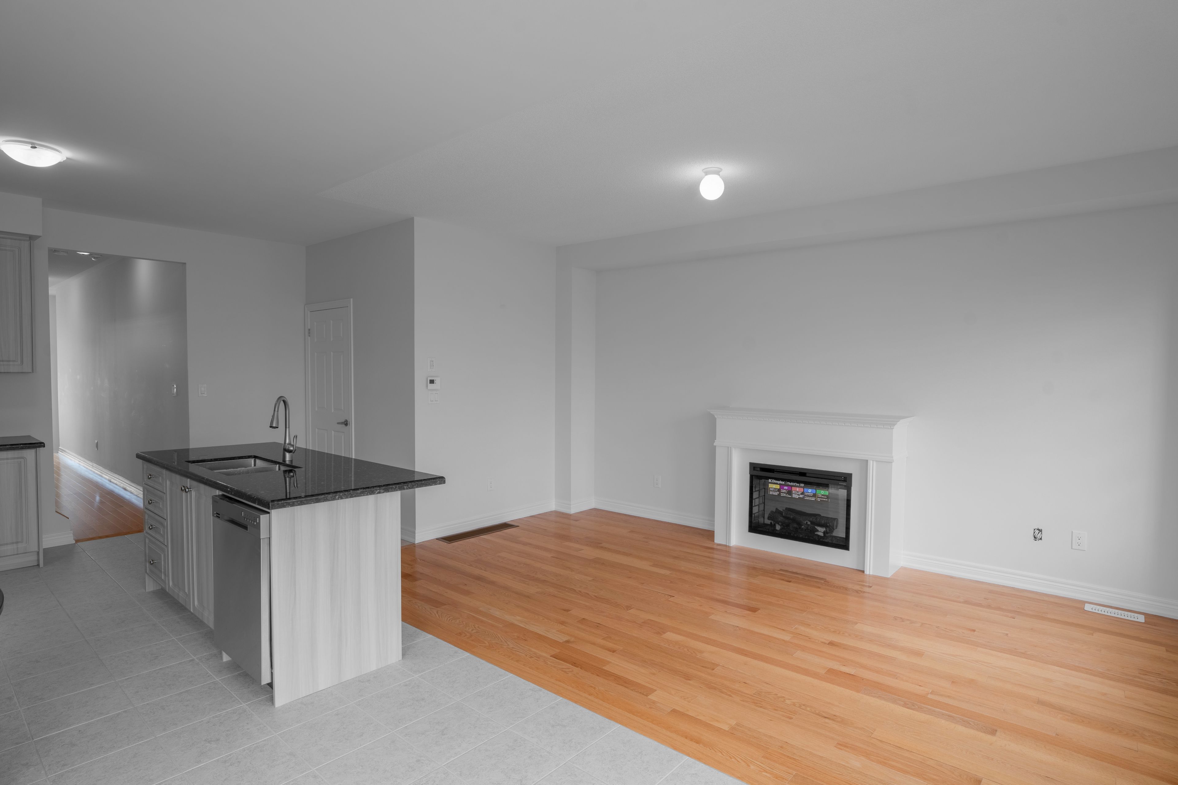 • Open-concept great room and modern kitchen with quartz countertops.