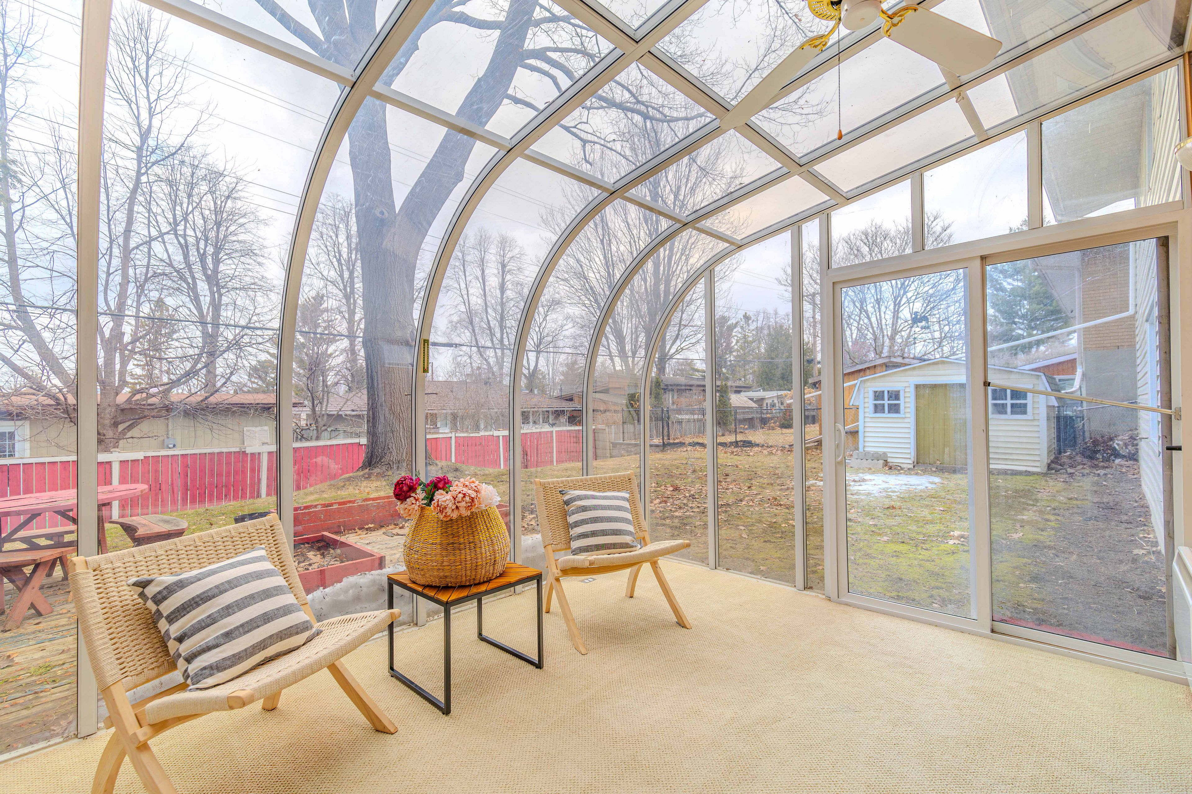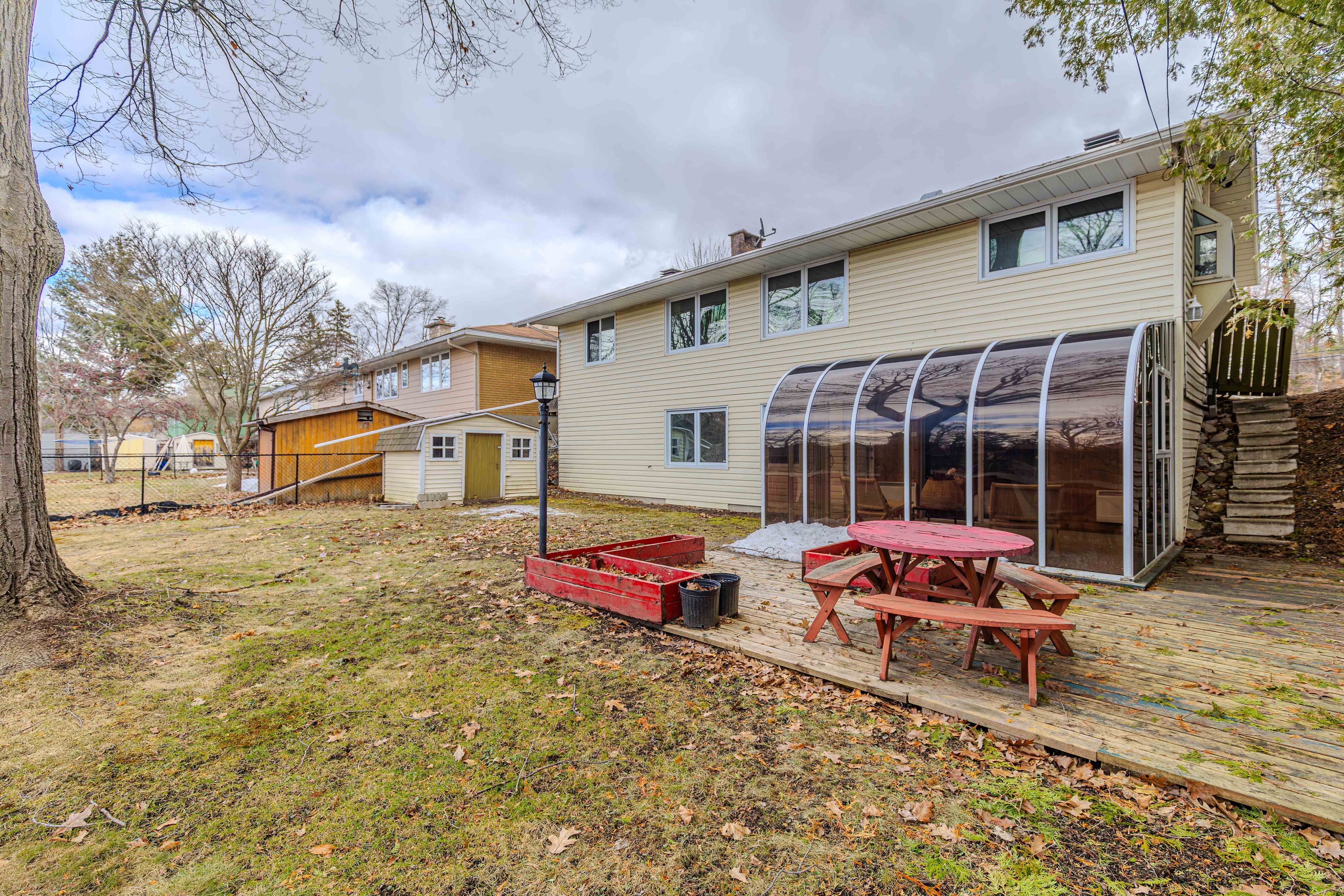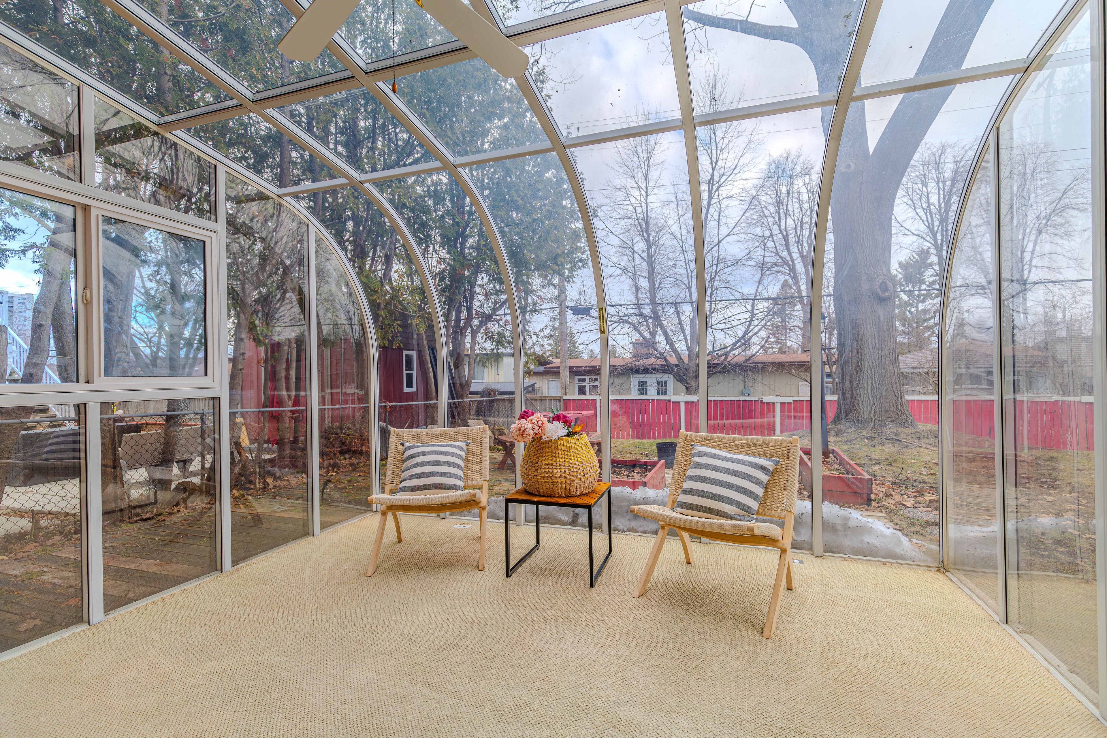 • Beautiful all-season solarium leads to a backyard with a mature red oak tree.