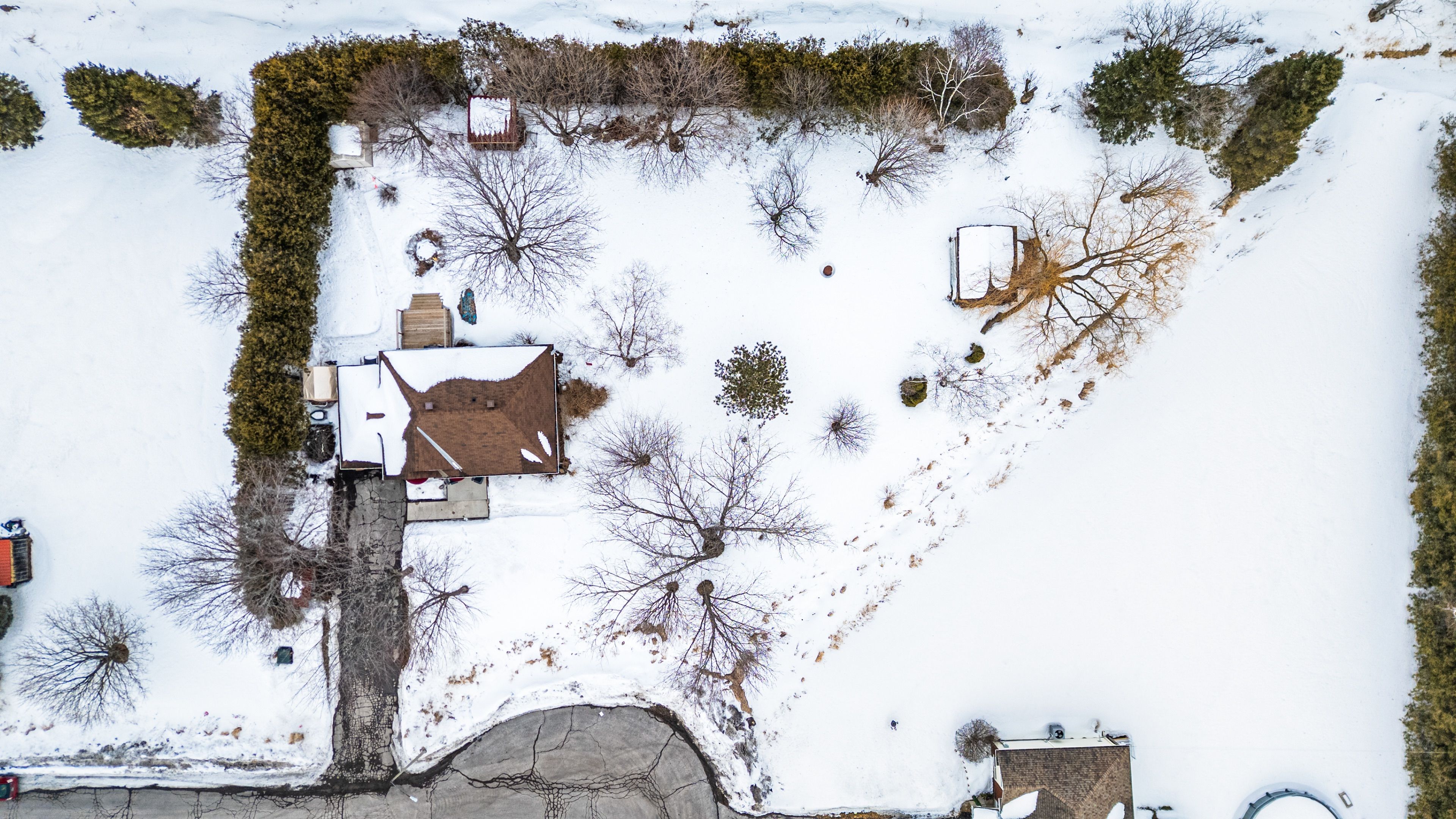 • Serene backyard with a large deck and workshop for hobbies.