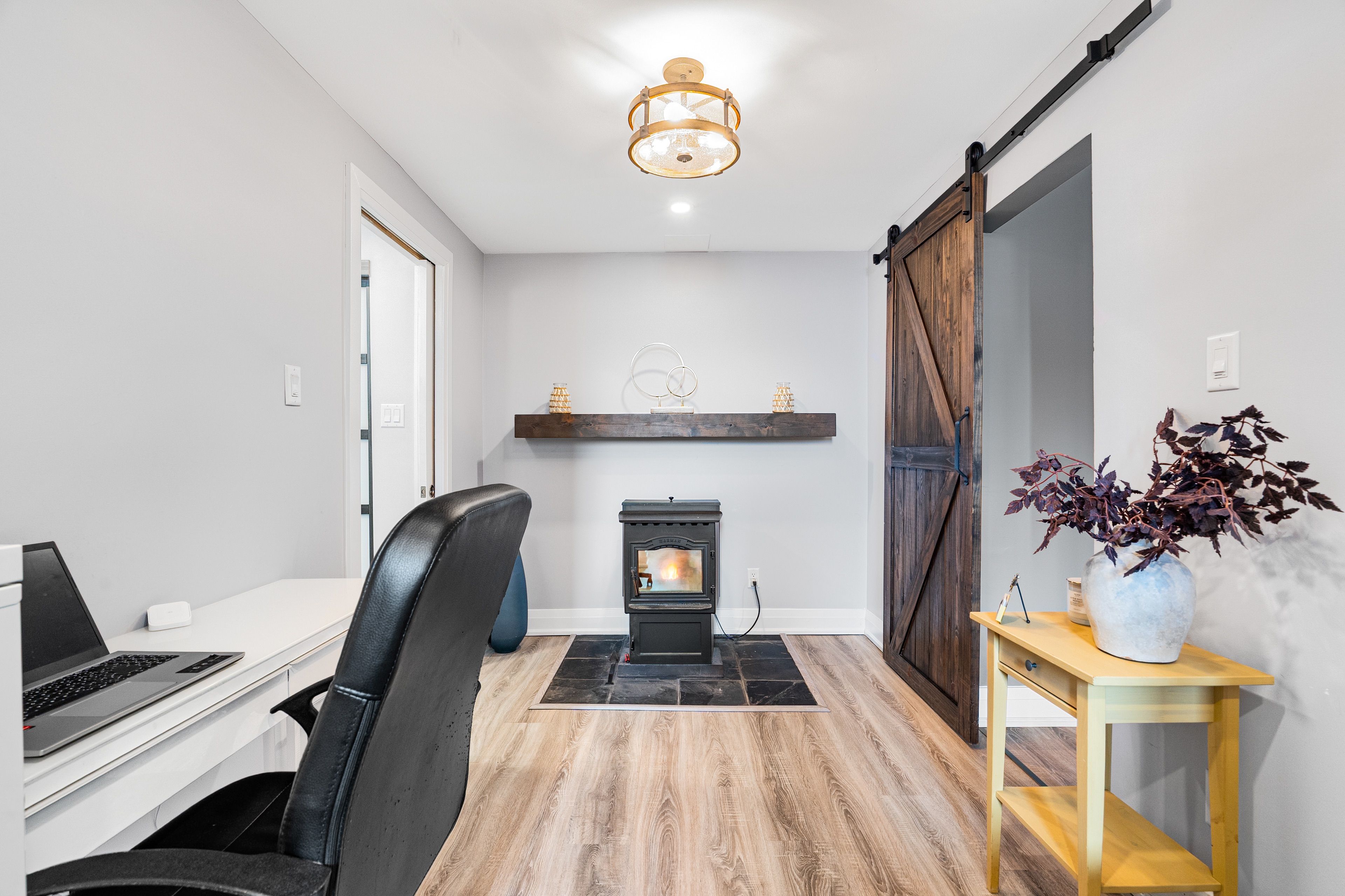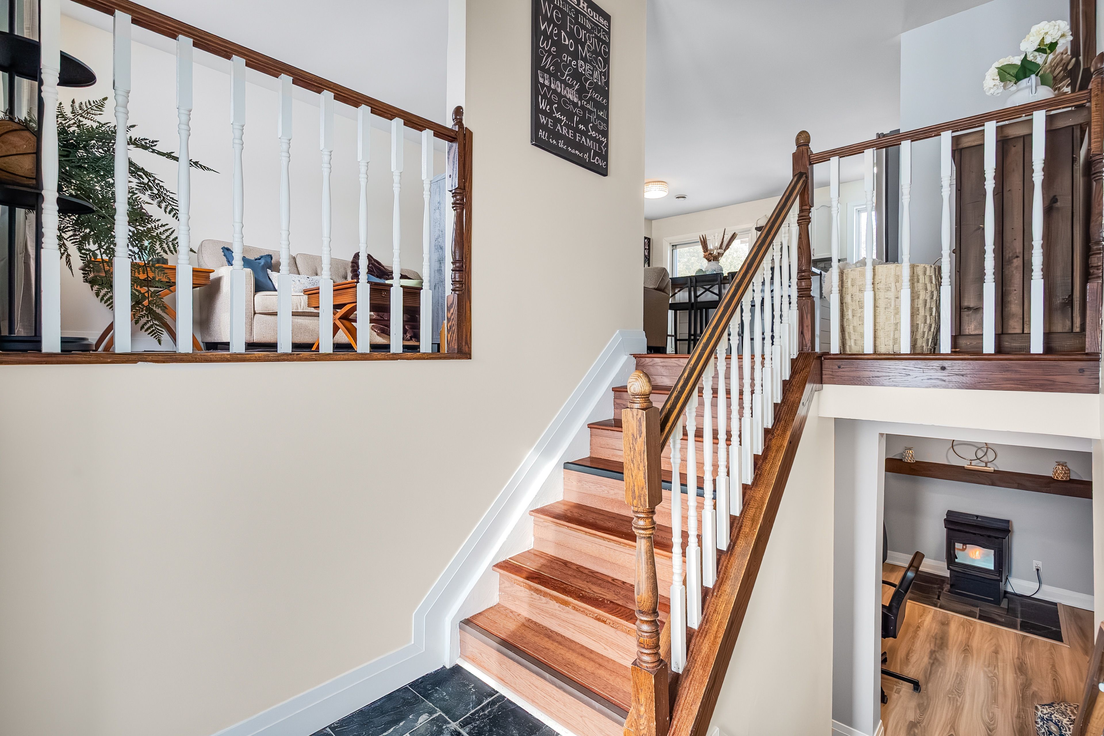 • Finished basement with additional living space, office, and storage.