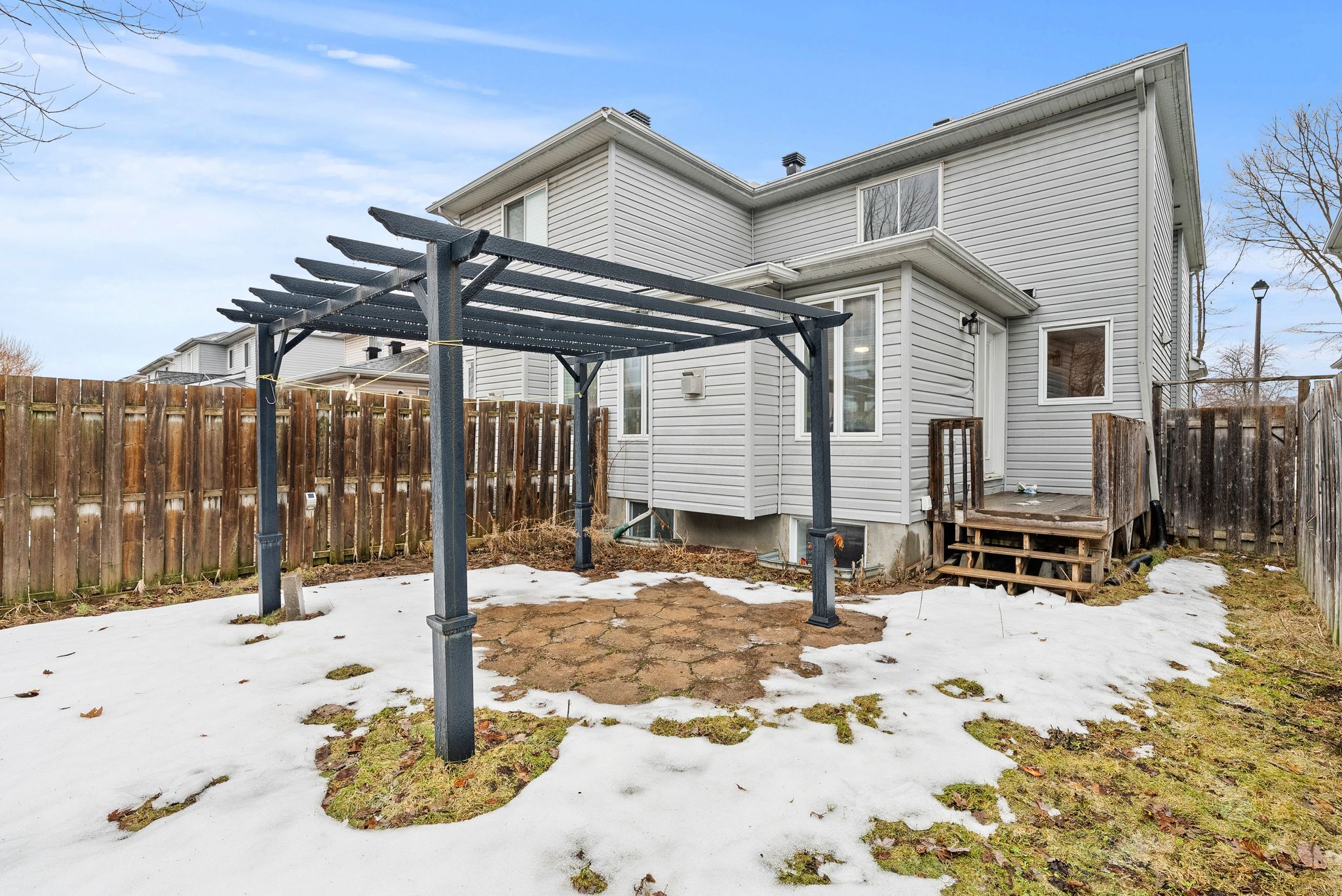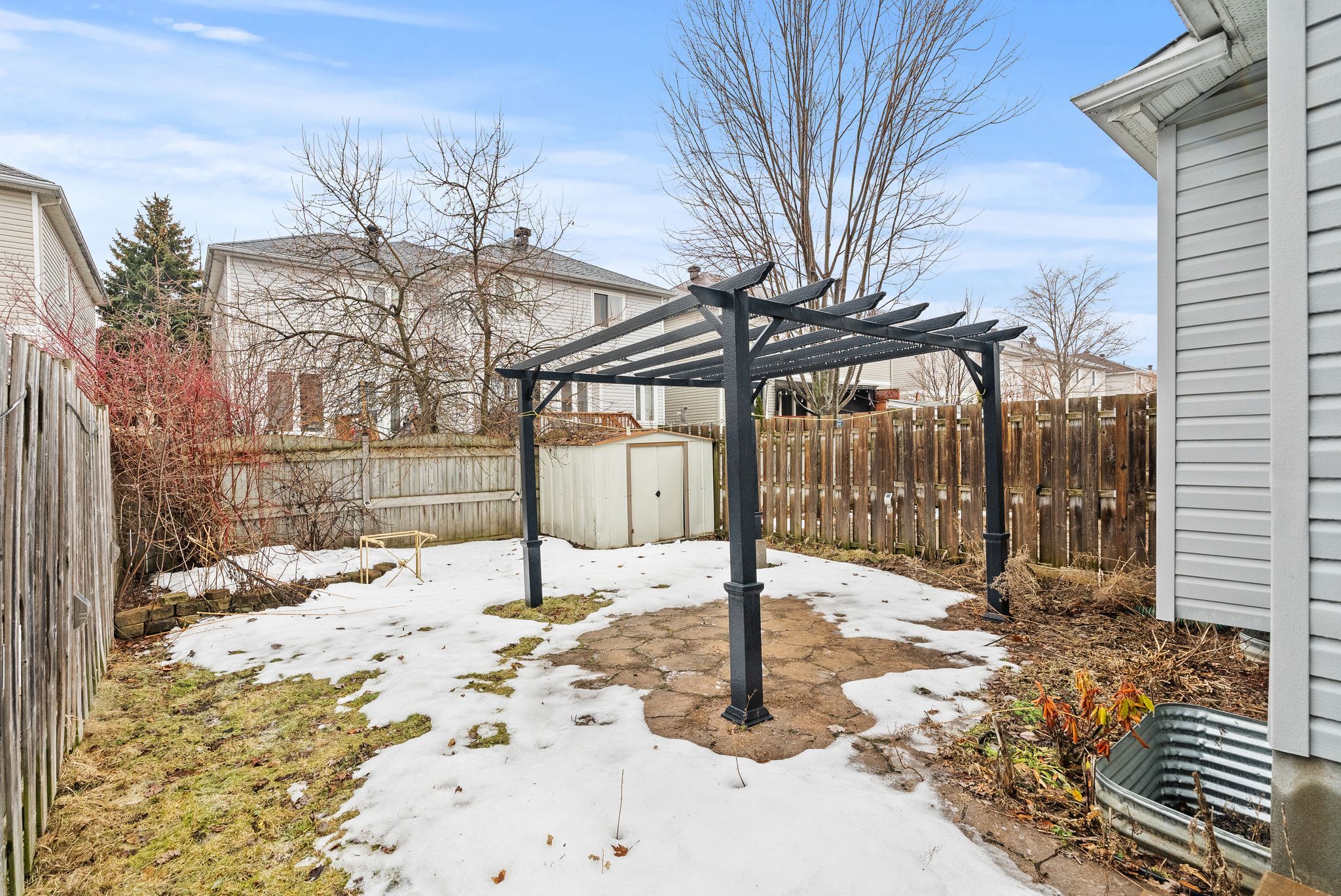 • Sunny backyard retreat with BBQ deck, stone patio, and storage shed.