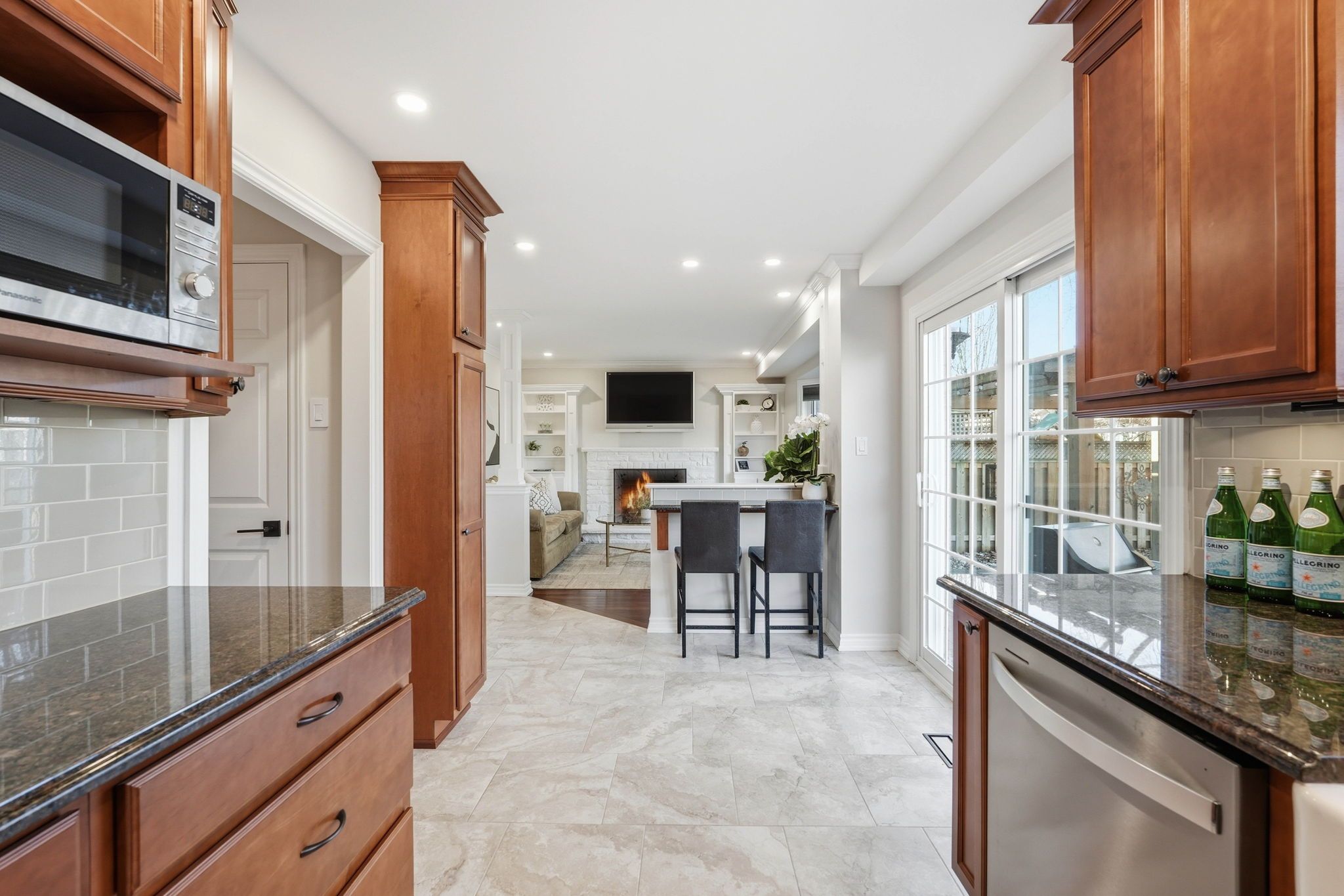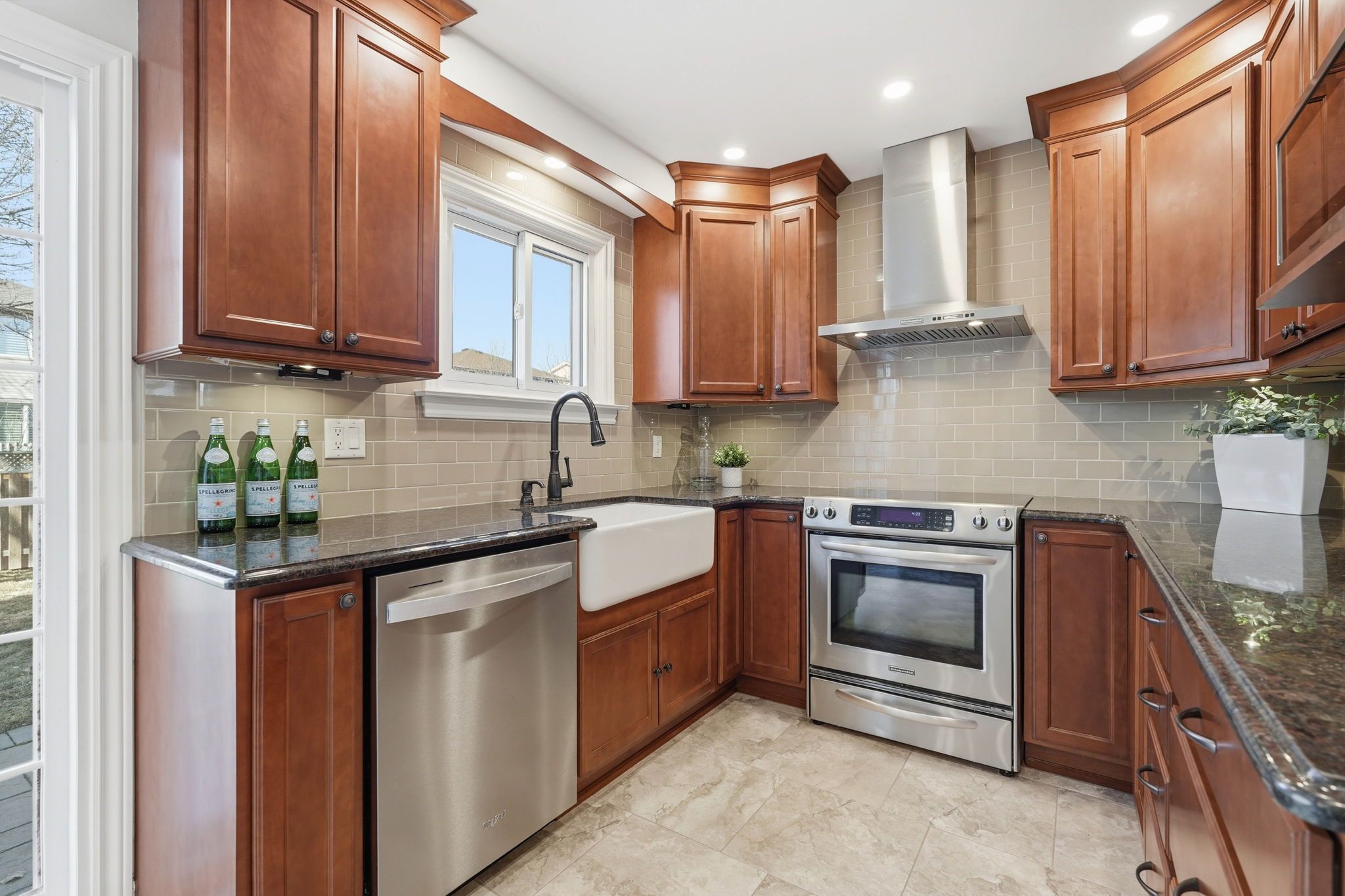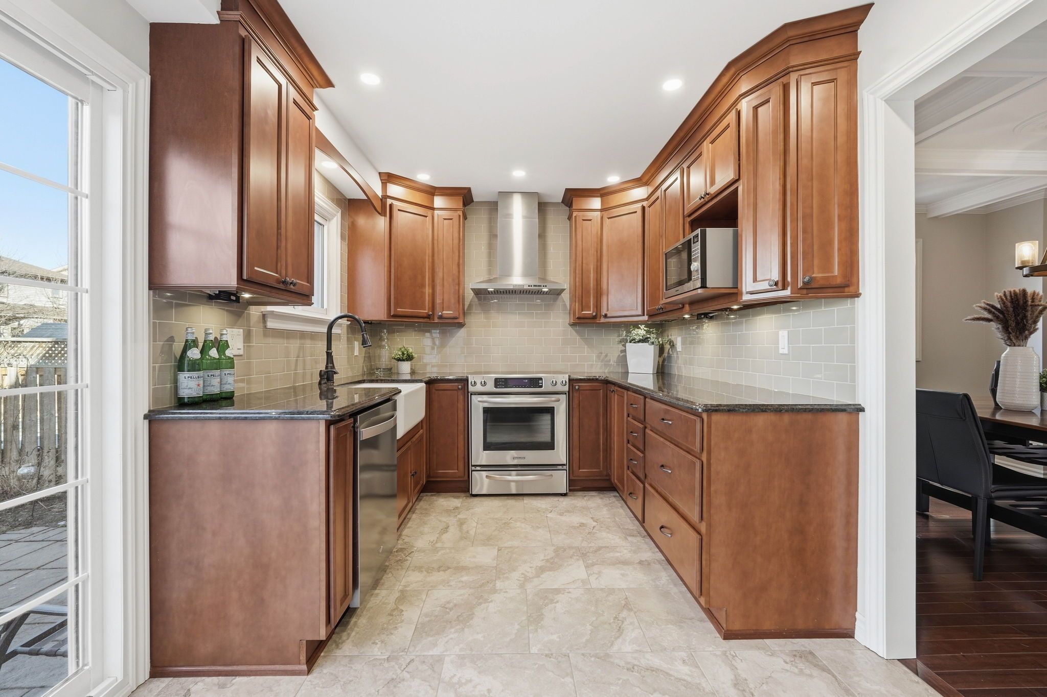• Spacious kitchen with granite surfaces and stainless steel appliances.