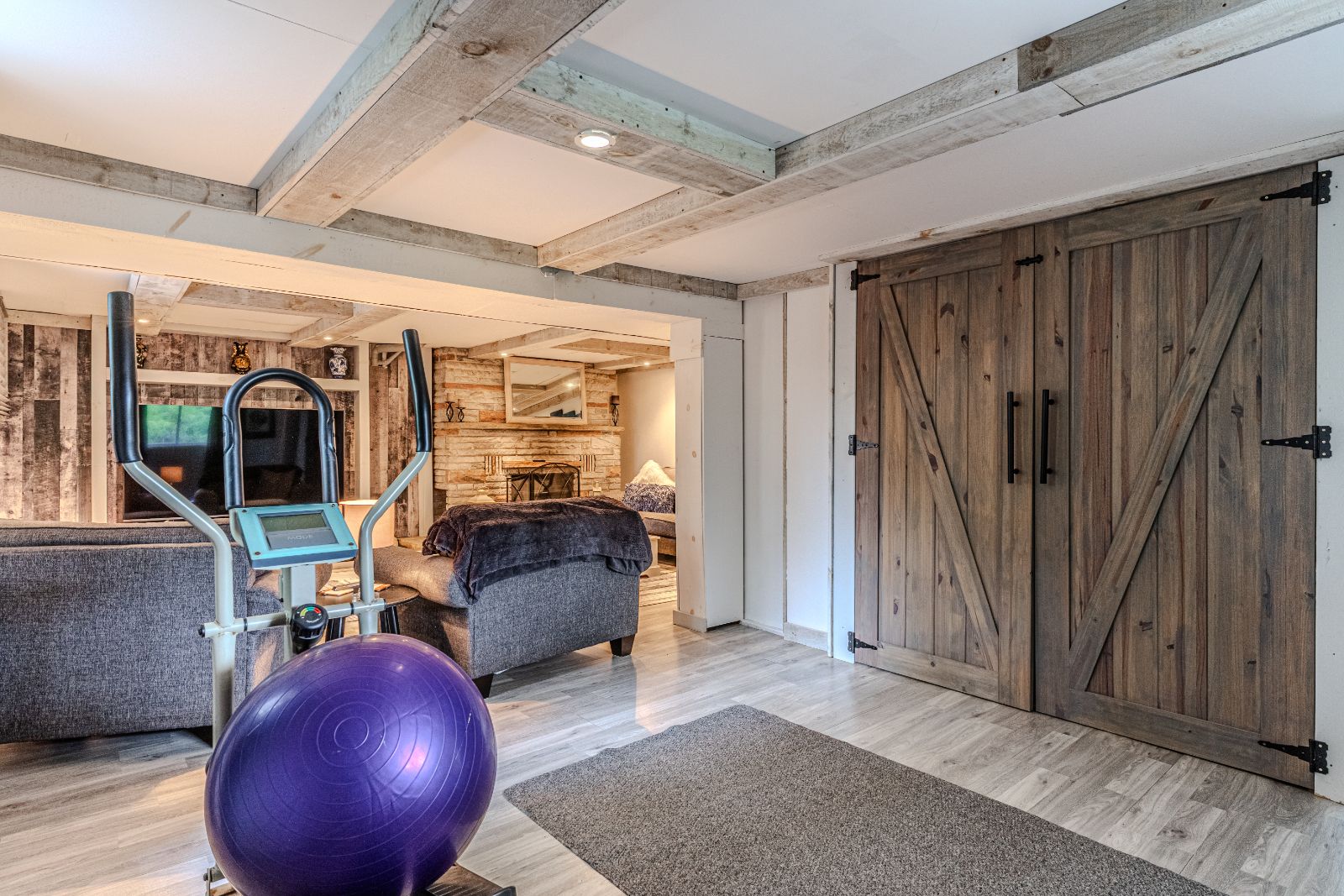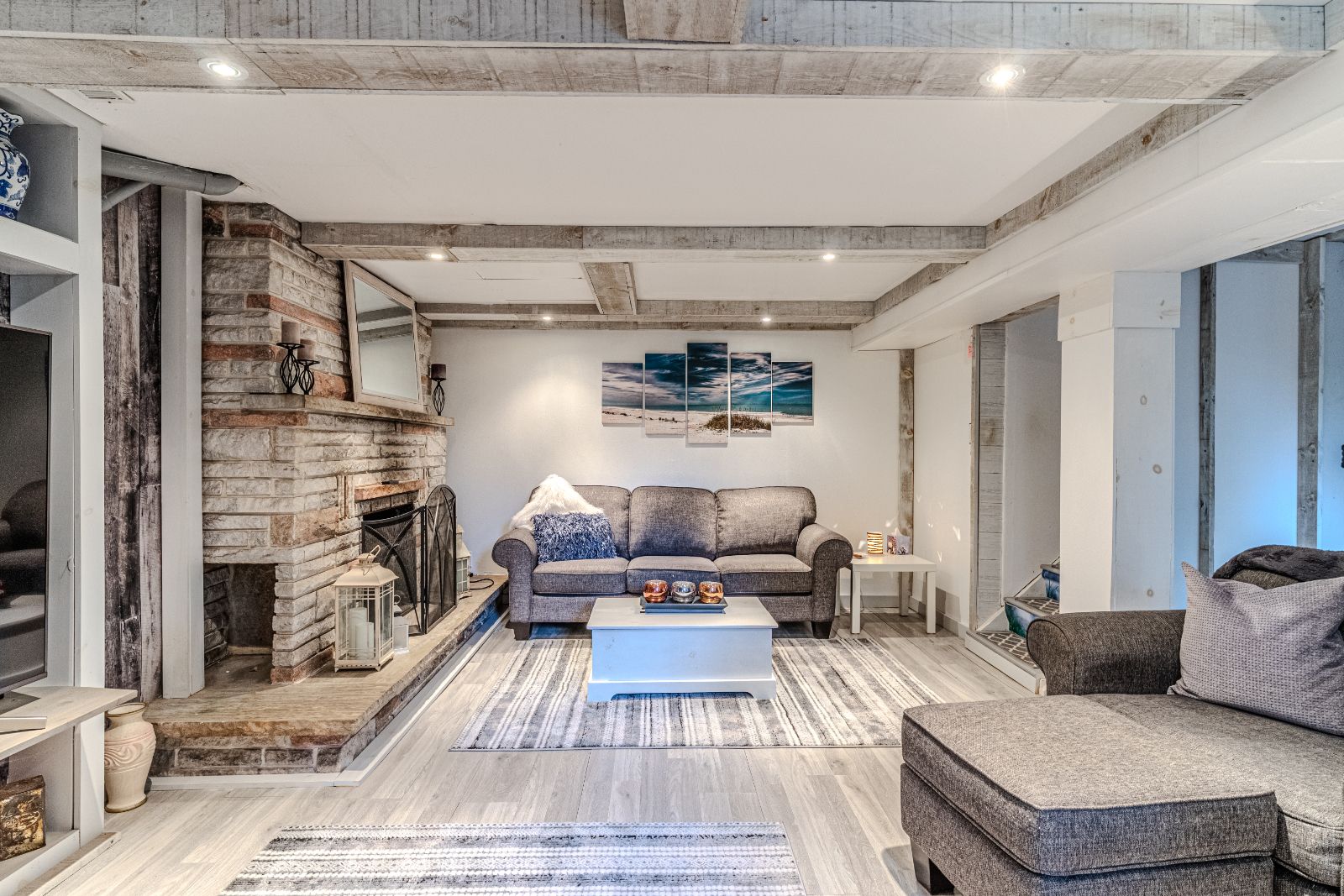 • Light-filled open-concept living area with exposed beams and oversized windows.