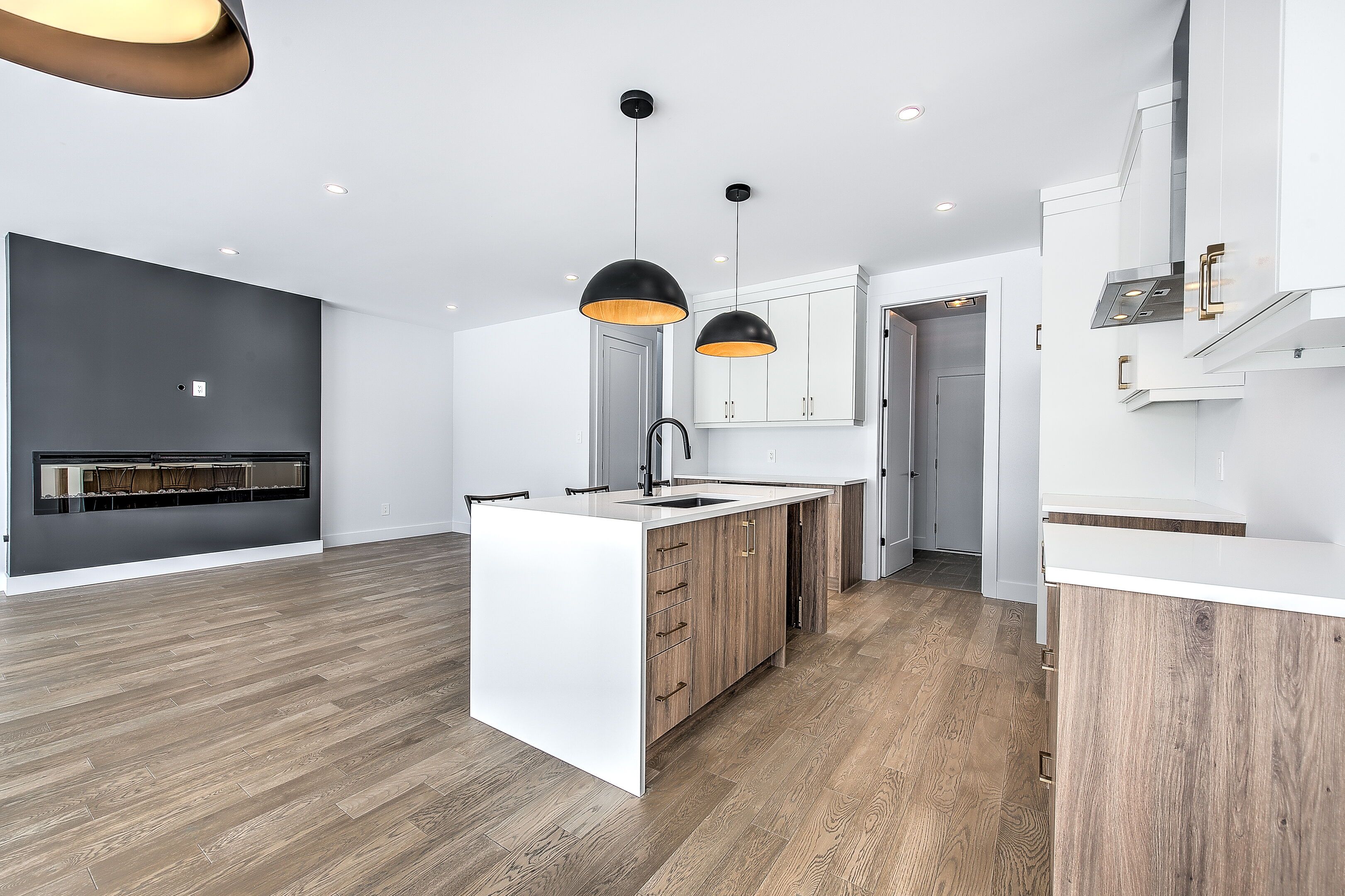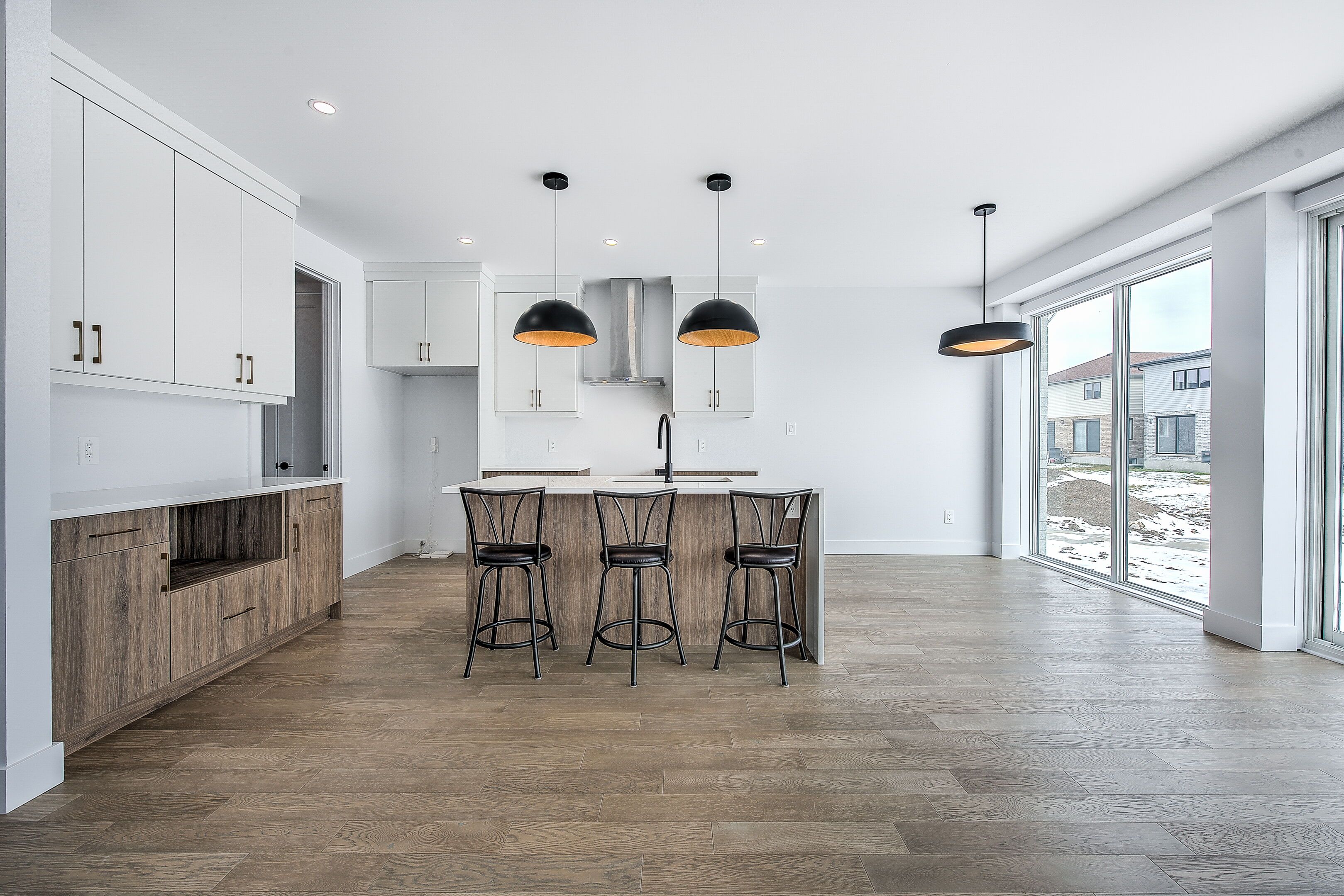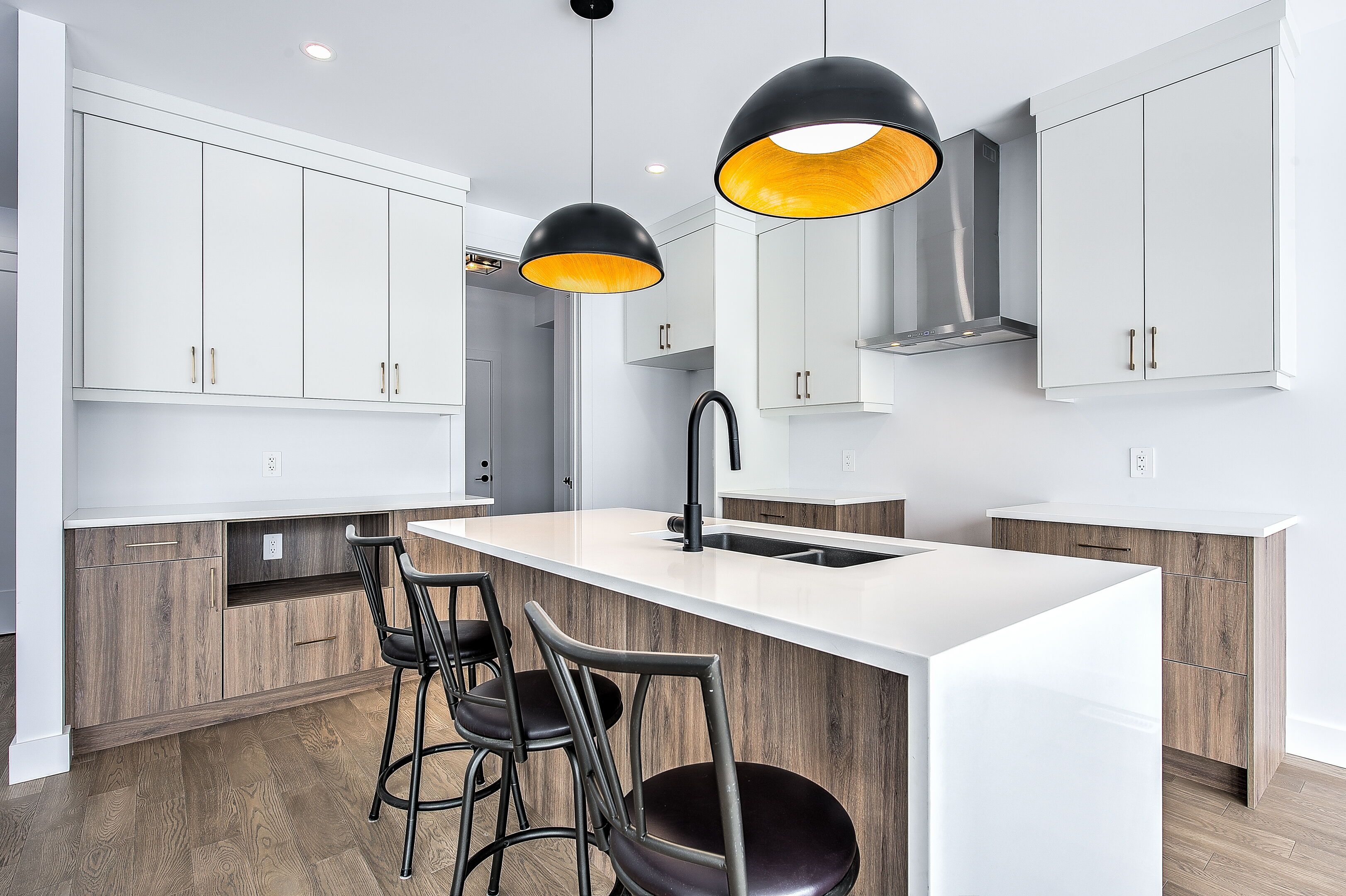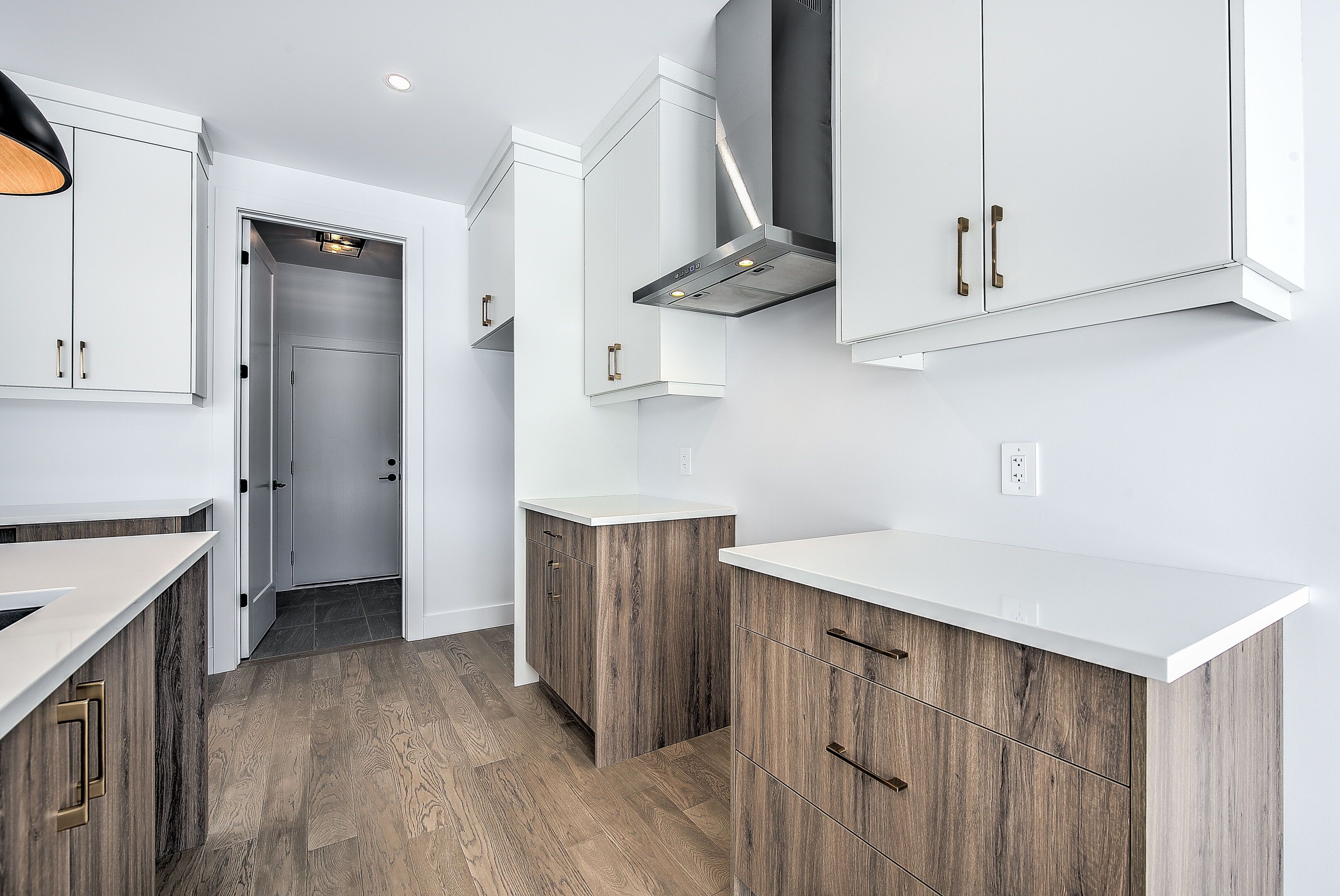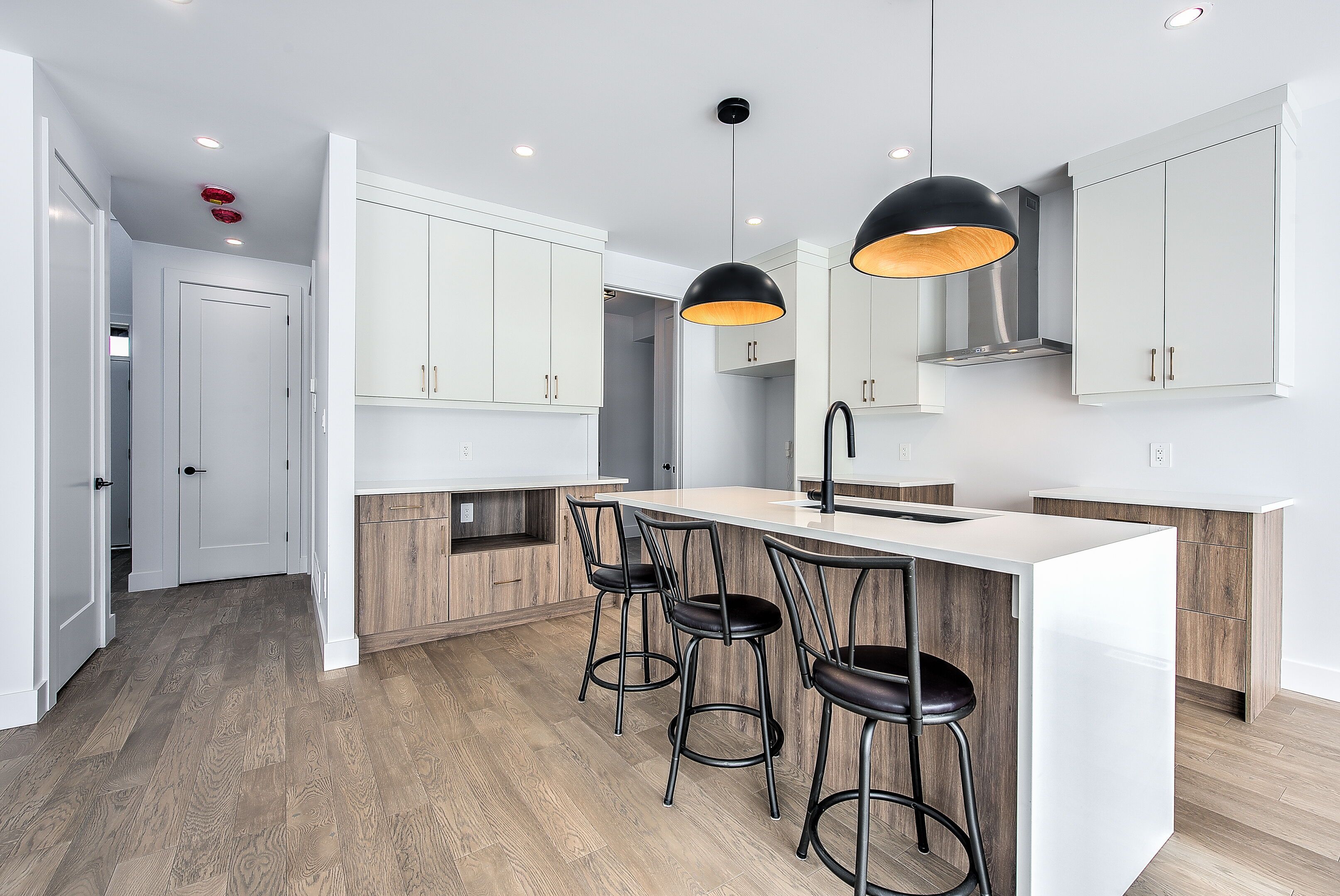 • Modern kitchen with quartz countertops, island, and convenient pantry.