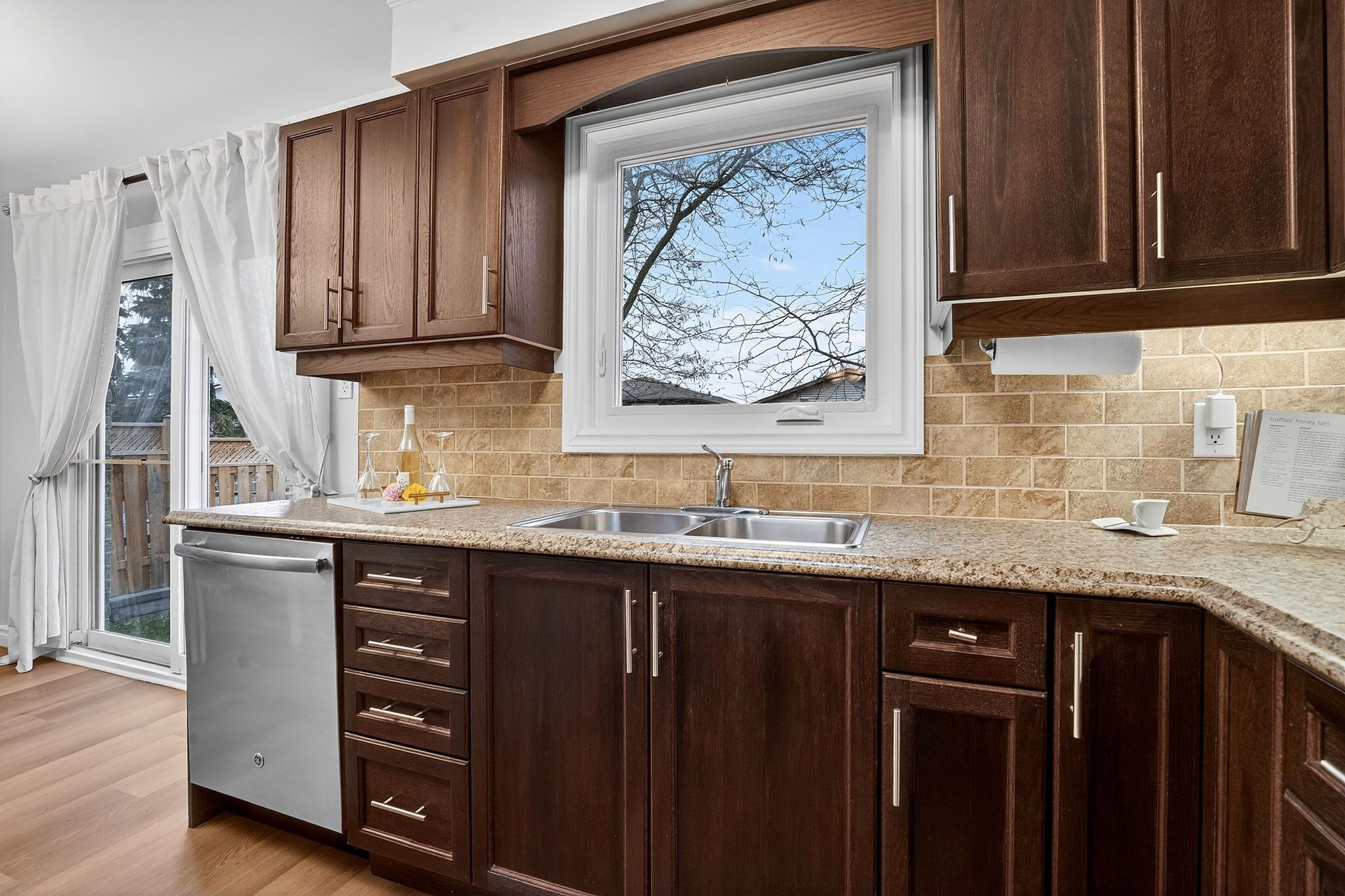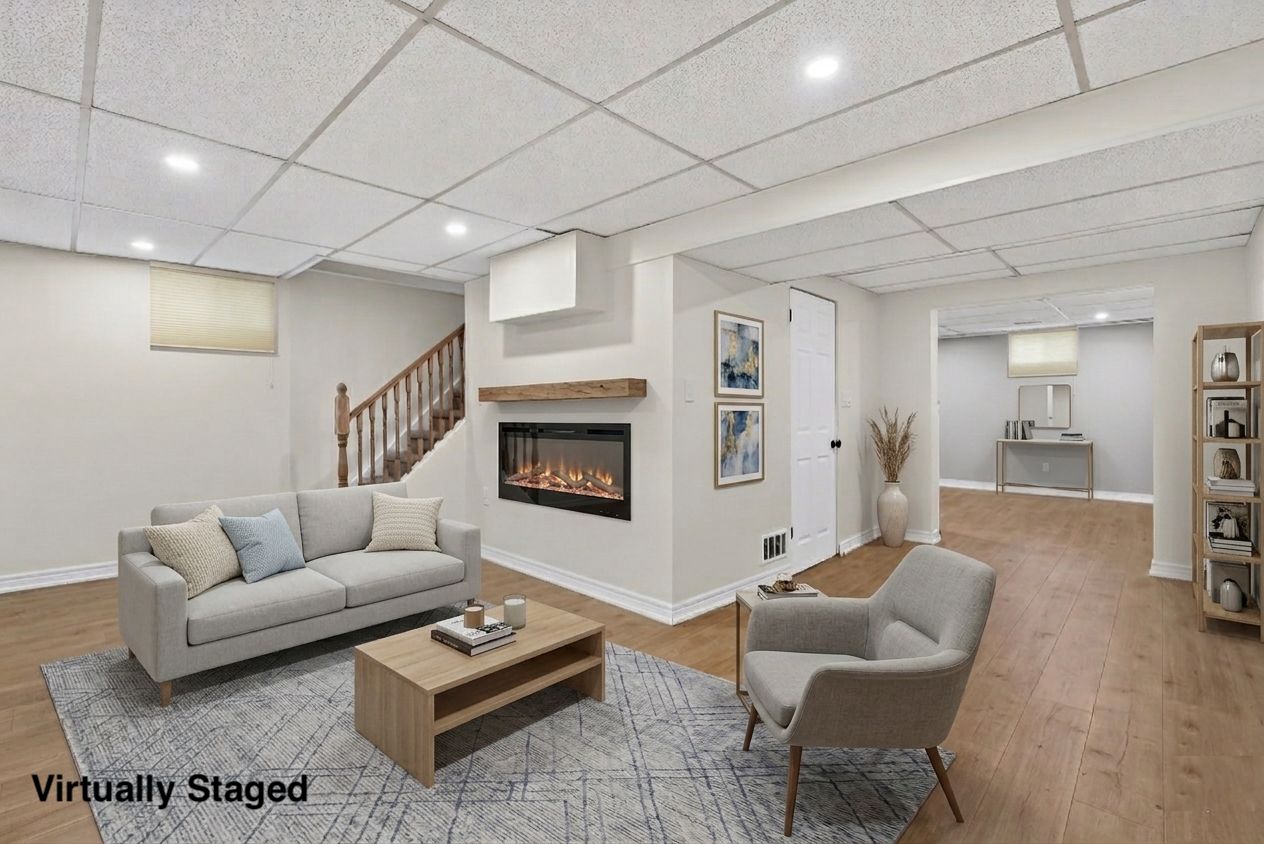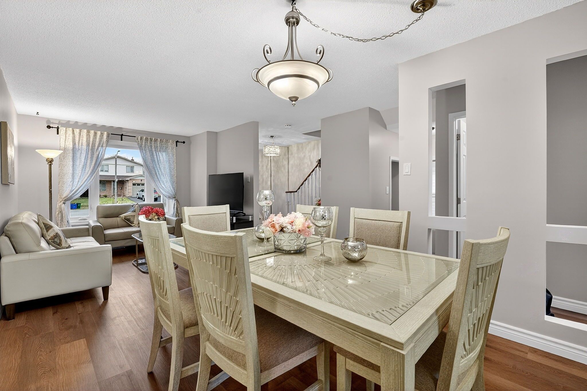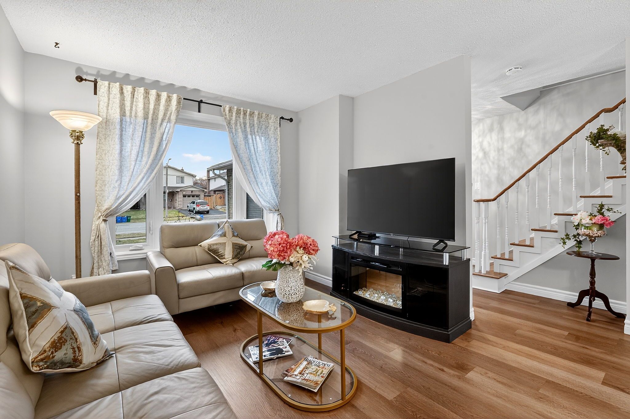This beautifully updated home offers over 1,750 sq. Ft. Of finished living space in the sought-after brant hills neighbourhood, which is perfect for families, those who are downsizing, or first-time buyers. This thoughtfully renovated and freshly painted home offers major updates, including windows, roof, beautifully updated bathrooms, stainless steel kitchen appliances, and professional landscaping. This home blends modern style with everyday functionality. The open-concept main floor features durable luxury vinyl plank flooring and a renovated powder room. The functional kitchen offers a breakfast area with patio door access to the fully fenced backyard, creating a seamless space for indoor-outdoor living. Step outside to a backyard retreat complete with a beautiful large patio area perfect for relaxing, hosting summer bbqs, and entertaining. Upstairs, you'll find hardwood throughout, with three spacious, light-filled bedrooms and the stylishly renovated main bathroom featuring tiled flooring, a tiled shower-tub, modern finishes, and ample storage. The finished basement expands the living space with luxury vinyl flooring, a large family room with fireplace, and a versatile flex area ideal for a home office, home gym, or recreation room. Ideally located close to highways, schools, parks, golf courses, transit, shopping, and everyday amenities in the brant hills community.