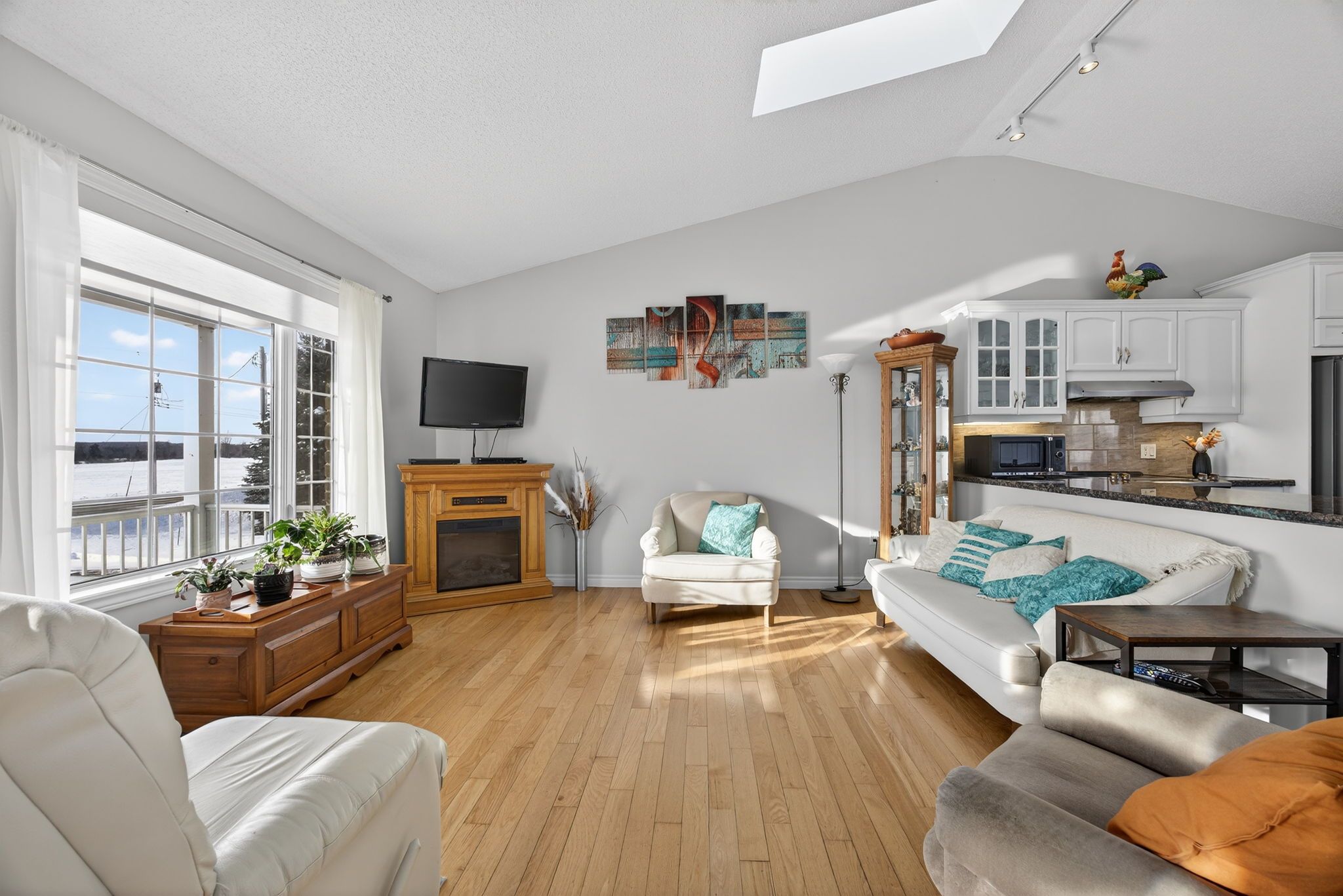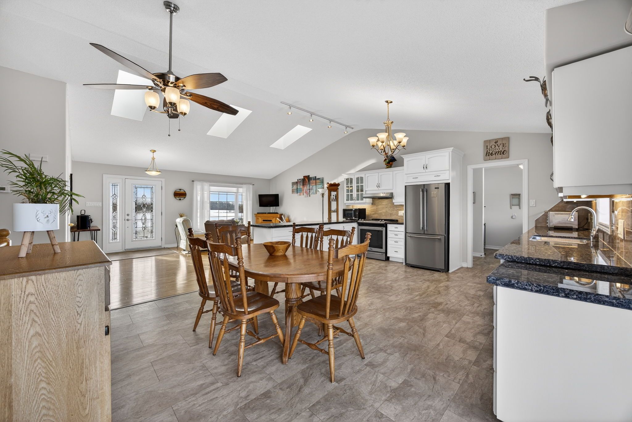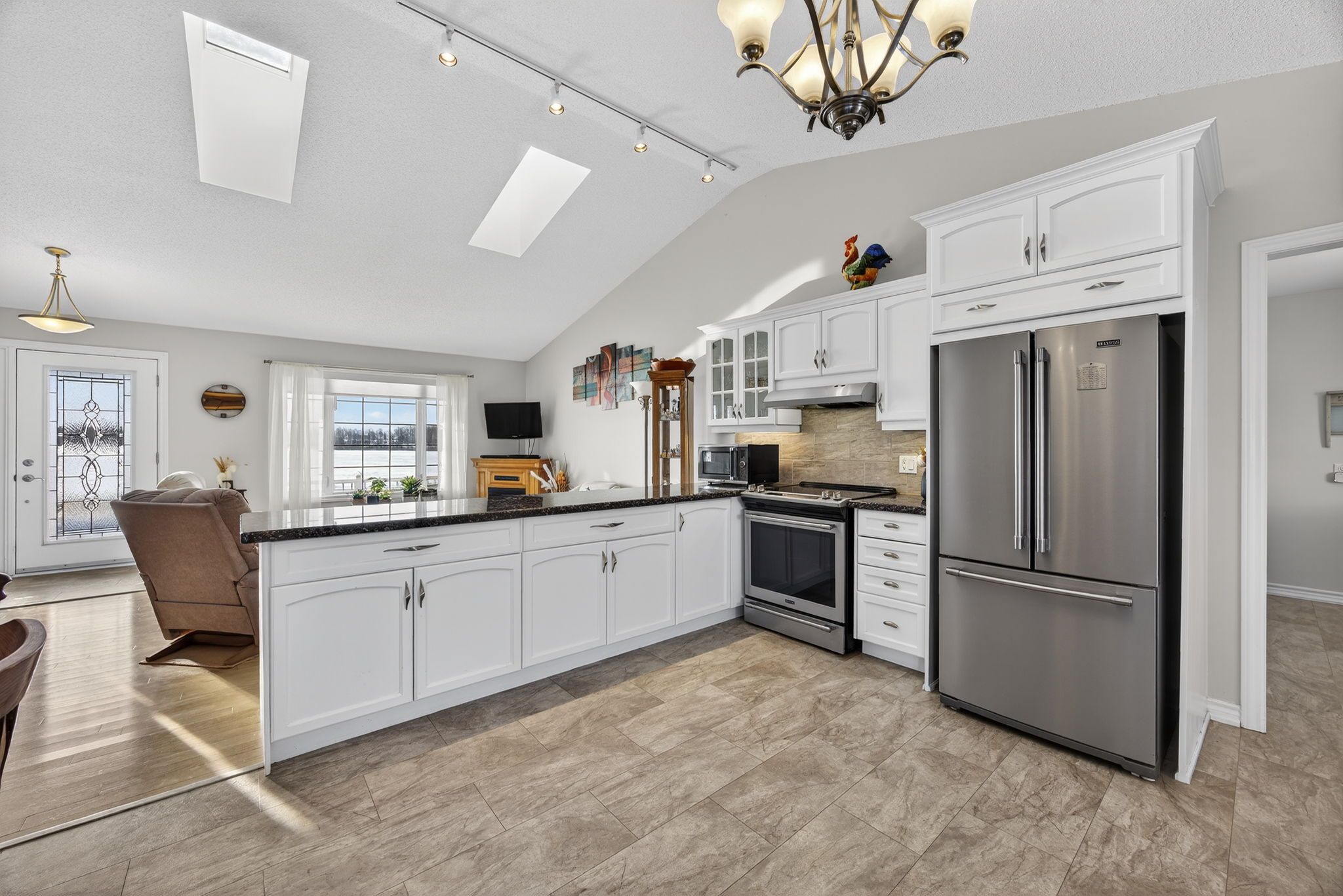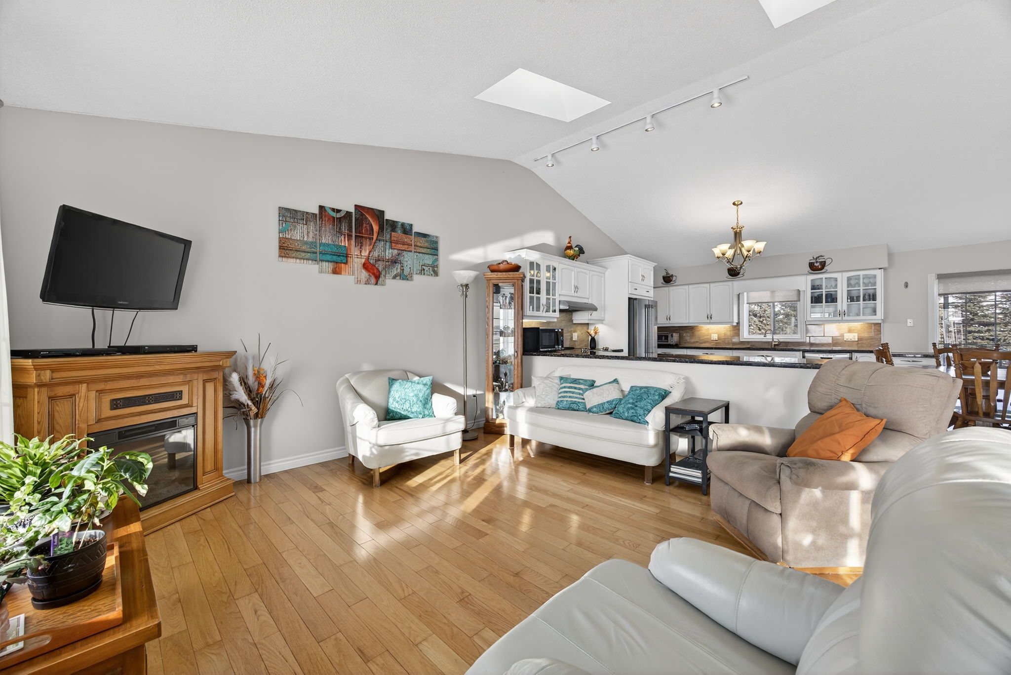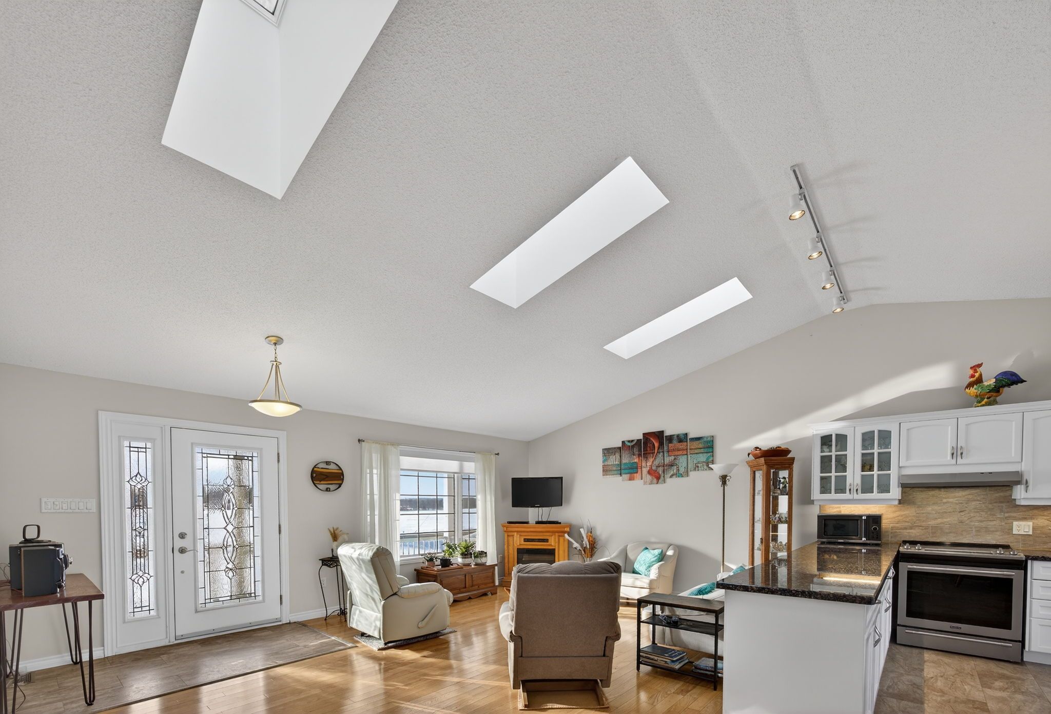 • Open-concept living area with vaulted ceilings and skylights.