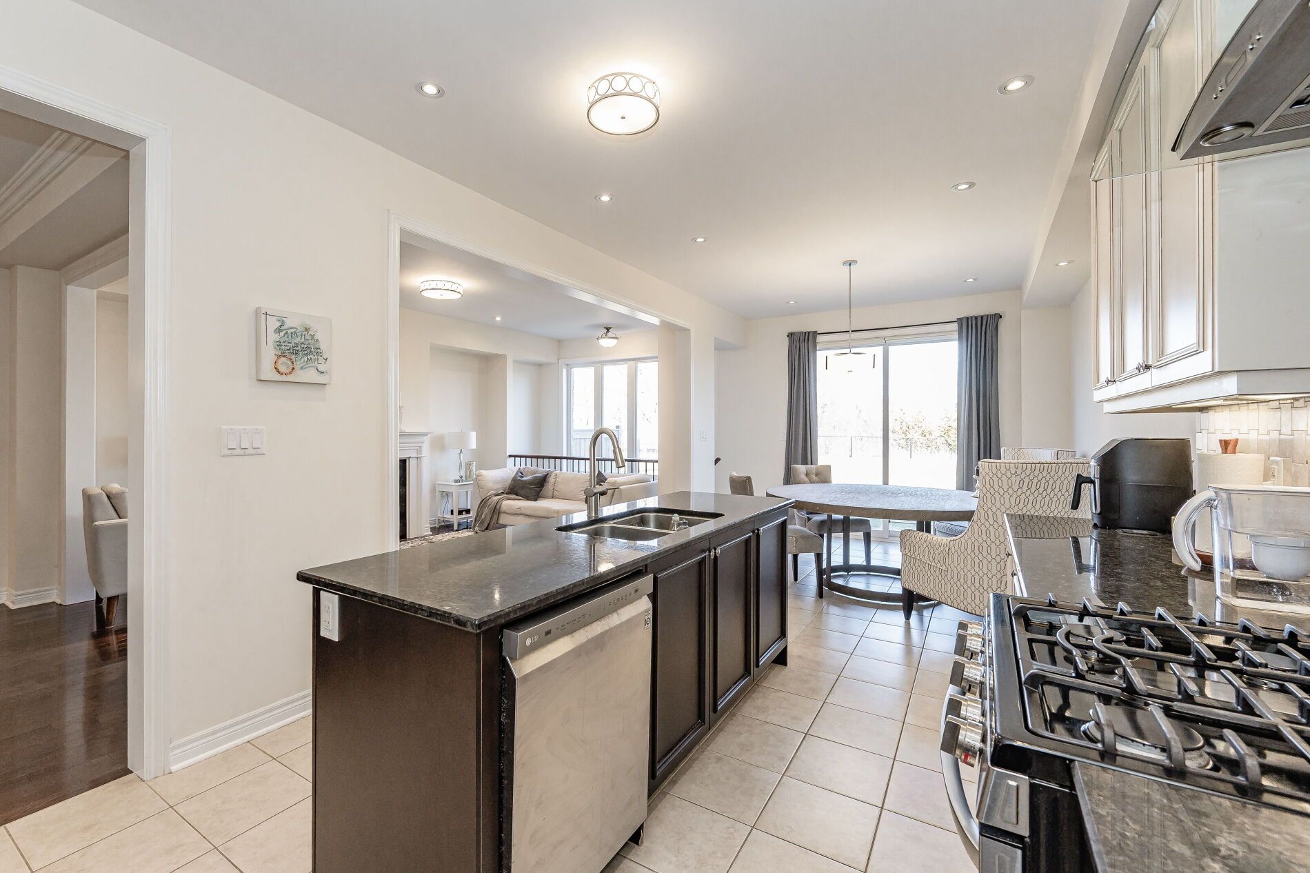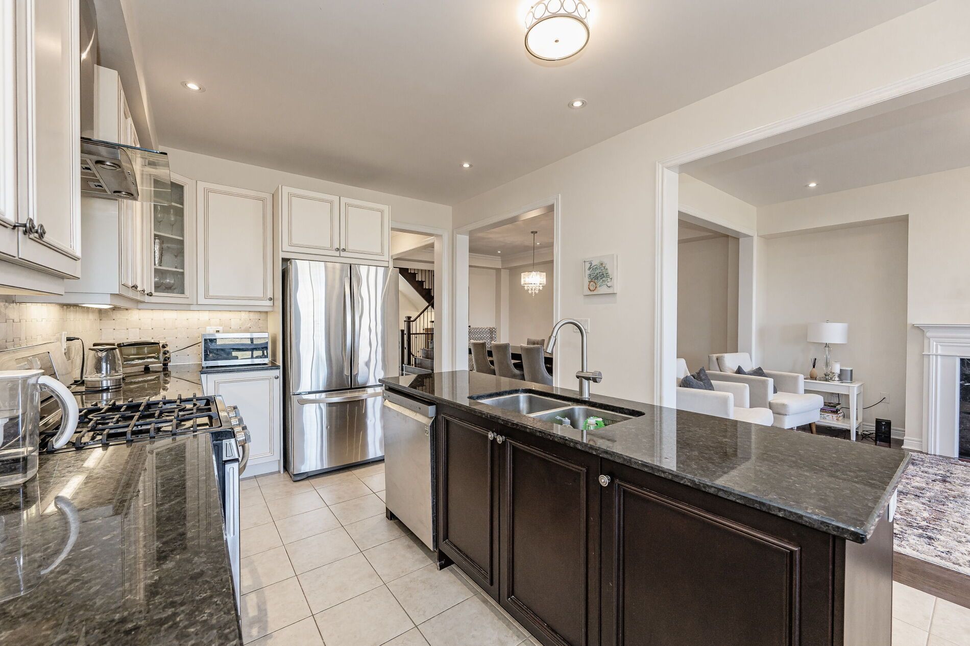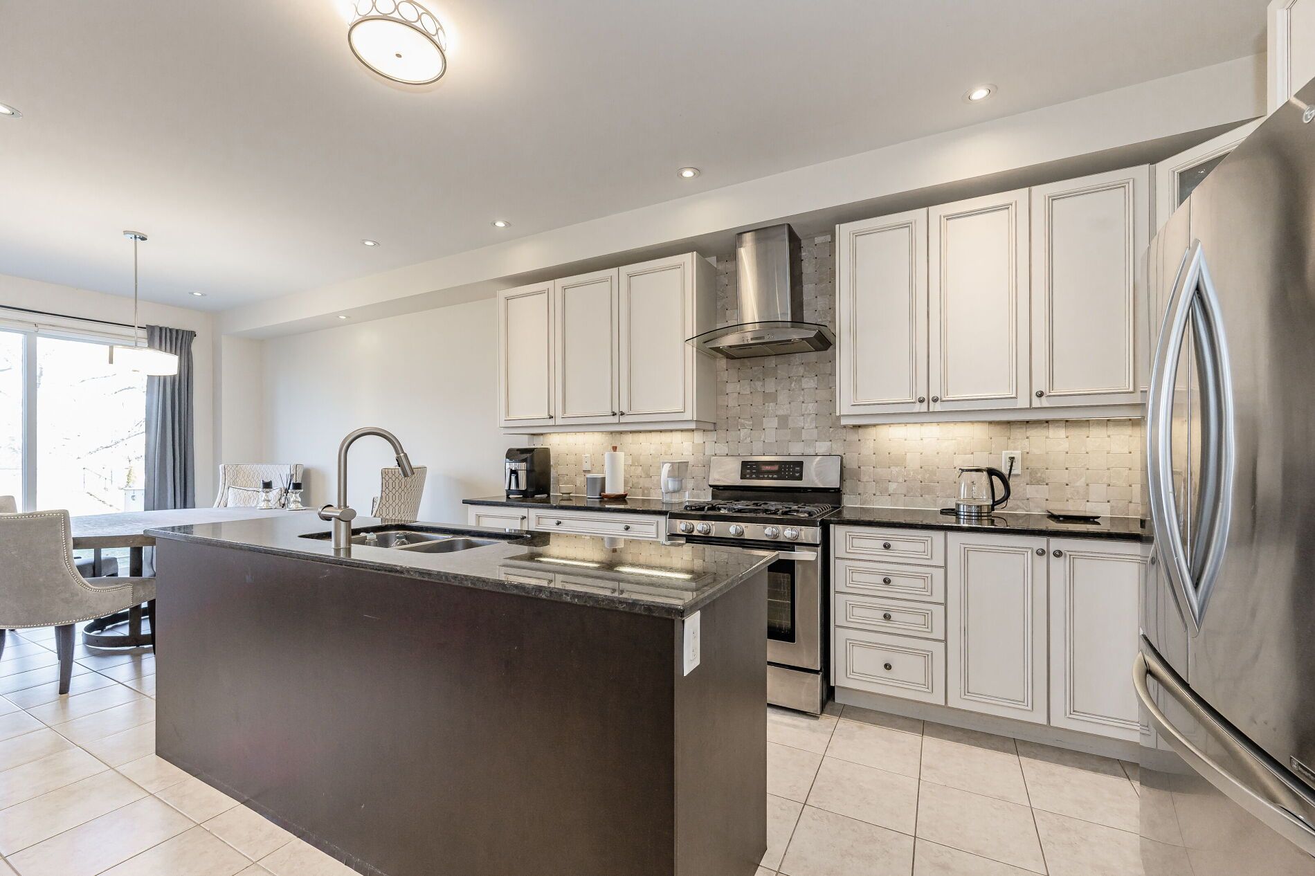 • Modern kitchen features granite countertops, stainless steel appliances, and an eat-in area.