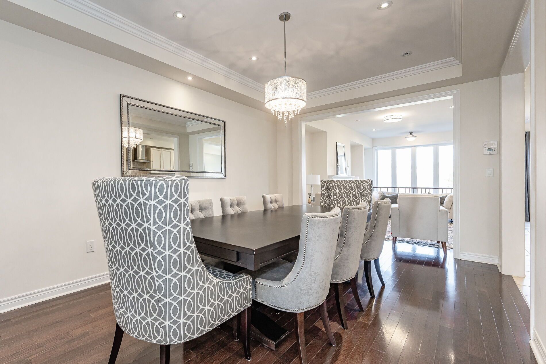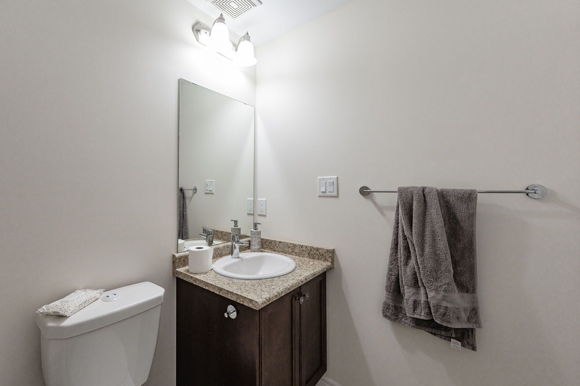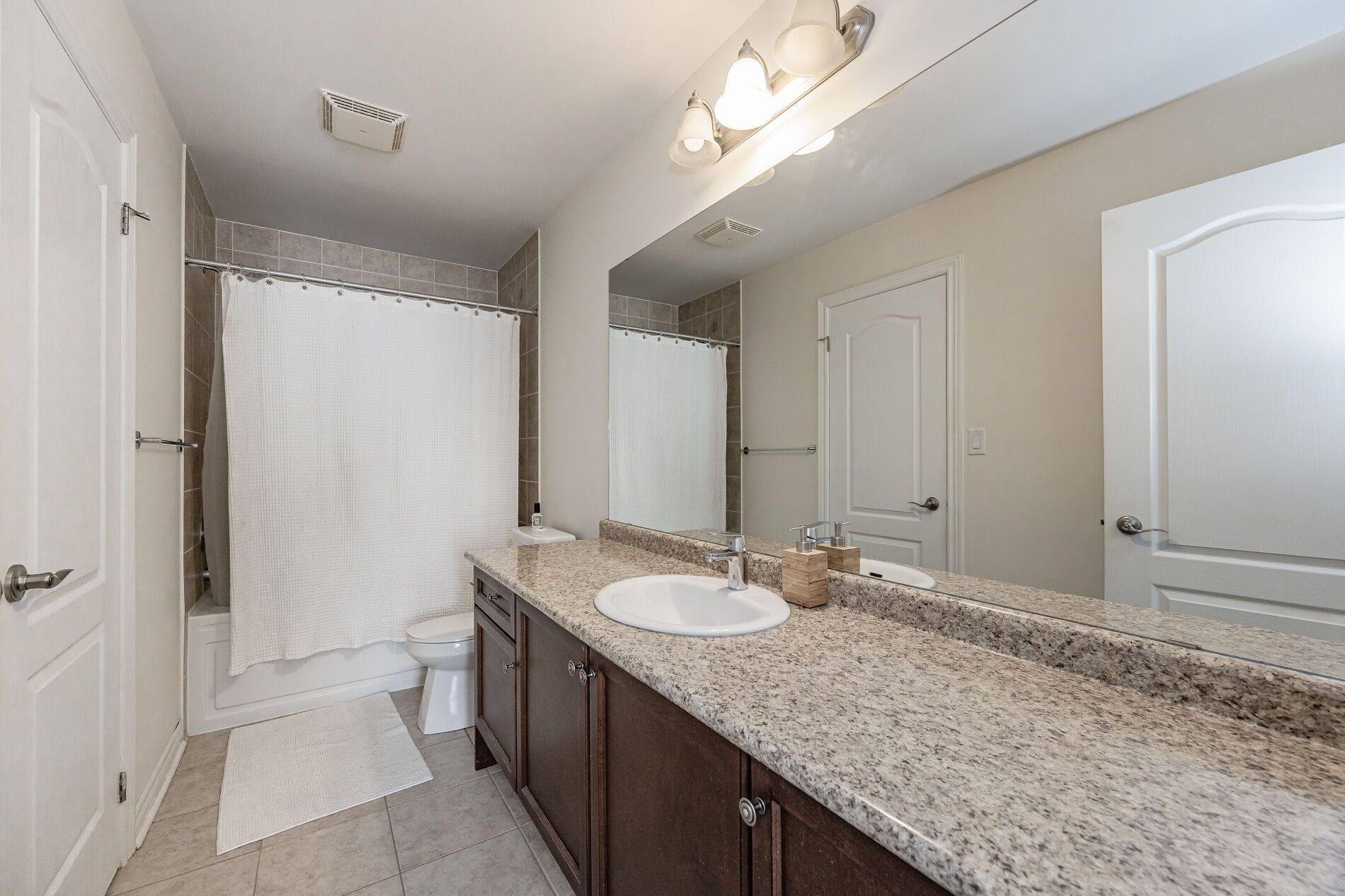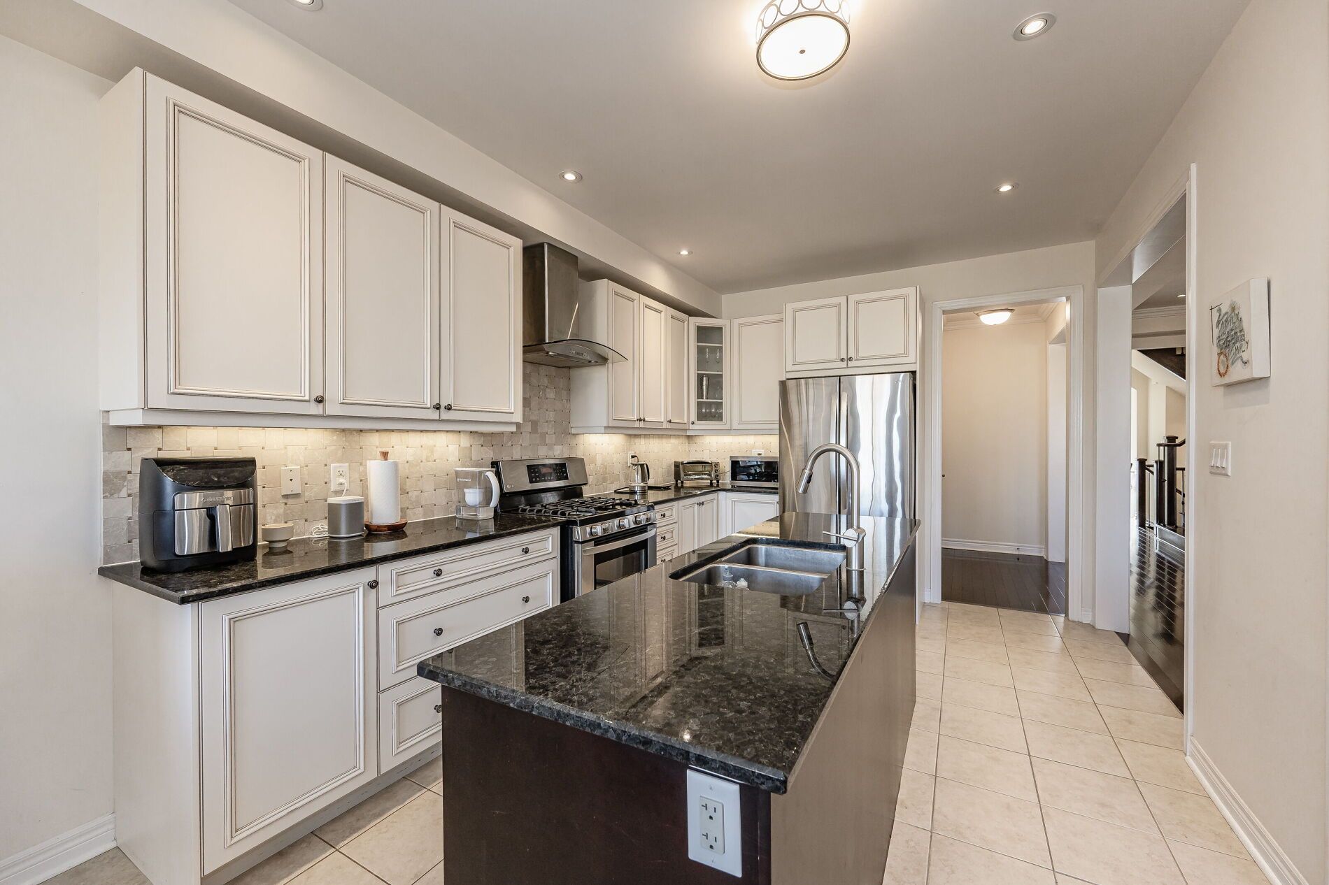 • Modern kitchen features granite countertops, stainless steel appliances, and an eat-in area.