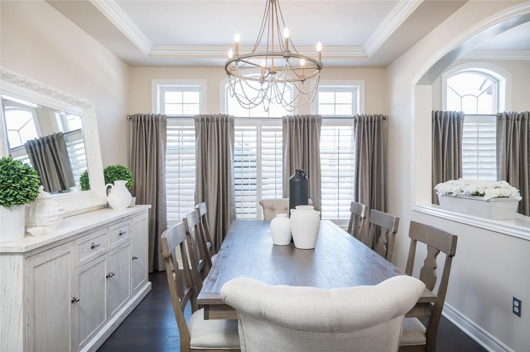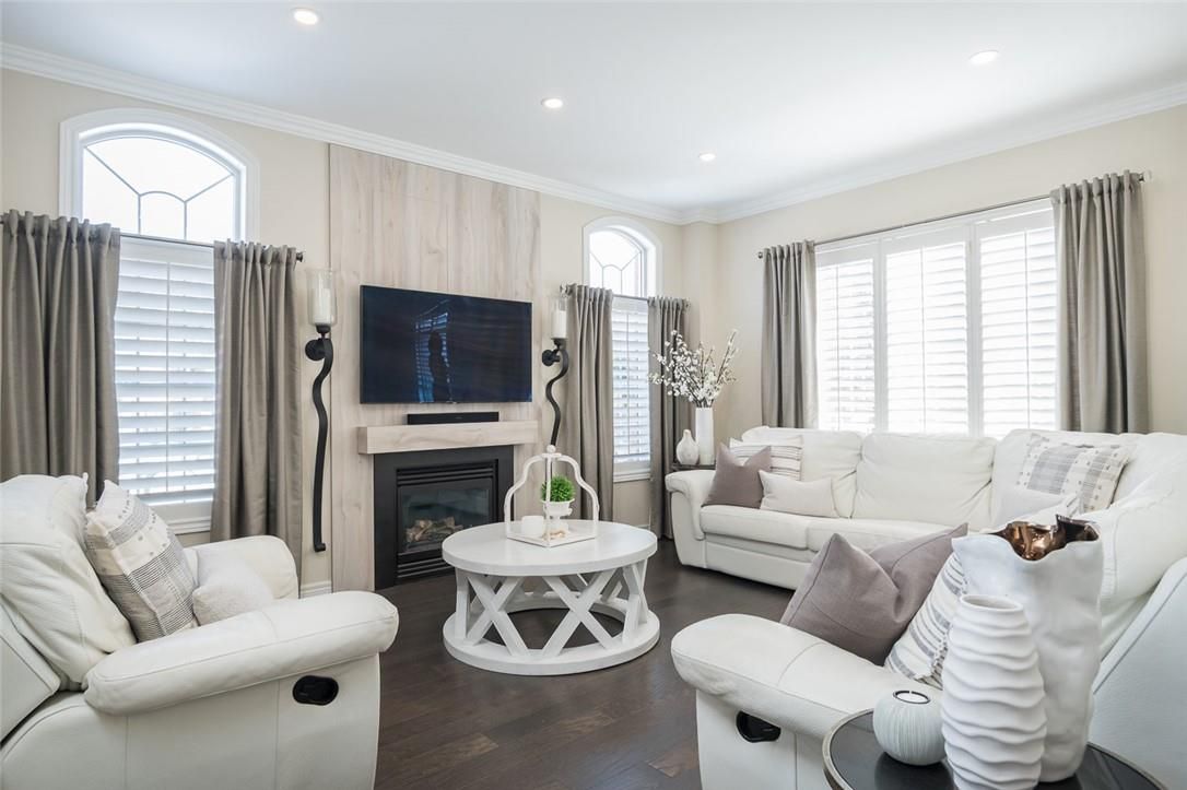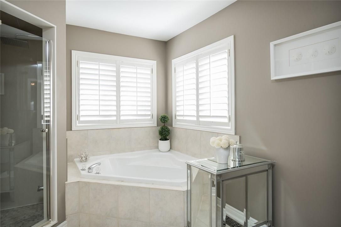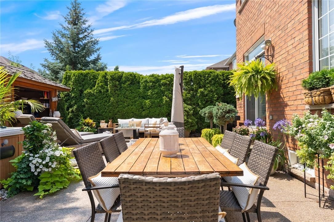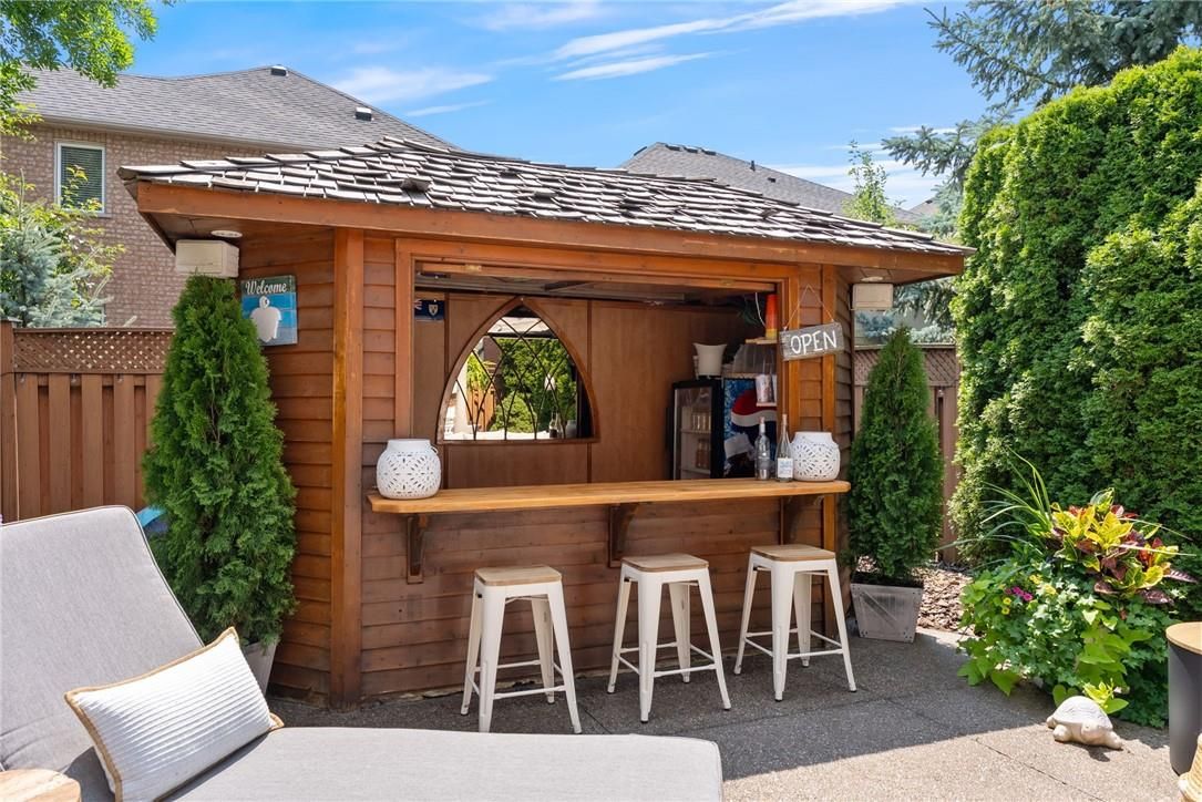 Exquisitely designed with a true model-home feel, this four-bedroom river oaks home showcases elevated finishes and stunning upgrades that extend from its refined interior to the beautifully designed backyard retreat. A grand double-door entrance opens to an impressive foyer with open-to-above ceilings. Hardwood flooring runs throughout the main level, complemented by crown moulding, pot lights, and a hardwood staircase with wrought iron spindles. Arched windows with transoms and impressive ceiling height define the formal living room, finished with california shutters. A tray ceiling enhances the formal dining space, while the family room is anchored by a gas fireplace. The upgraded kitchen features white custom cabinetry, quartz countertops, a full slab backsplash, stainless steel appliances, and a generous island with breakfast bar seating. A bright eat-in area with sliding doors connects seamlessly to the rear yard. Upstairs, a spacious hallway leads to a generously sized primary retreat with ample closet space and a well-appointed five-piece ensuite. A second bedroom offers five-piece ensuite privilege, and two additional well-proportioned bedrooms provide flexibility for family, guests, or office space. The fully finished lower level adds valuable living space with a recreation area and built-in bar. Pot lighting and crown moulding enhance the ceiling detail, while a three-piece bathroom and multiple storage areas add everyday functionality. The backyard is designed for entertaining, featuring an expansive exposed aggregate patio, hot tub, and custom cedar cabana bar, all surrounded by mature hedging for privacy. Located in the heart of river oaks, close to top-rated schools, oakville hospital, parks, trails, shopping, and commuter routes, this home delivers elevated living in one of oakville's most established neighbourhoods.