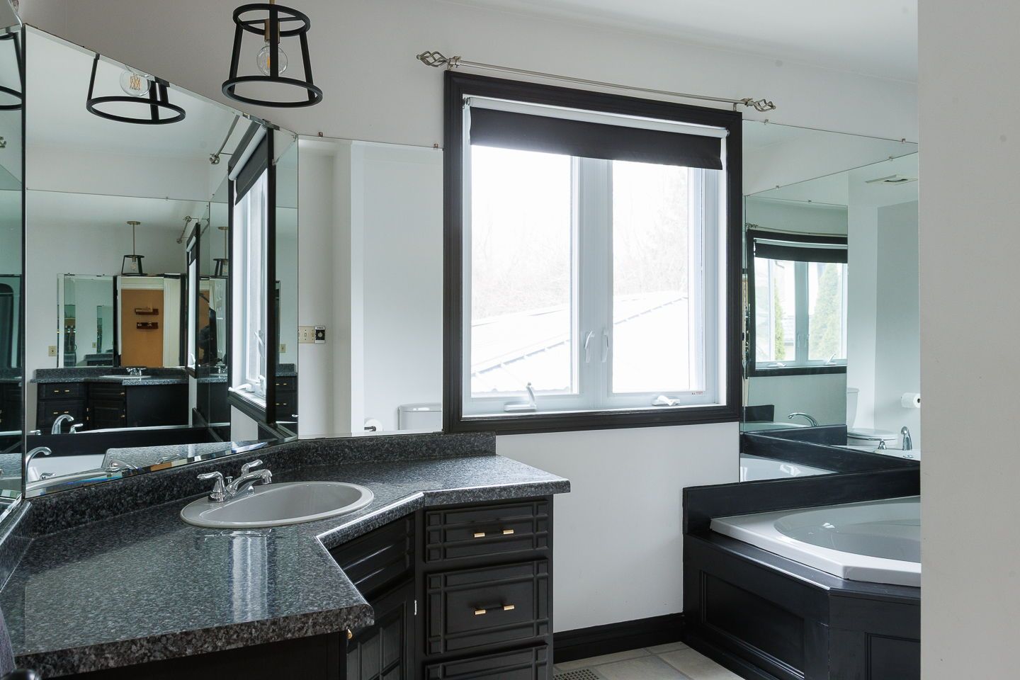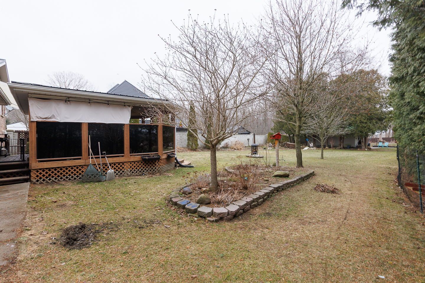 • Unique covered deck with cathedral ceiling overlooking a large backyard.