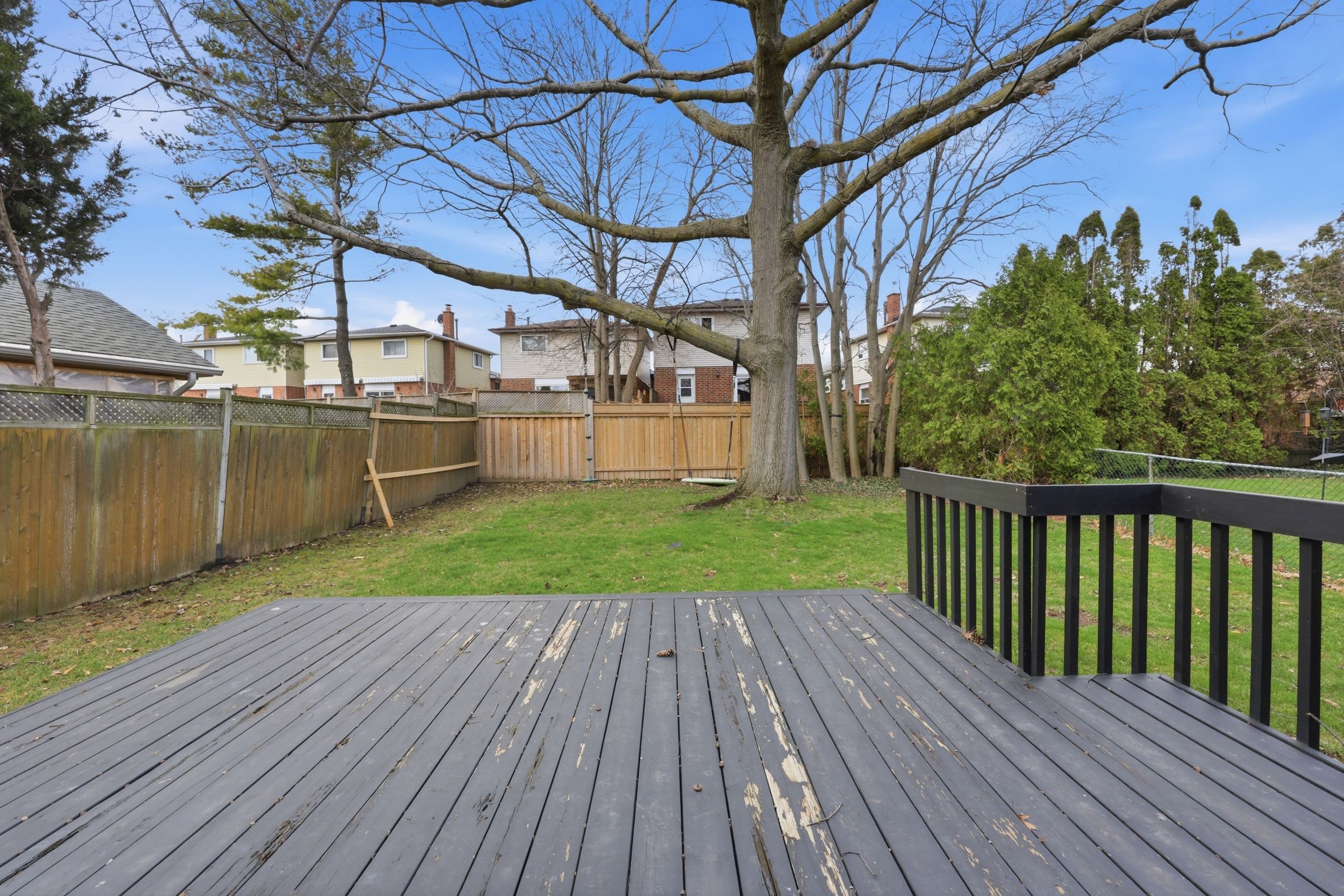 • Large private backyard with a deck, great for entertaining or relaxation.