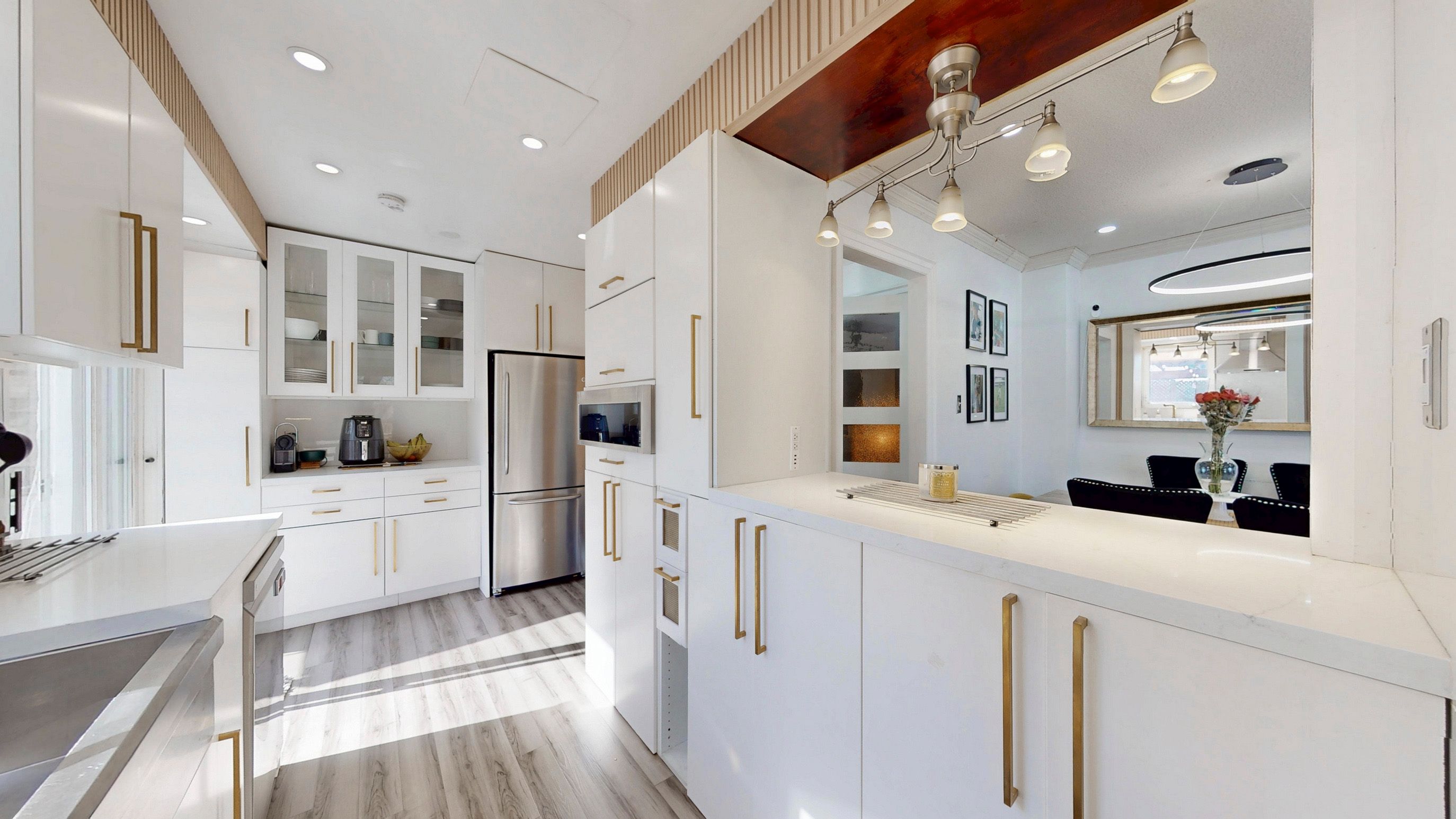 • Stylish kitchen with a sliding door opening to a large backyard.