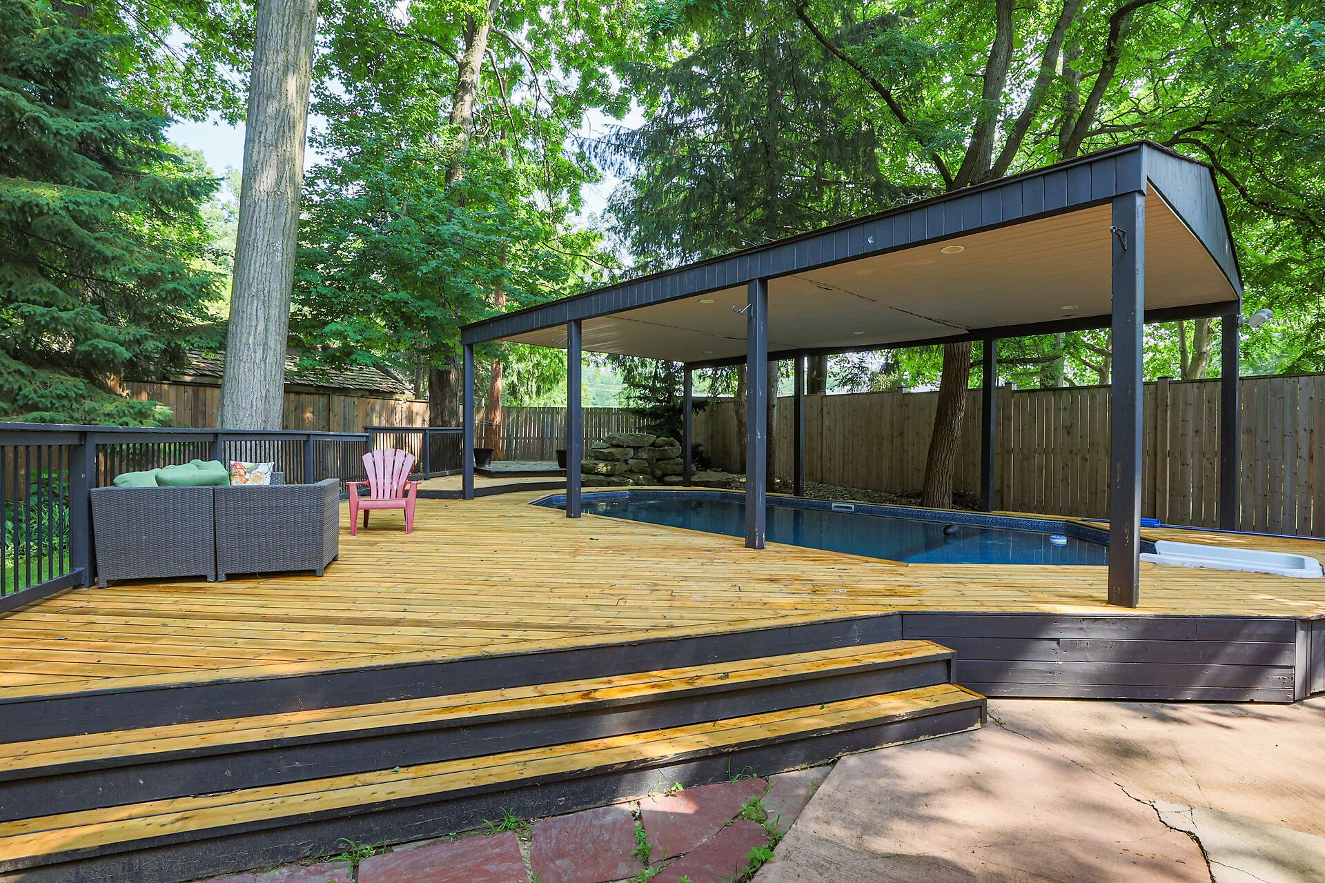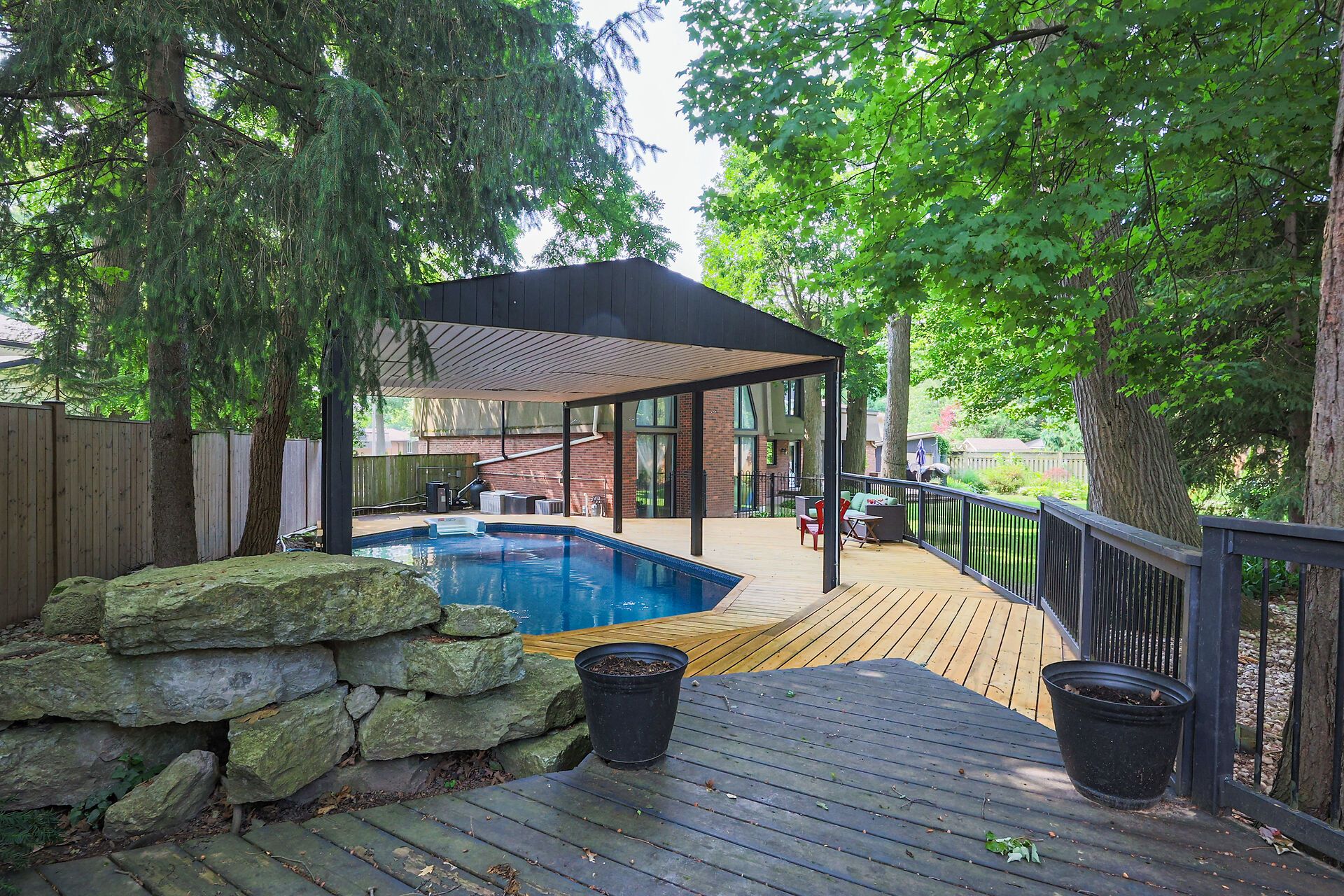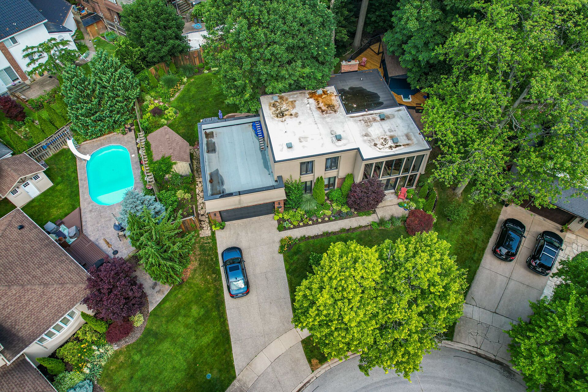 New roof! Welcome to the highly desired north end in rolla woods sitting on the border of niagara falls and niagara on the lake wine country in a quiet mature cul-de-sac. Walking into this home's foyer is breathtaking with the floor to ceiling windows and a winding staircase, natural light emanates and gives life throughout this entire home. This one off contemporary home design sits on a large natural wooded lot not found in many new subdivisions, giving off vibes of small town life with a cottage country feel in an upscale neighbourhood. This beautifully updated 3-bedroom, 3-bathroom home has a very spacious and sprawling open concept on the main floor with amazing light and 360 degree views of the pool area and backyard while offering a blend of functionality, comfort and style throughout. On the main floor you will discover 20 foot vaulted ceilings with a warm and inviting calm interior. The heart of the home features a rare fully functional granite wood-burning fireplace surrounded by the spacious main floor living room, perfect for entertaining and relaxing. Upstairs,you'll find three generously sized bedrooms including a serene primary suite with direct access to the main bath with a gorgeous new large walk-in rain shower. Set in a parklike setting is your private and quiet backyard oasis, almost cottage like, complete with an on-ground pool surrounded by a custom wood deck, ideal for summer entertaining or simply unwinding peacefully. The downstairs has been 100 % completely renovated with a seated wet bar and a cozy gas fireplace, a kids play room or extra storage area and an additional 3rd bathroom with a walk-in shower. The double garage offers plenty of storage and,with 2 points of entry into the home, one being a very generous mud room for extra space and storage that connects directly to the kitchen which can also act as a large pantry. Don't miss this opportunity to own a move-in ready home in the soughtafter north end of niagara falls and wine country.