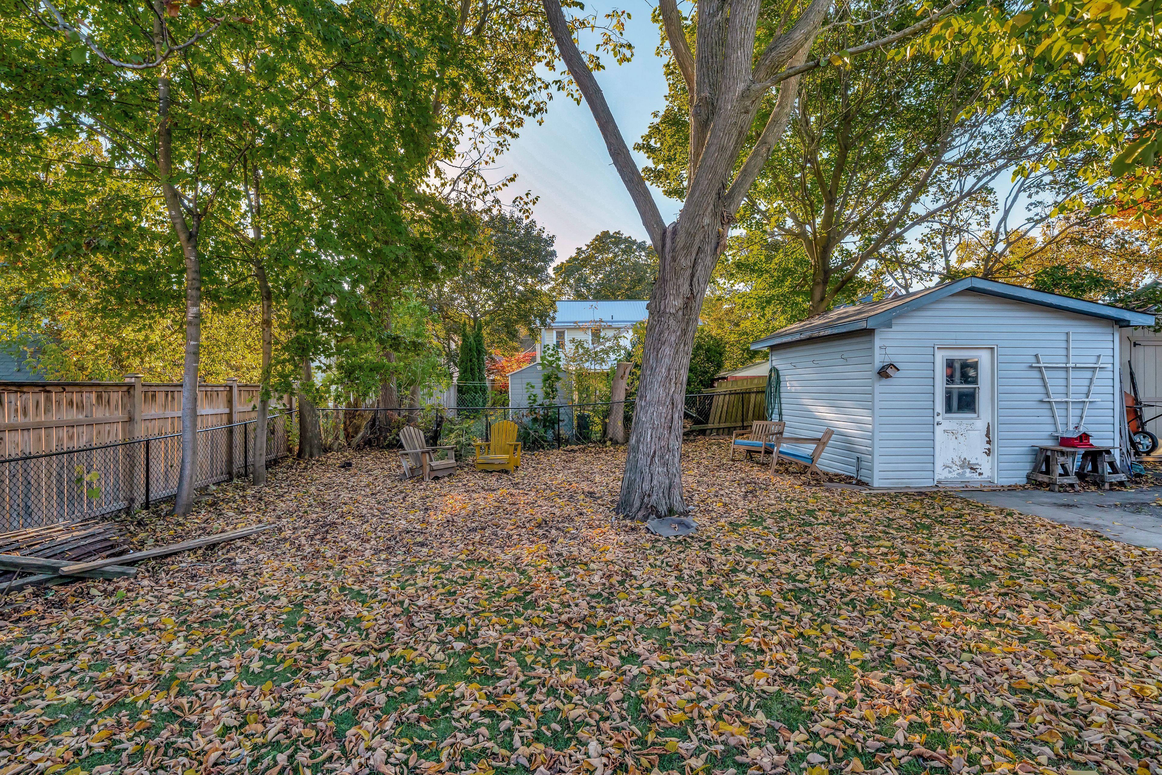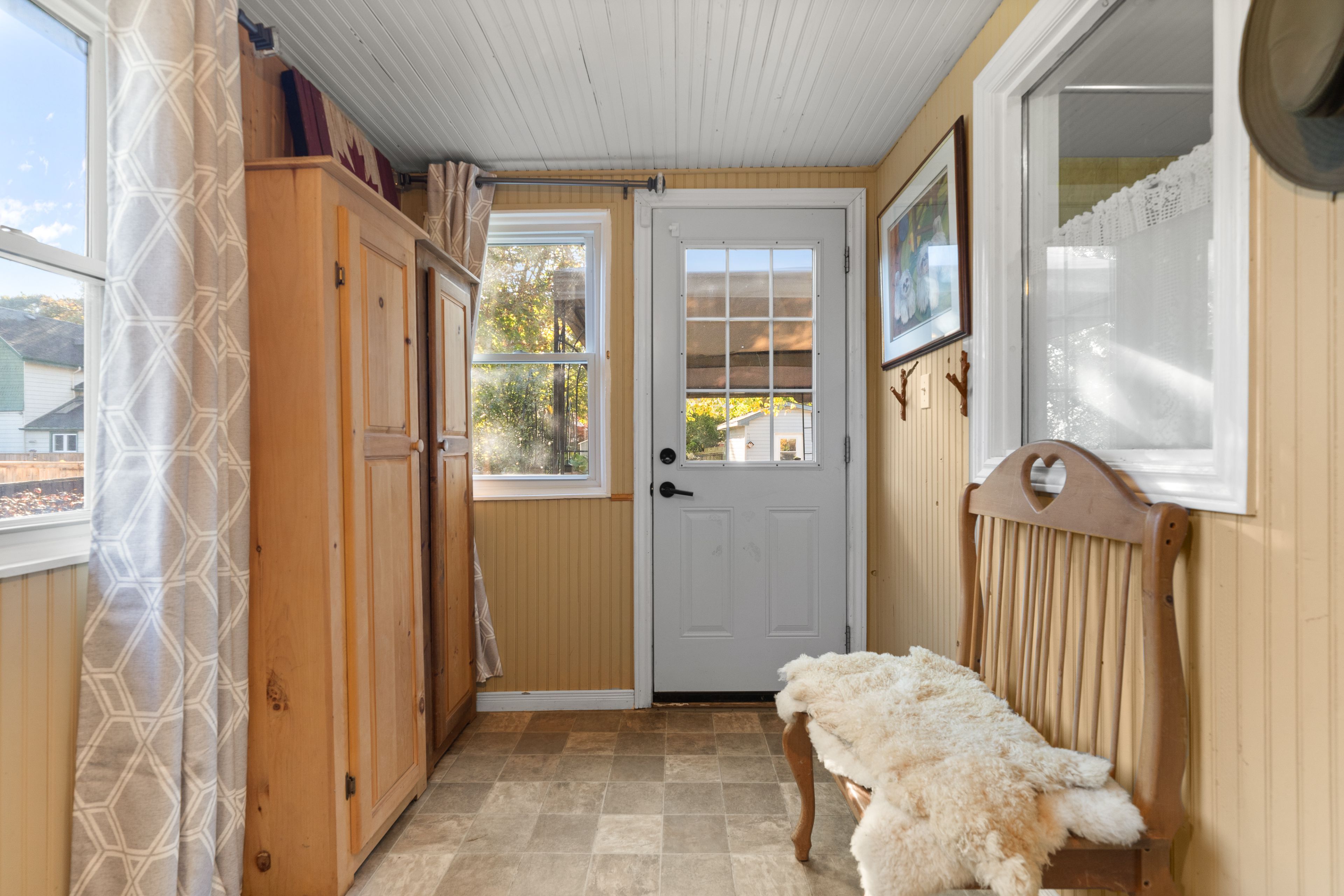 • Bright sunroom with views of a spacious, fenced backyard.