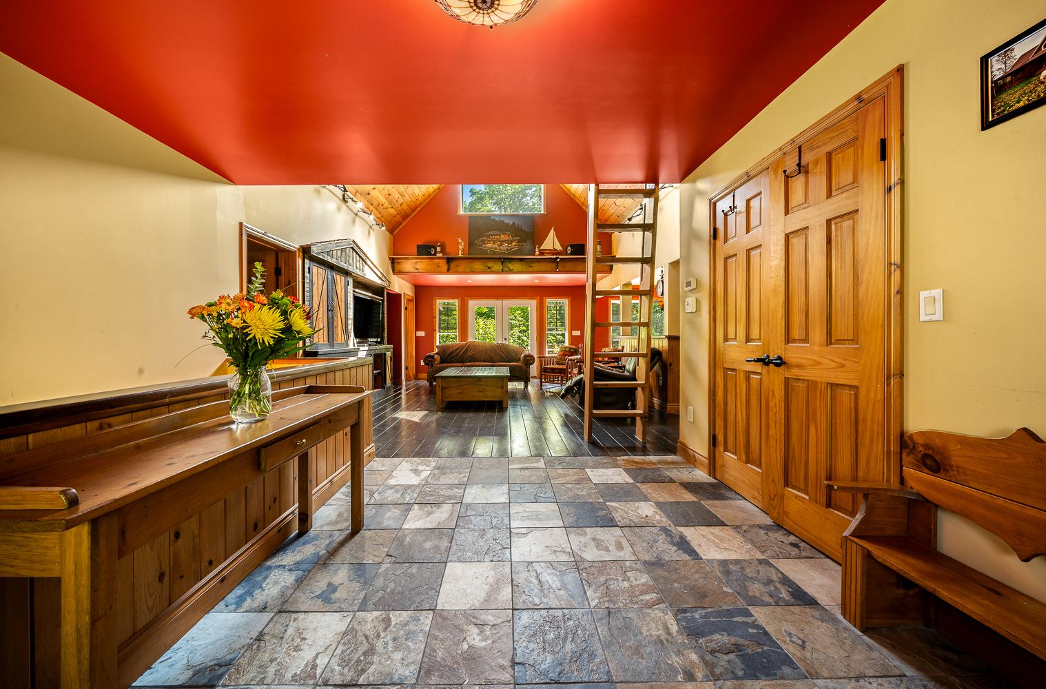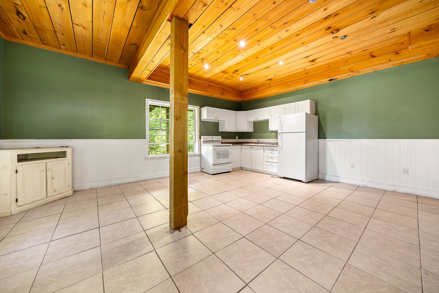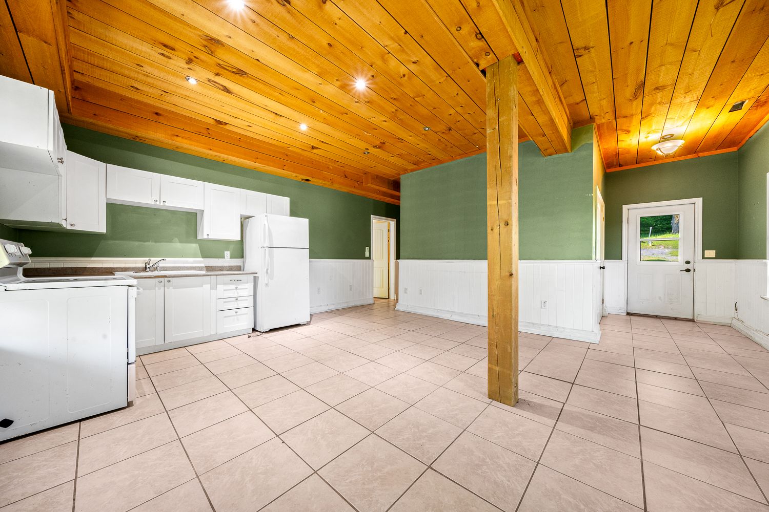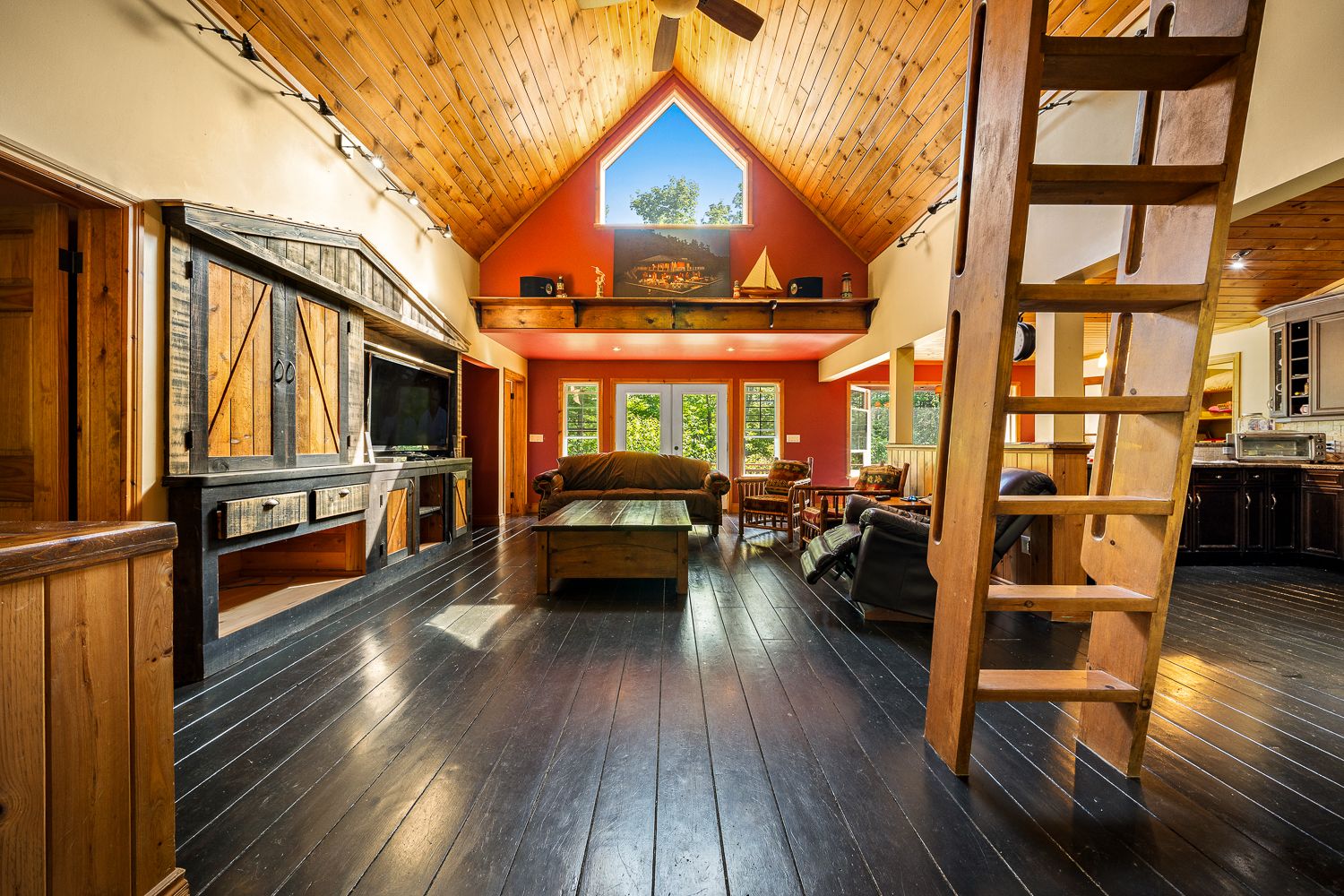 • Main floor features open-concept layout with cathedral ceilings.
