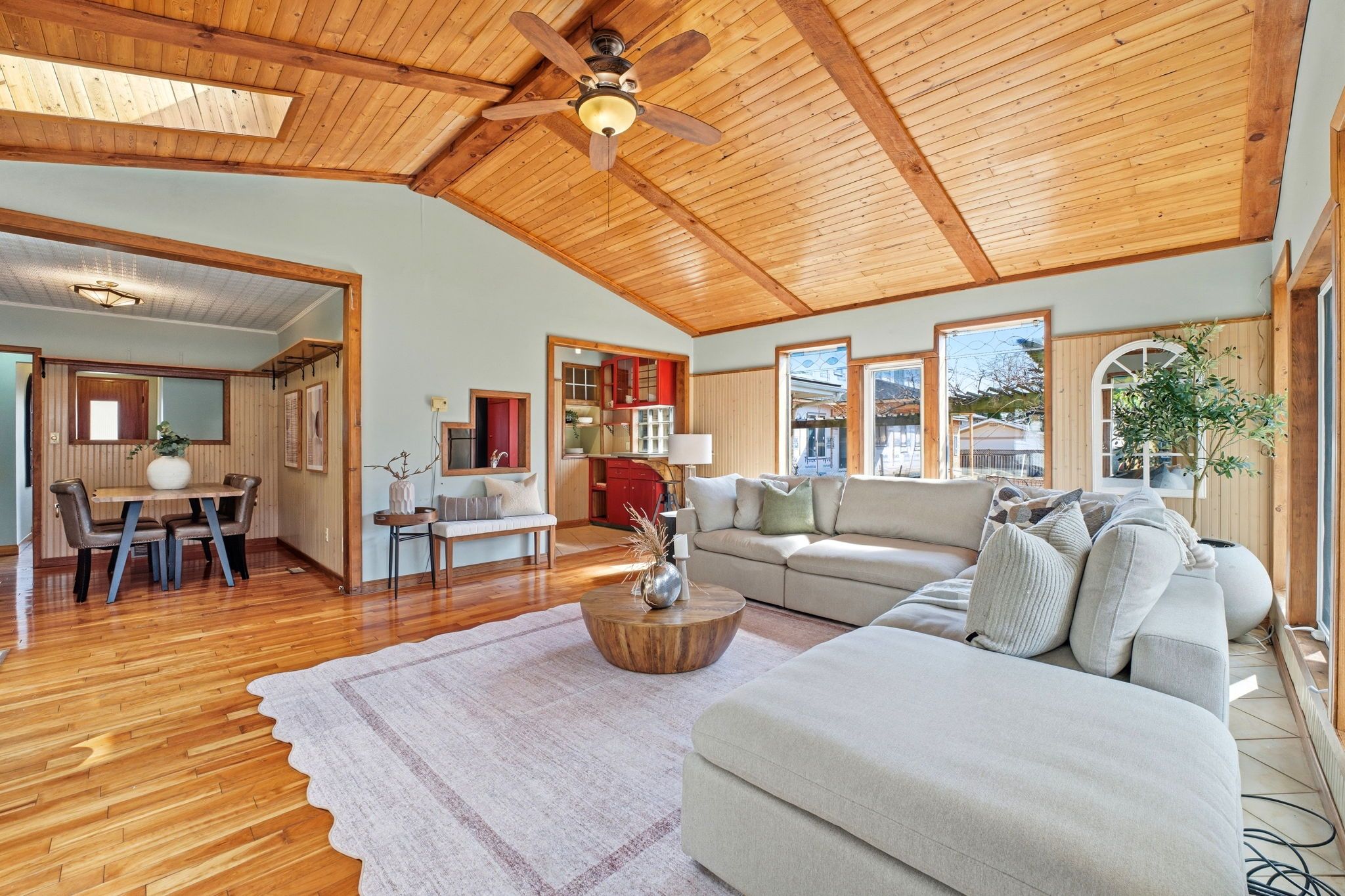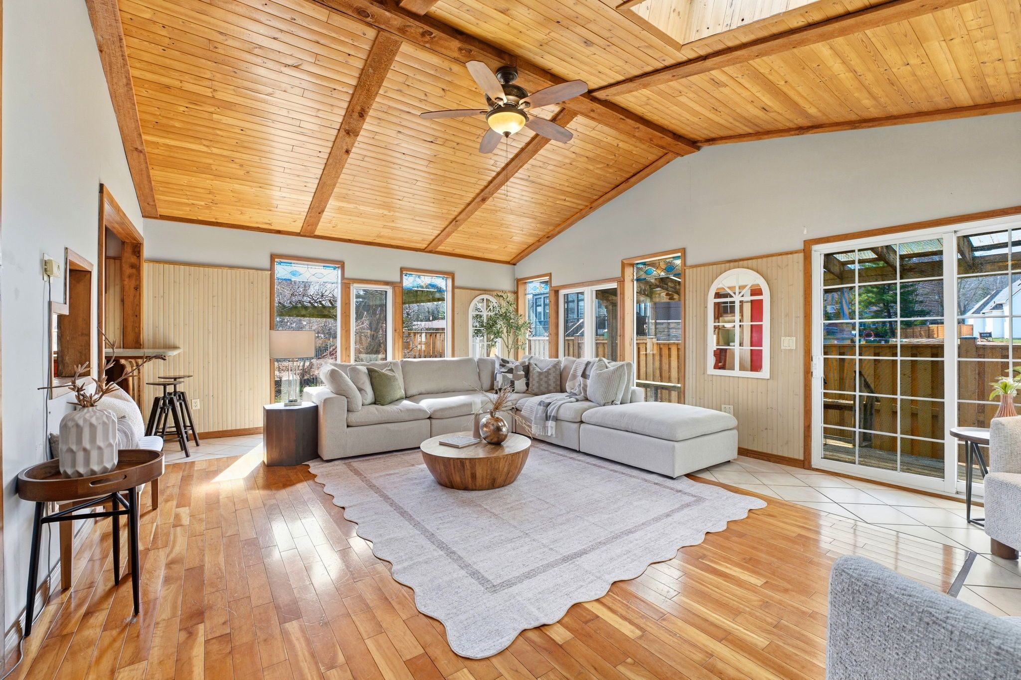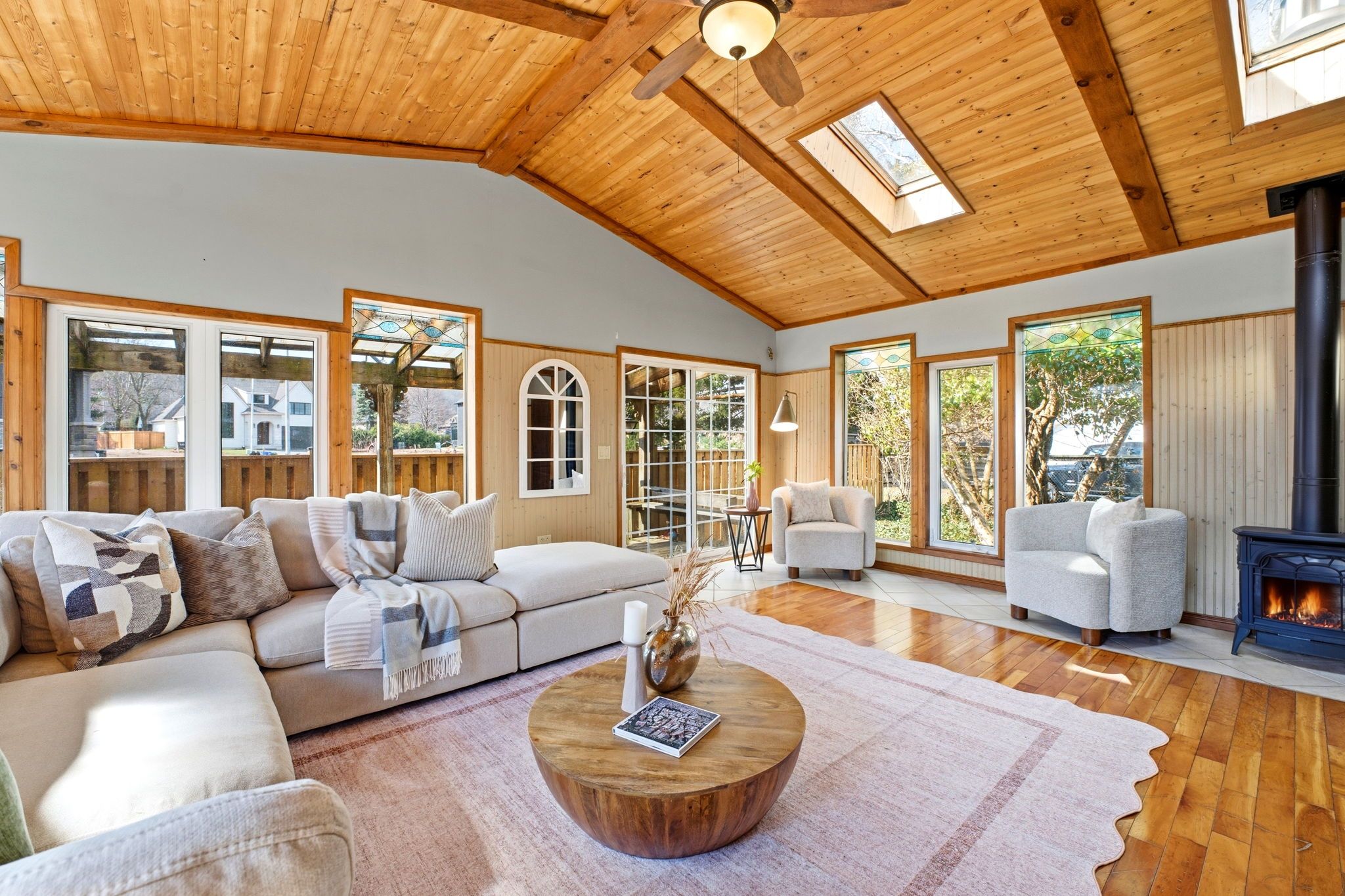 • Spacious family room with vaulted ceilings and a cozy gas stove.