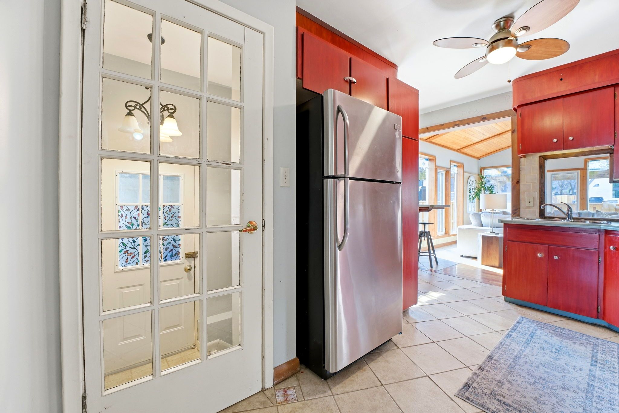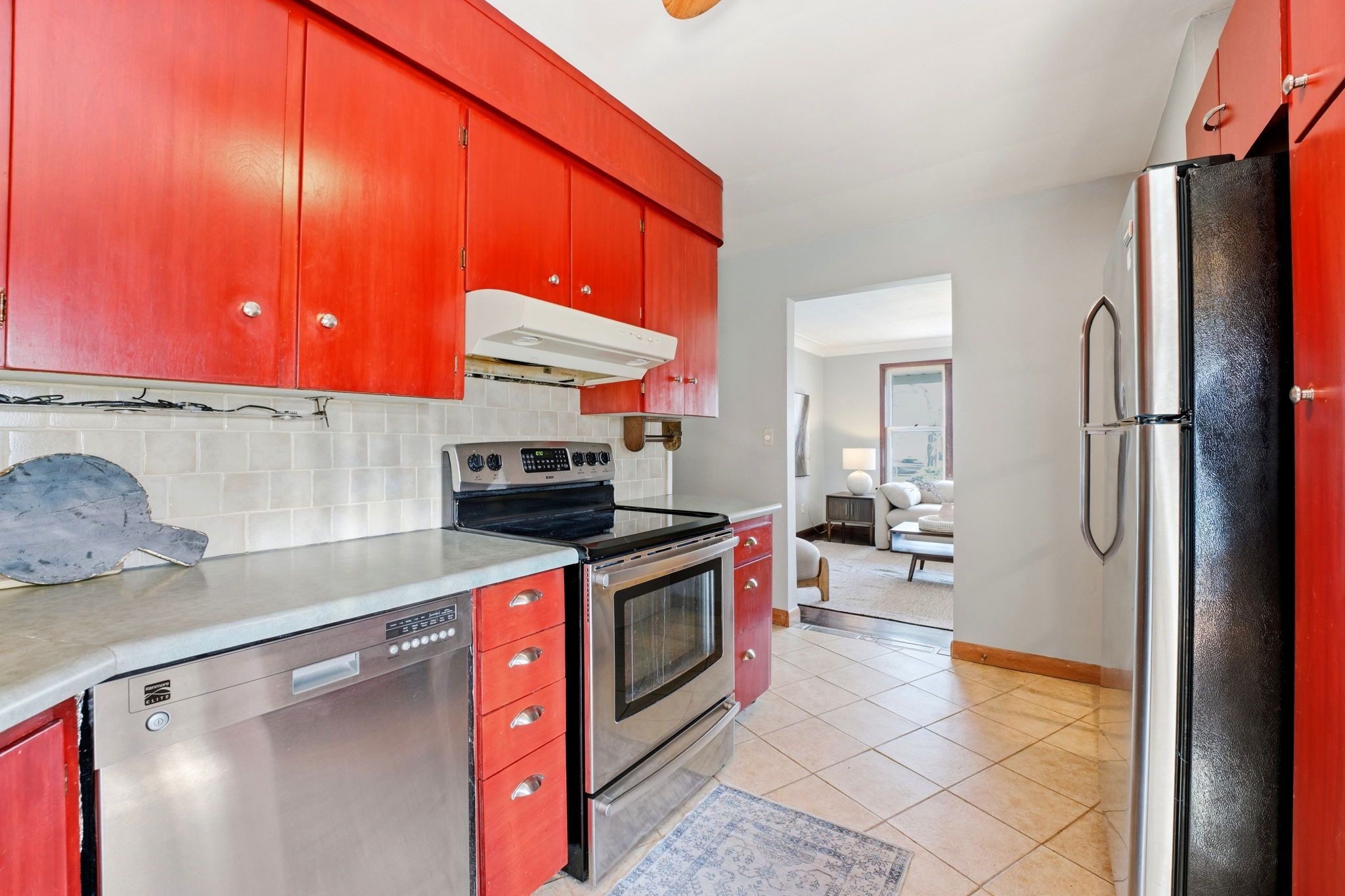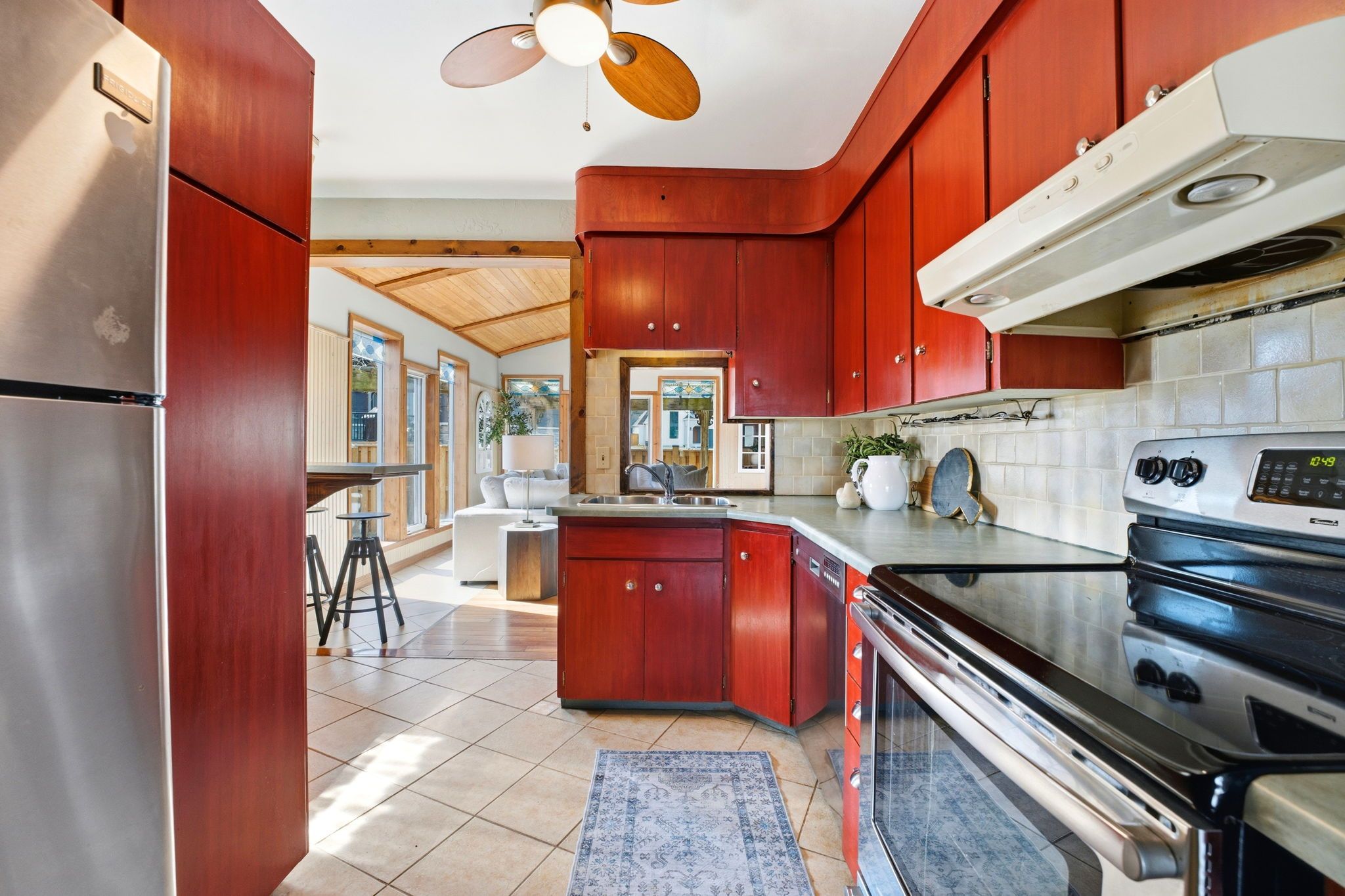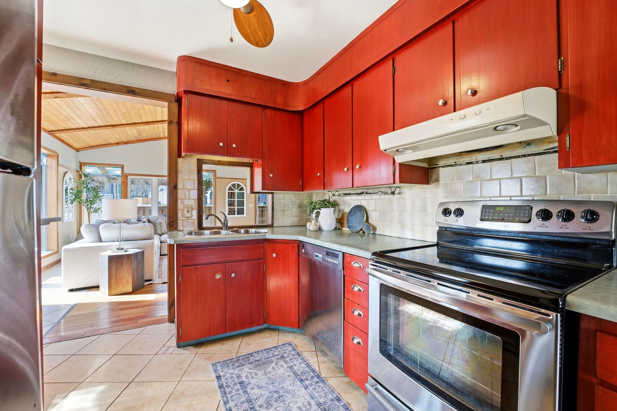 • Spacious family room with vaulted ceilings and a cozy gas stove.