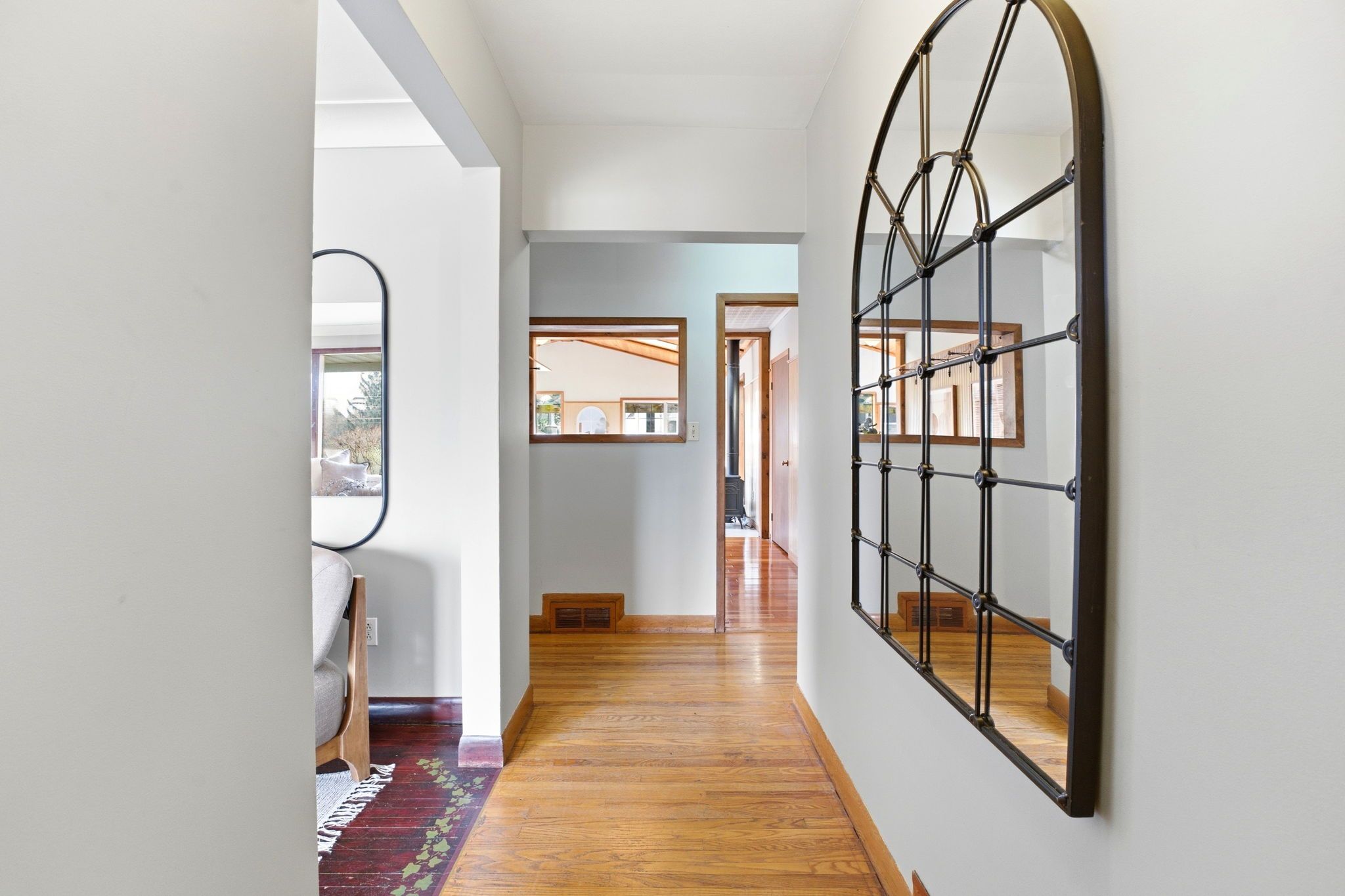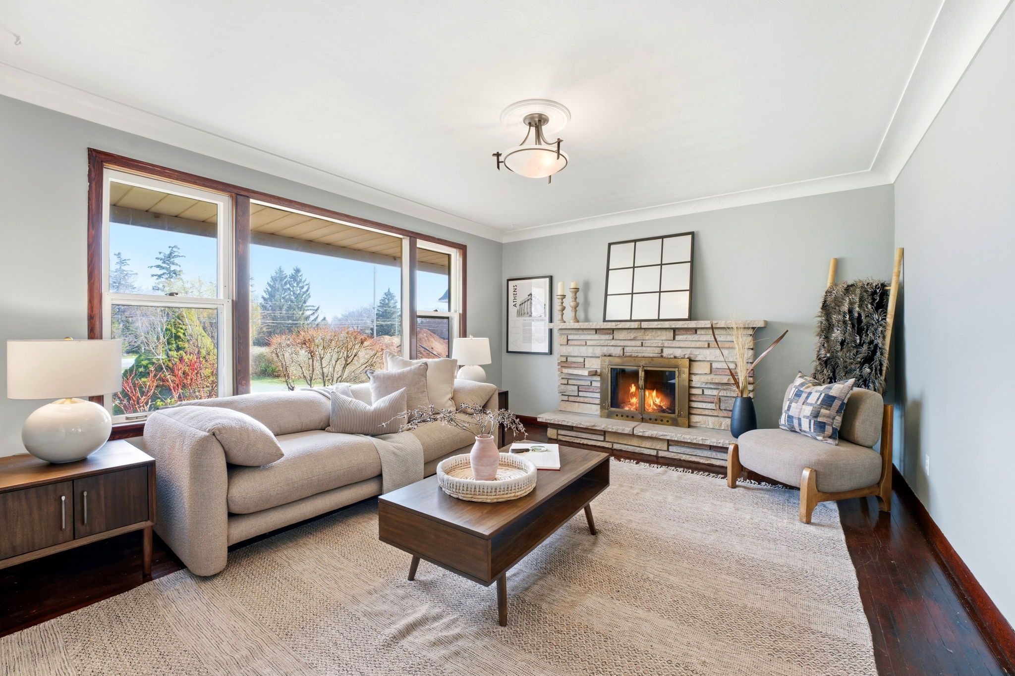 • Separate formal living room with a wood-burning fireplace for relaxation.