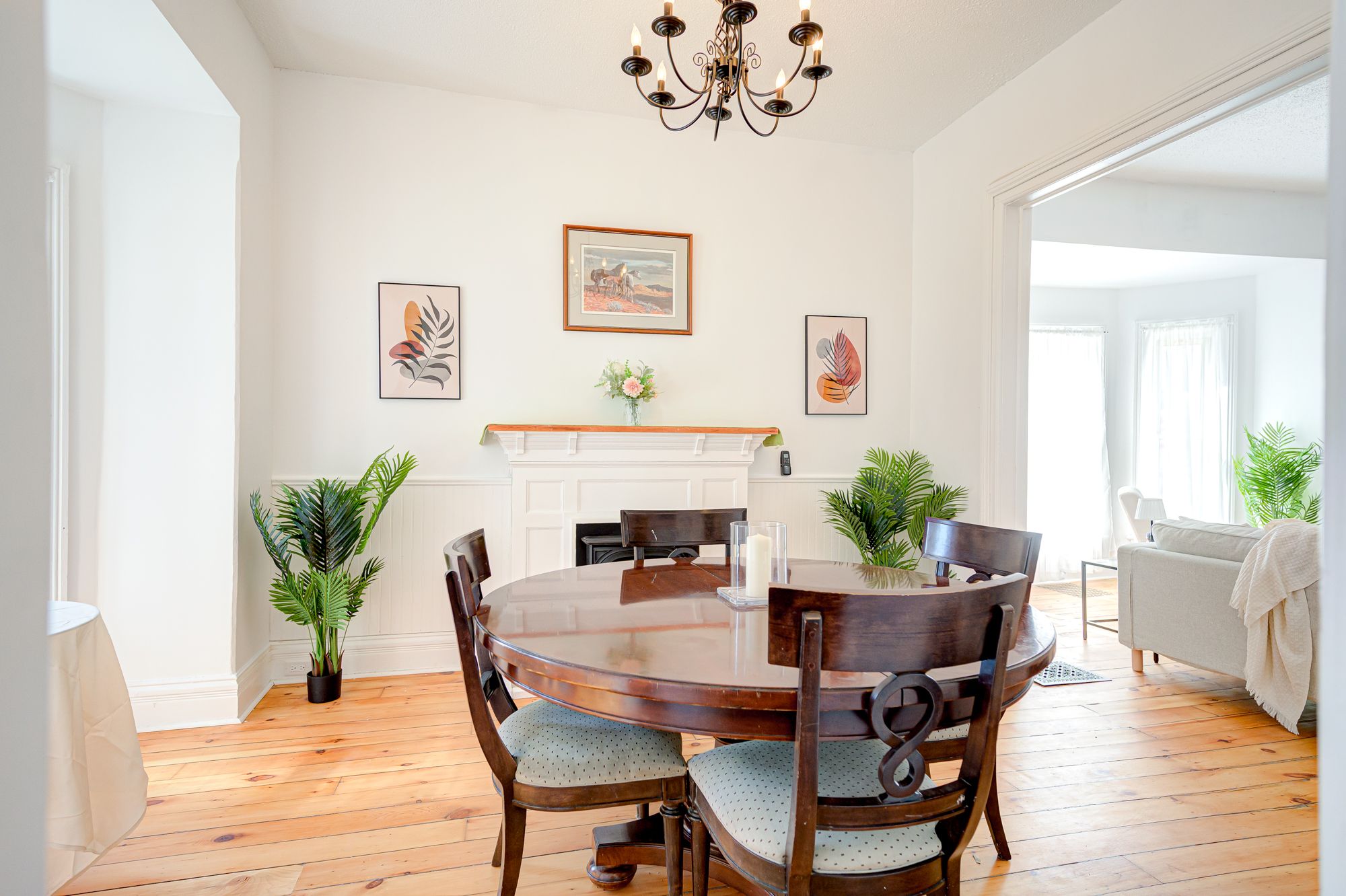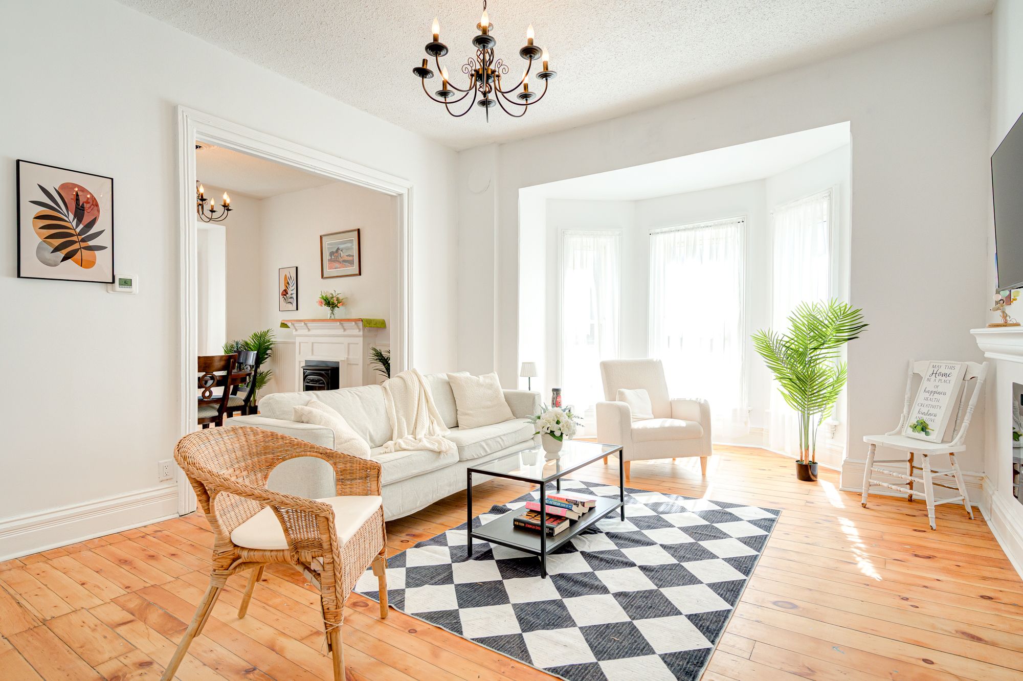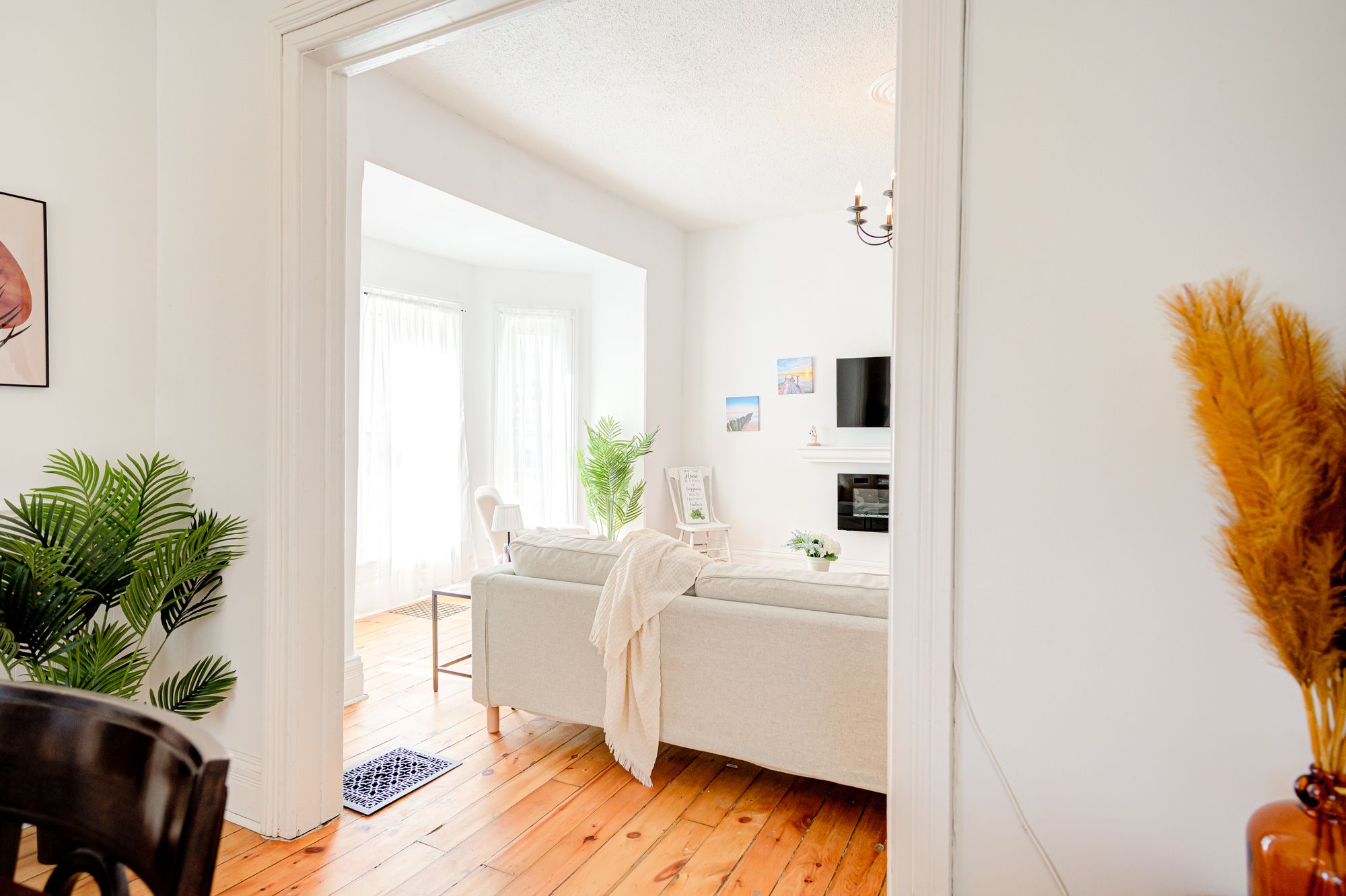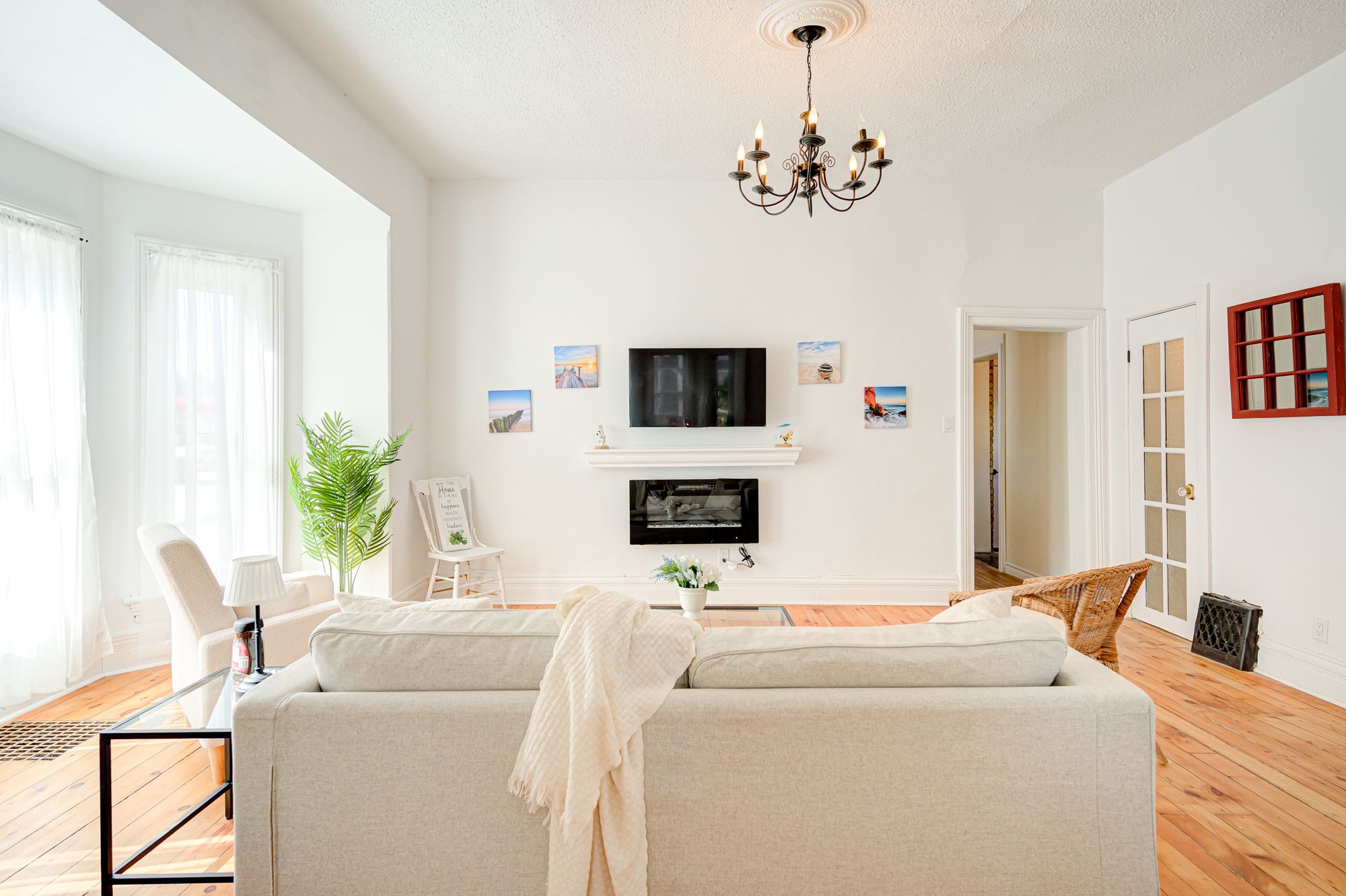 • Bright family room with modern electric fireplace and TV.