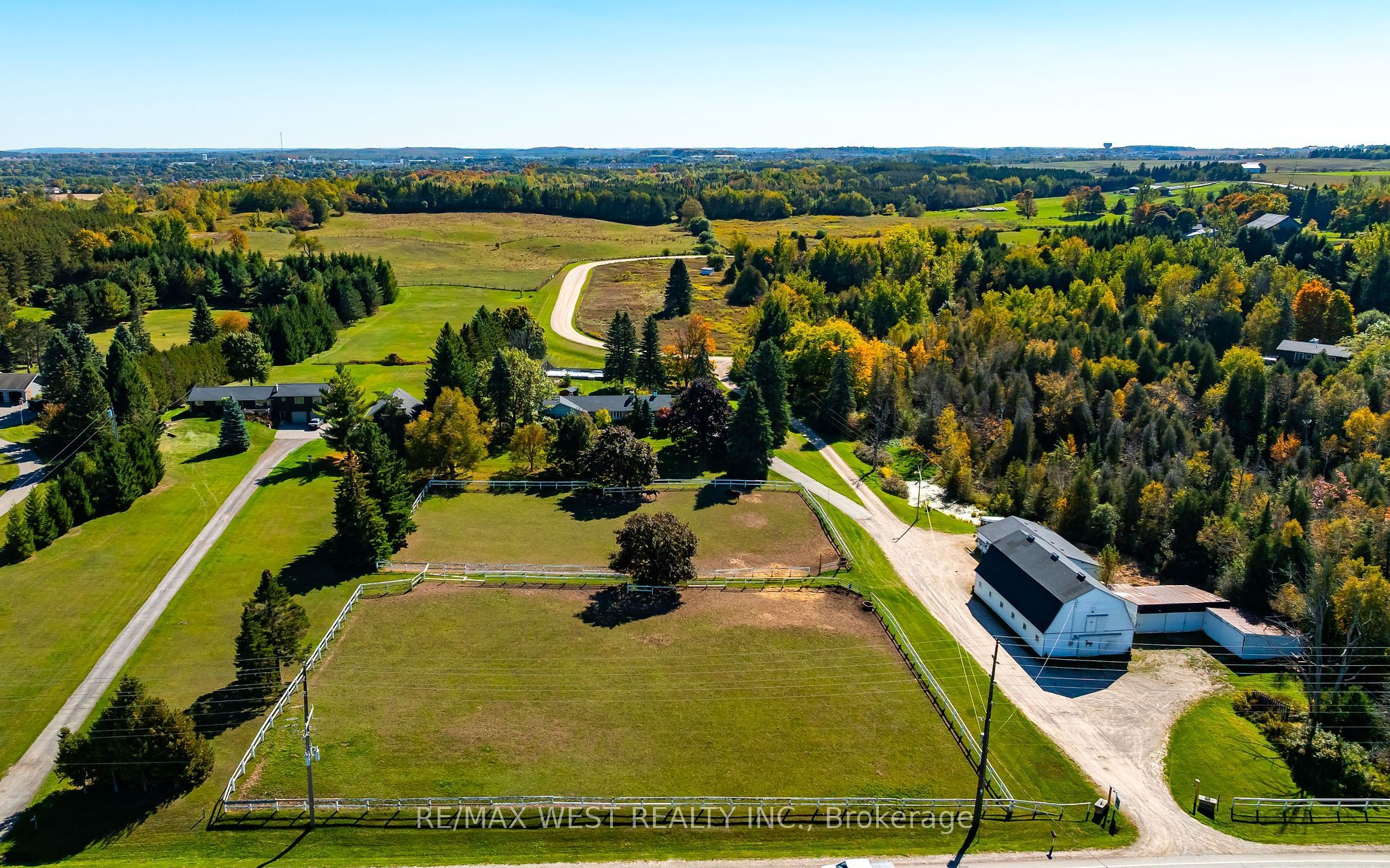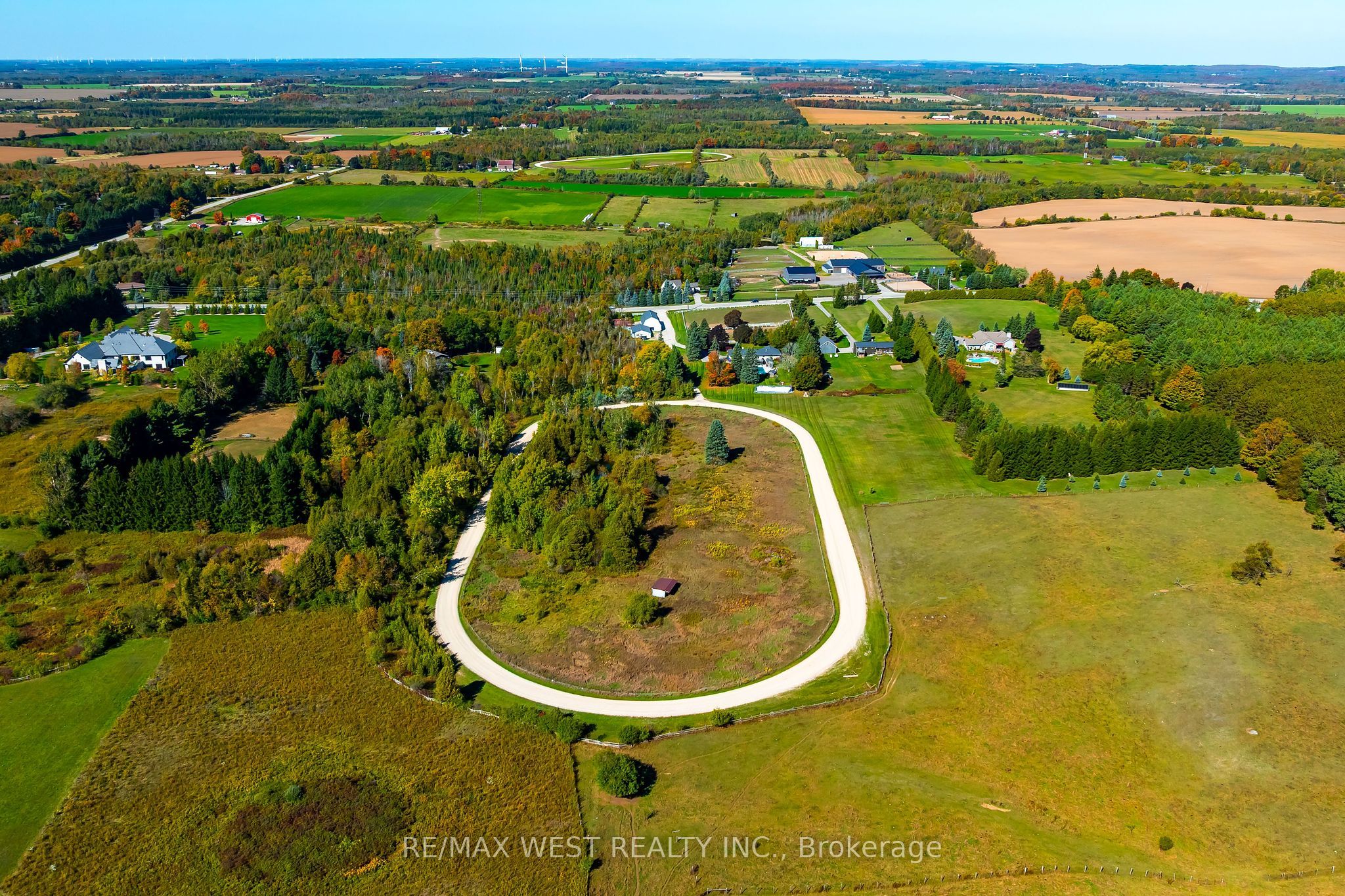 • Wide-open acreage featuring paddocks and a half-mile racetrack.