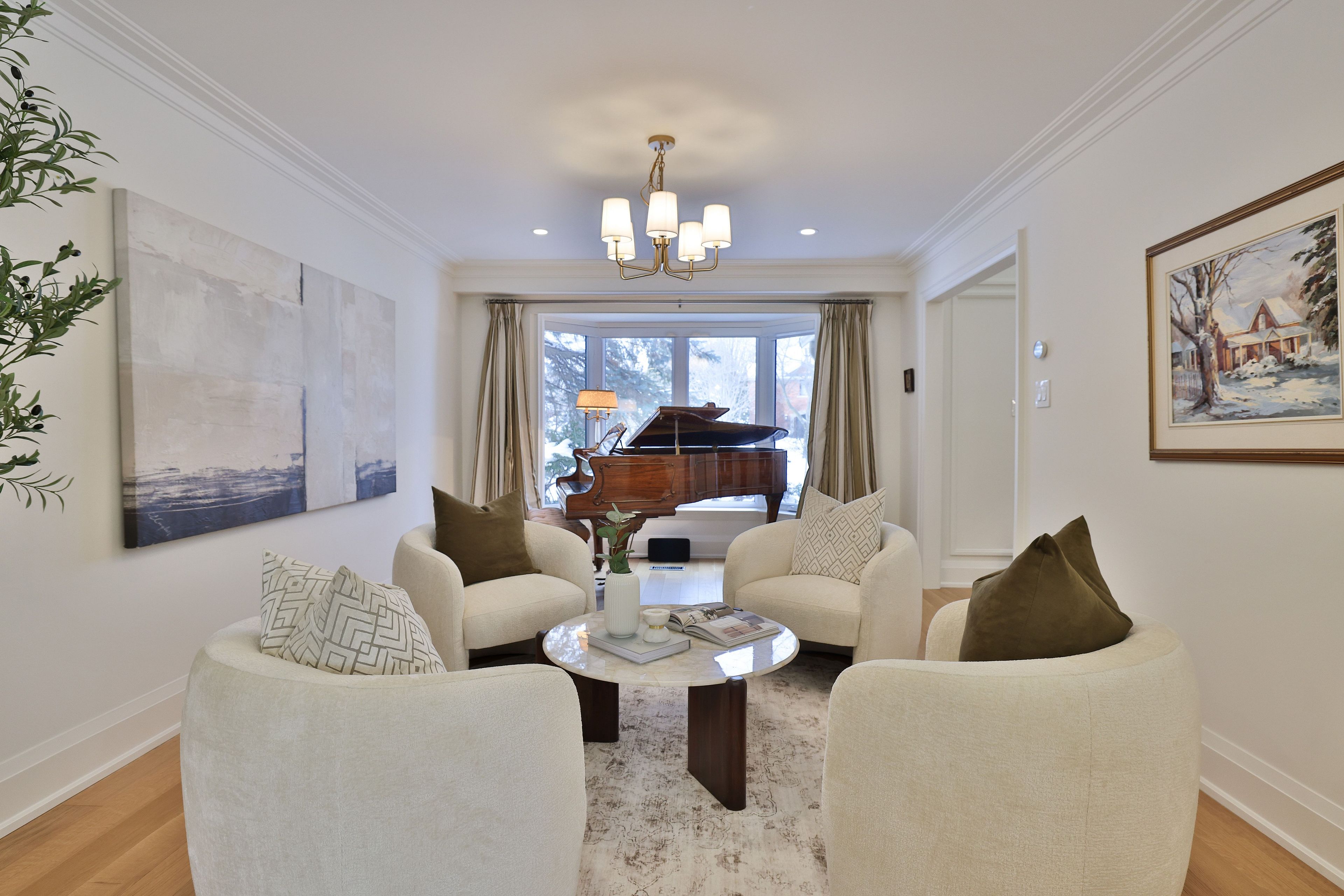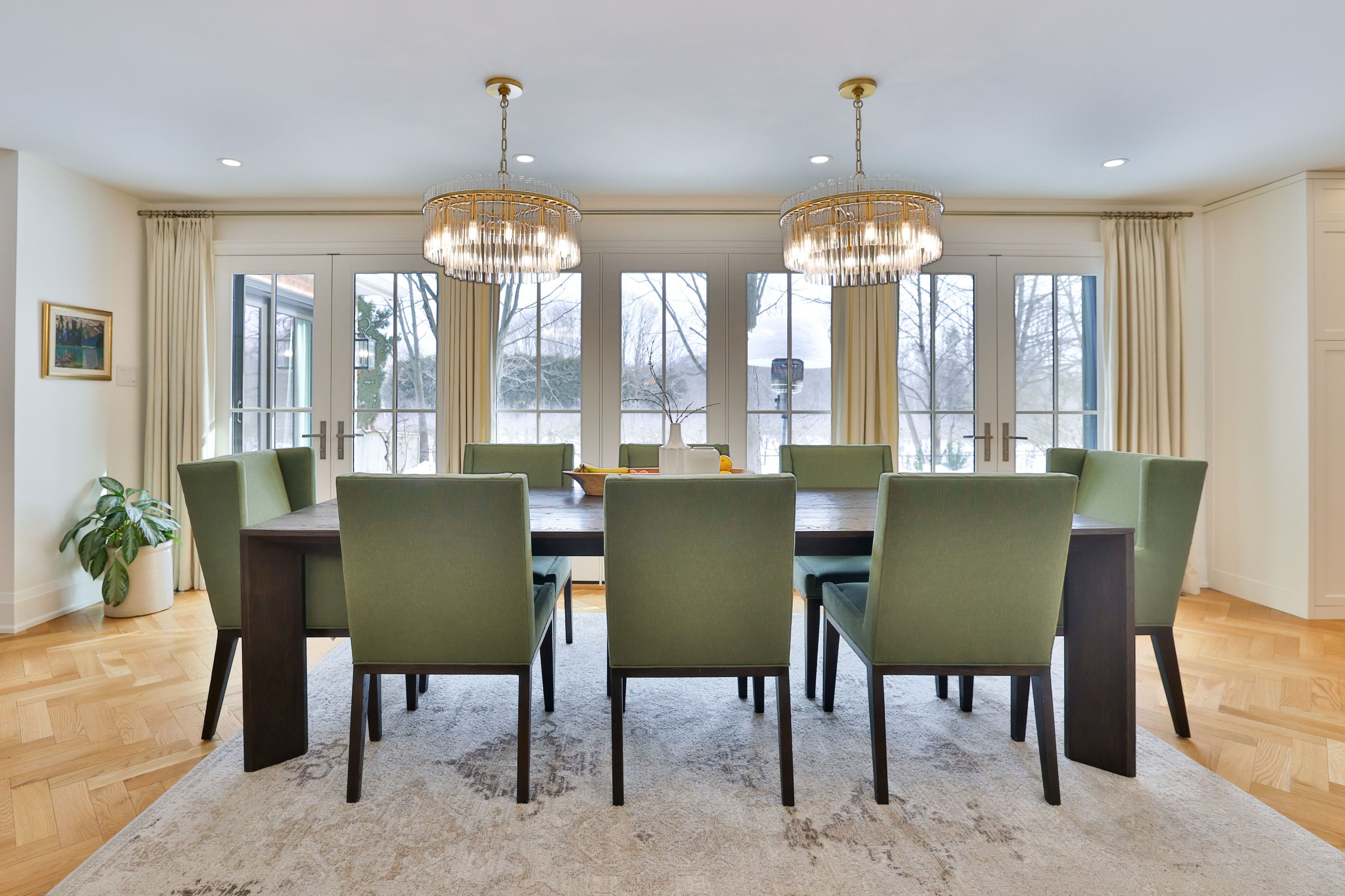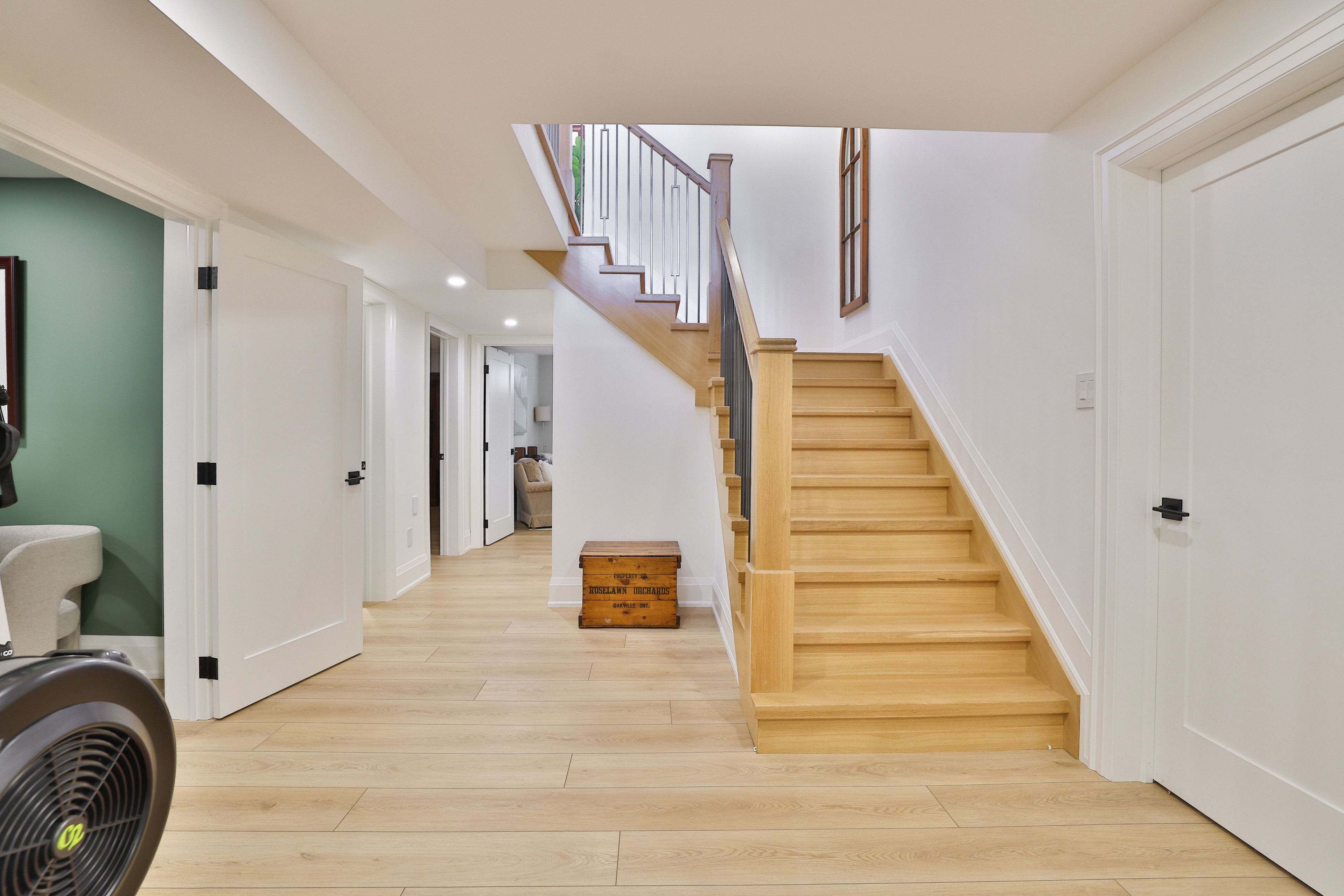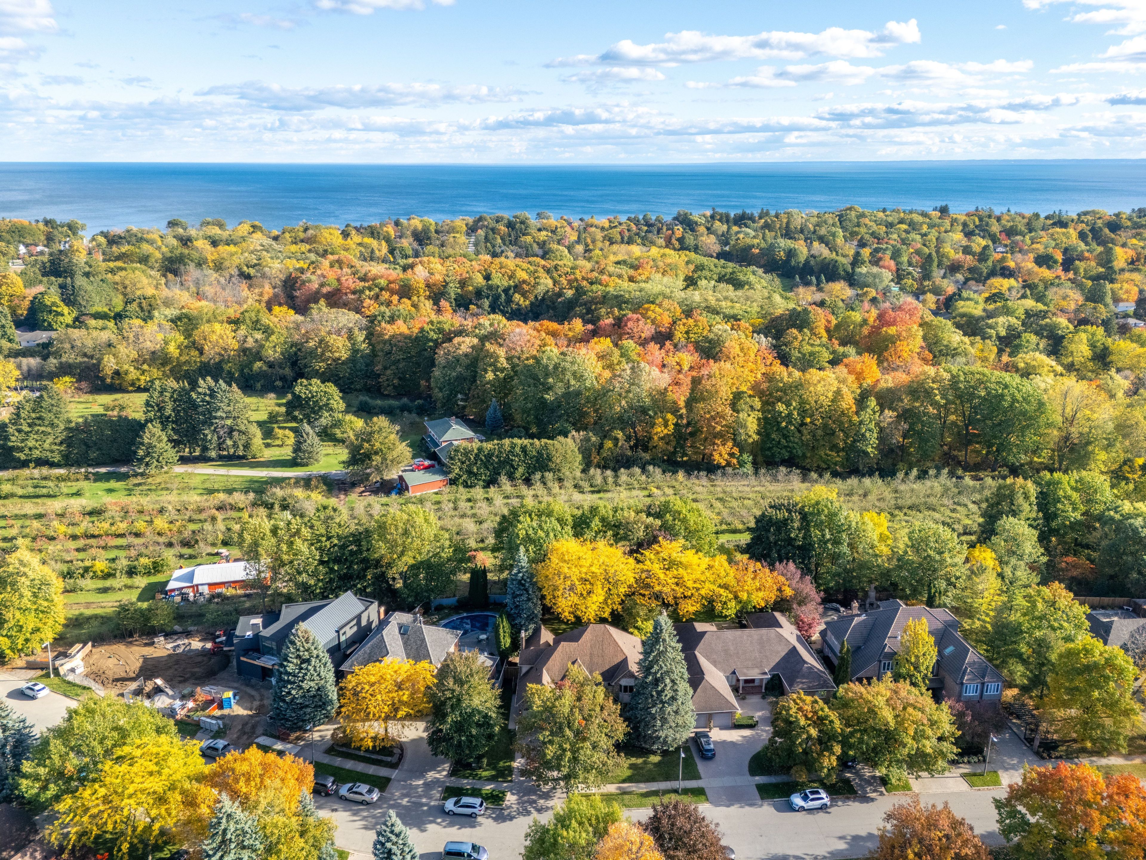 Set on one of south east oakville's premier streets, this extensively renovated residence presents a refined, design-forward family home in an exceptionally private setting. Backing onto a picturesque orchard, the setting feels worlds away. The 141-foot deep, pool-sized lot, with 3,424 square feet of above-grade living space, is ideally suited to both everyday living and entertaining. A striking two-storey entrance hall, fully reimagined during the renovation, features a newly constructed elegant staircase. Just beyond the foyer, a welcoming front sitting area offers an inviting place to gather, flowing naturally into a second seating space adjacent to the kitchen. At the heart of the home, the redesigned kitchen flows seamlessly into the dining area and is anchored by custom cabinetry, quartz countertops, a bespoke tiled oven hood, and premium appliances. The kitchen and dining spaces are unified by a distinctive herringbone-patterned oak hardwood floor, adding warmth and texture, complemented by a wall of windows and glass doors offering views of the backyard and garden beyond. The adjoining family room, enhanced by a cathedral ceiling, connects naturally to the dining area and kitchen and is ideal for relaxed living. The upper level is anchored by a spacious primary suite with a walk-through closet leading to a six-piece ensuite with heated flooring, complemented by three additional bedrooms and a family bathroom. The finished lower level adds flexibility with a spacious recreation room centred around a fireplace, a dedicated gym space, office, an additional bedroom, and a three-piece bathroom. Extensively renovated in 2022, upgrades include new windows, oak hardwood flooring, mechanical systems, electrical, smart-home infrastructure, ev-ready garage wiring, enhanced insulation and new exterior doors. A rare offering blending architectural presence with thoughtful modernization in one of south east oakville's most desirable settings.