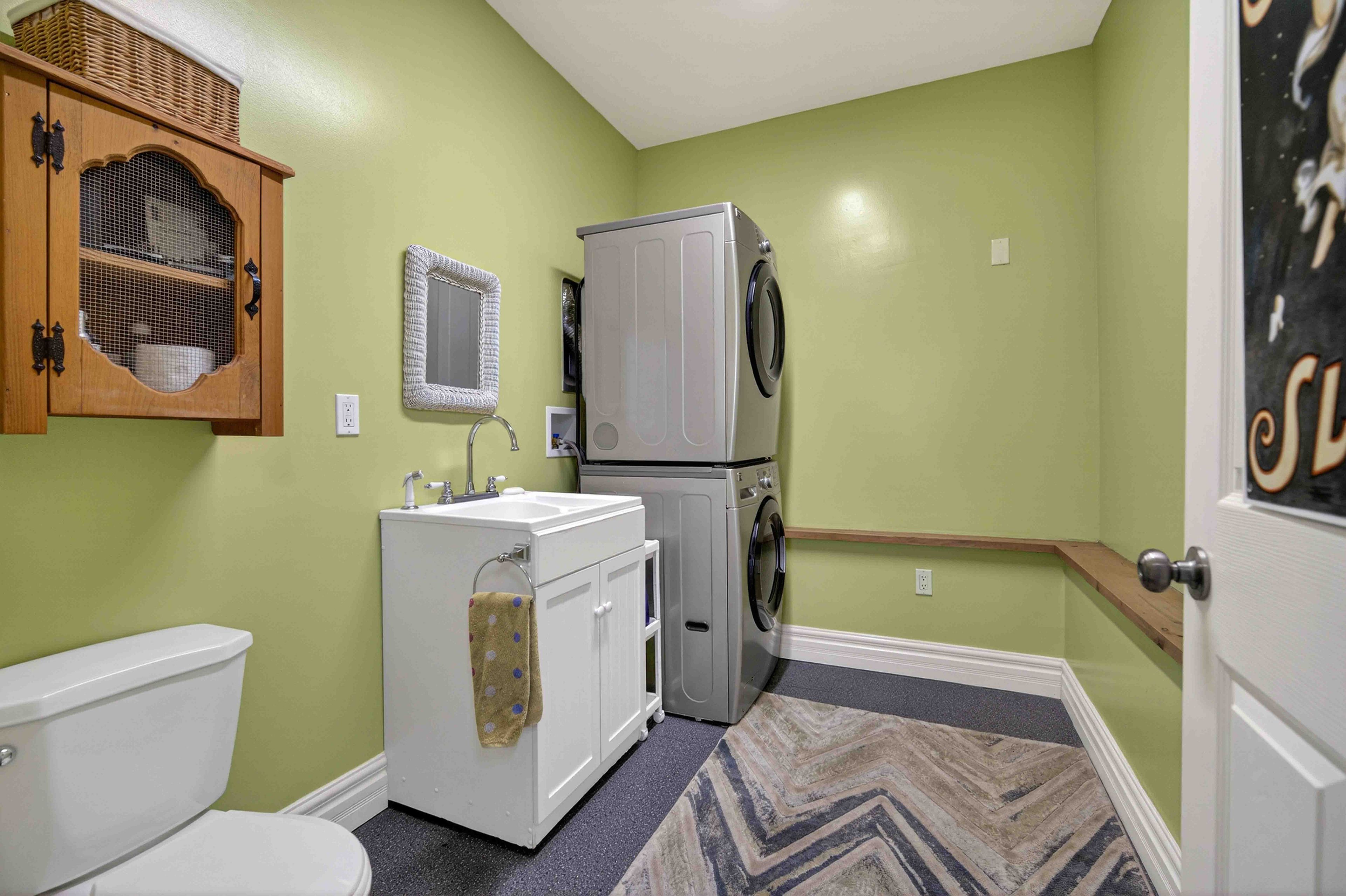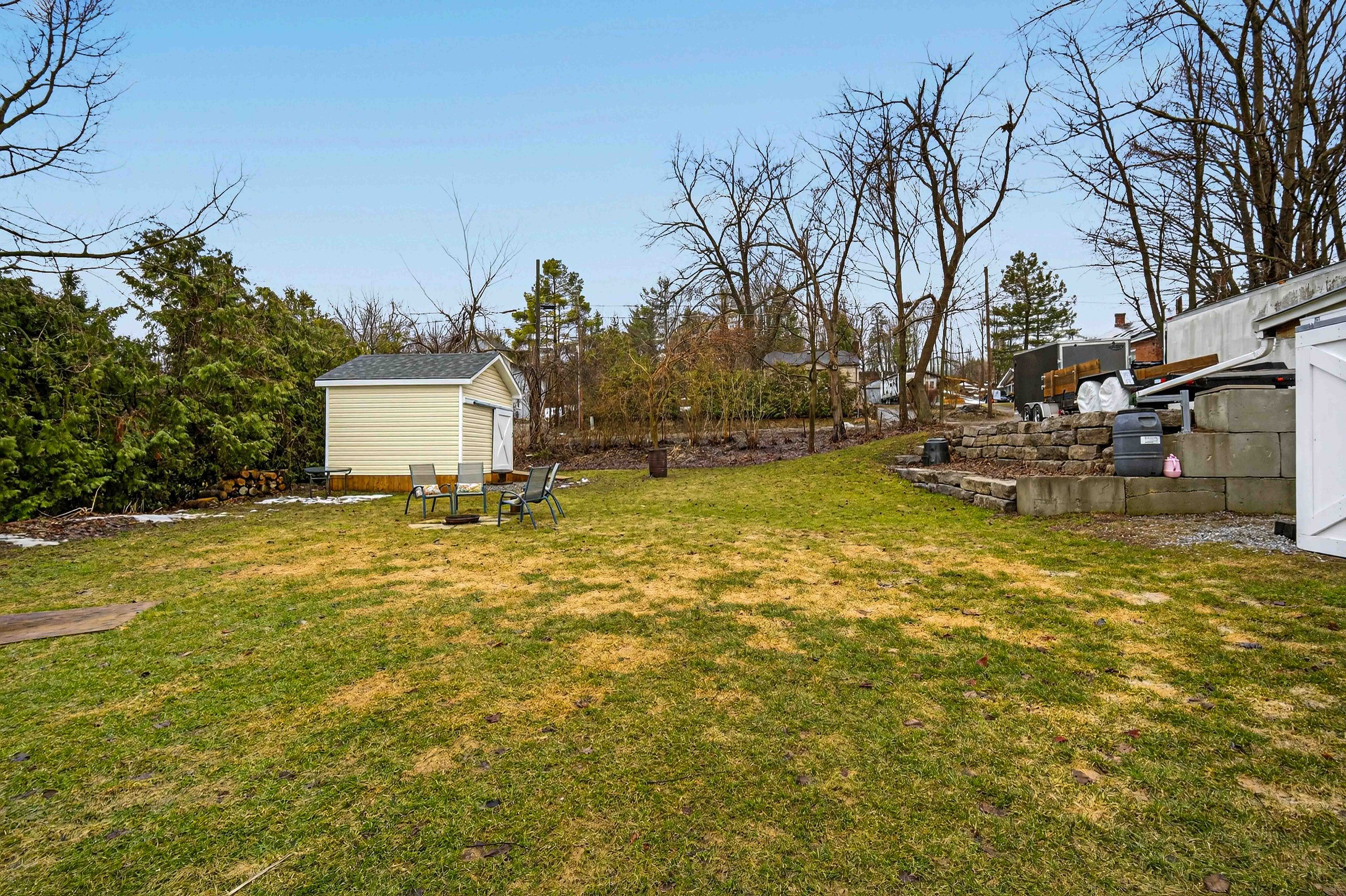 • Expansive outdoor space featuring a deck, fire pit, and storage shed.