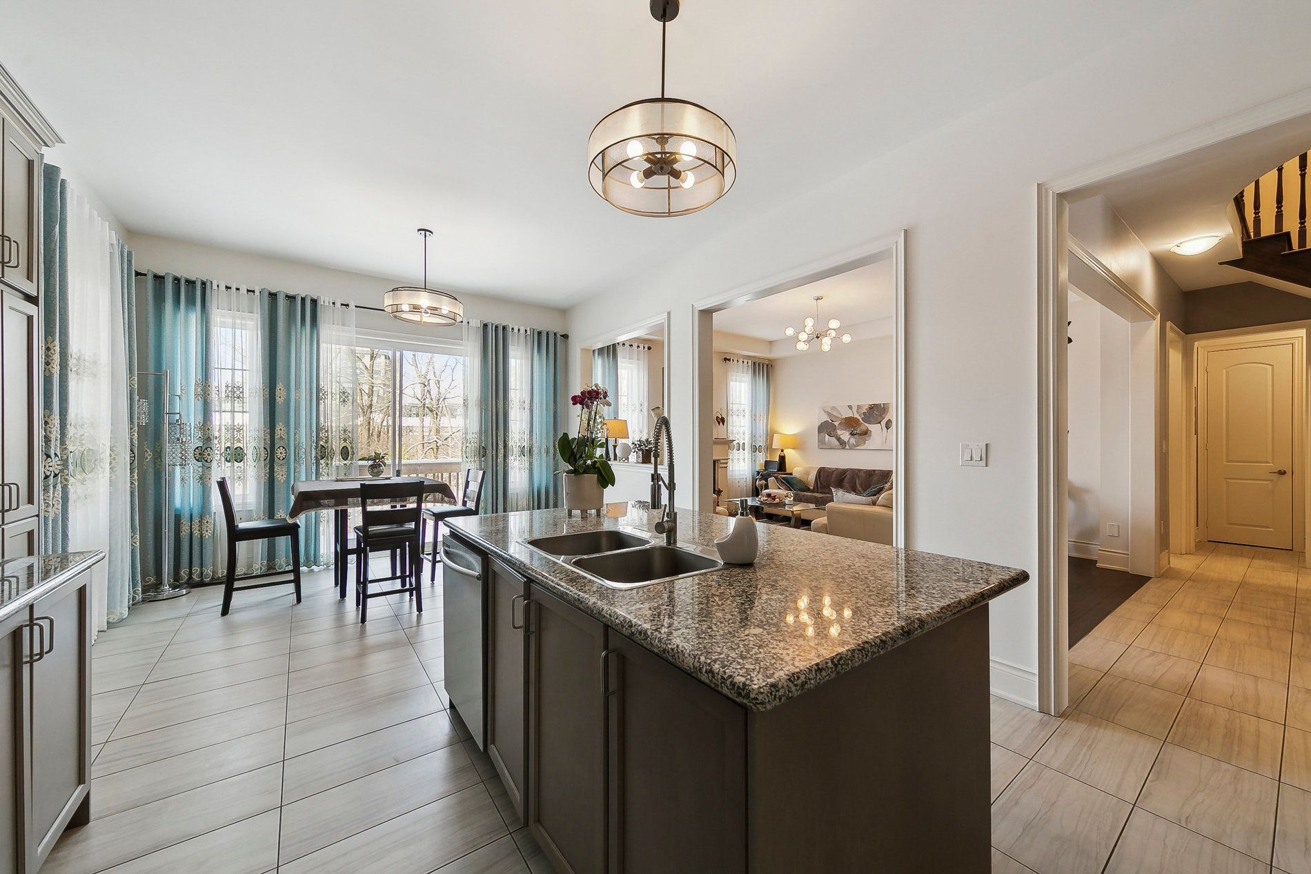 • Open concept kitchen/family room with marble countertops and ravine views.