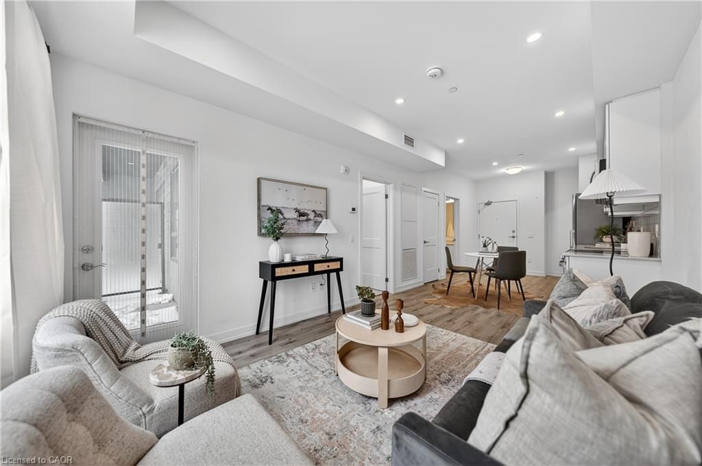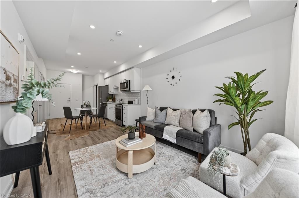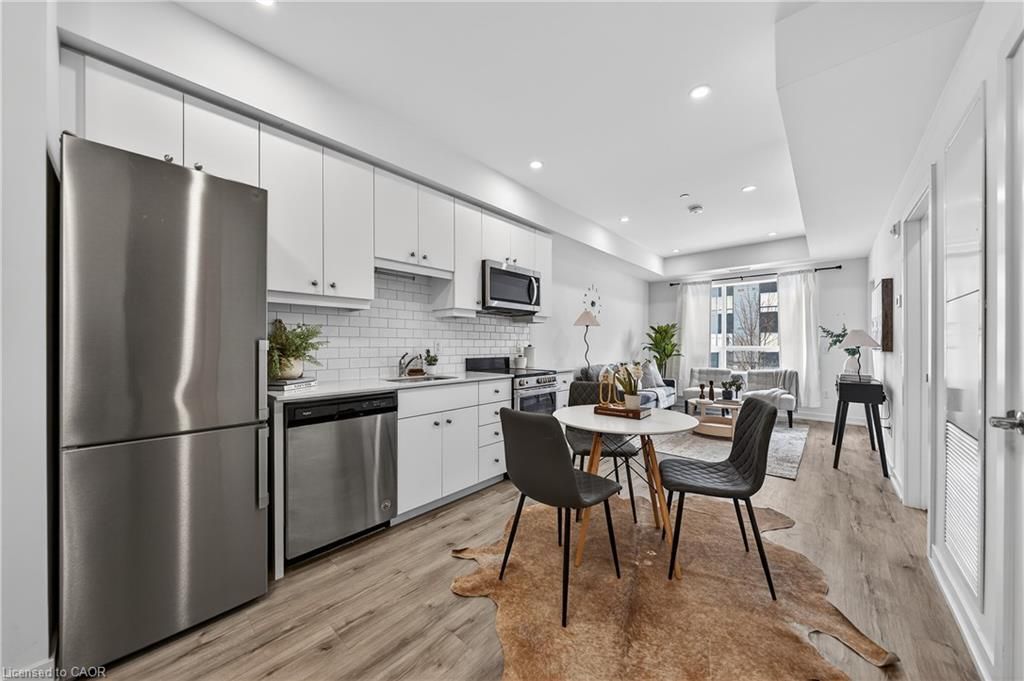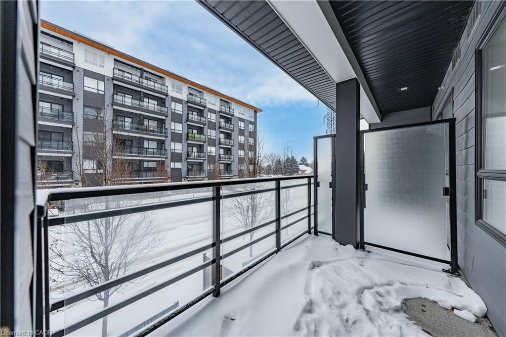 Available may 1st! Discover low-maintenance, modern living in the heart of waterloo. Unit 210at the blackstone is a bright, airy 1-bedroom, 1-bath condo offering 573 sq ft of comfortable space. Tall ceilings and built-in blinds enhance the open-concept layout. The kitchen is equipped with stainless steel appliances, durable stone countertops and a contemporary tile backsplash, flowing into the cozy living area with walkout to a private balcony - perfect for morning coffee or evening relaxation. The carpeted bedroom includes a roomy walk-in closet and the 4-piece bathroom is well-appointed. Practical conveniences include in-suite laundry, a storage locker and one underground parking space. The building elevates daily living with plentiful amenities: rooftop terrace with bbqs, exercise room, courtyard with bbq and firepit, party/study room, bike room and visitor parking. Ideally situated close to conestoga mall, grocery stores, restaurants (including browns socialhouse), st. Jacobs market, walking trails and public transit. Ideal for professionals or anyone seeking a well-located, amenity-rich rental in waterloo.