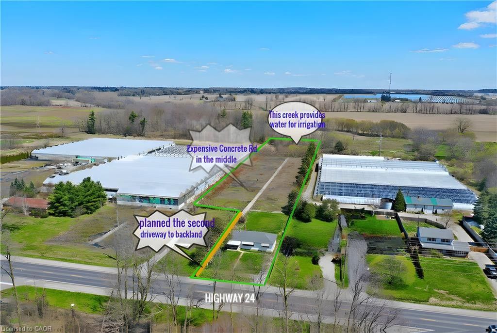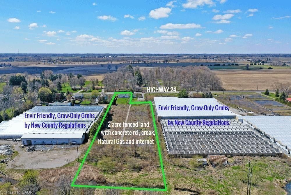 Prime 2-acre investment opportunity located on high-exposure highway 24 in waterford, just minutes to simcoe, ~30 minutes to brantford, and under 1 hour to hamilton. This level, fully fenced parcel offers excellent accessibility with a wide concrete driveway and strong future potential for an additional farm access . Featuring fertile sandy loam soil and a scenic creek at the rear, the property is well-suited for a variety of income-generating uses, including greenhouse operations, nursery/garden center, hobby farm, landscaping yard, contractor shop, or agri-related business. Ample space to construct outbuildings such as workshops, barns, or greenhouses. Full services available: natural gas, hydro, and high-speed internet-ideal for both residential and commercial-style rural operations. Zoning and location provide strong appeal for live/work setups and small business expansion. Improved with a 3-bedroom, 2-bath bungalow (approx. 1,012 sq ft main level) plus a bright basement with large windows. Significant renovations already completed (approx. 85%), including electrical updates, wall improvements, and new pump system. Property sold "as is," offering value-add potential for investors or end users. Rare opportunity to secure a versatile rural asset with excellent exposure, infrastructure, and multiple income streams.