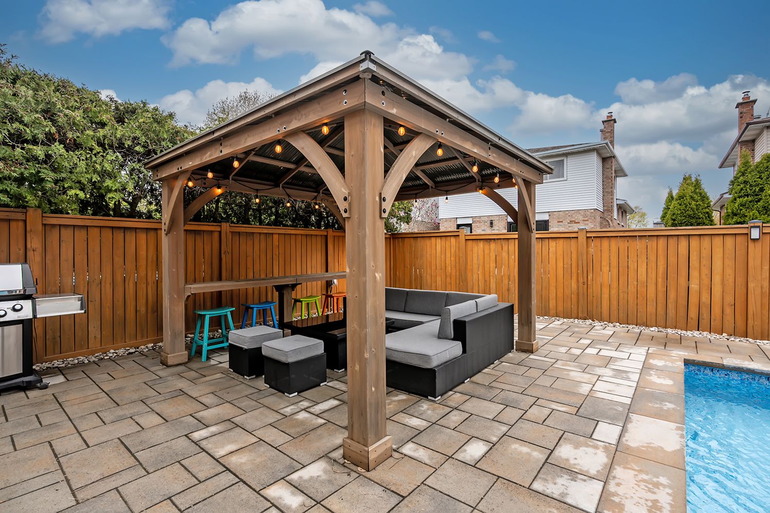 • Private backyard oasis with heated saltwater pool and gazebo.