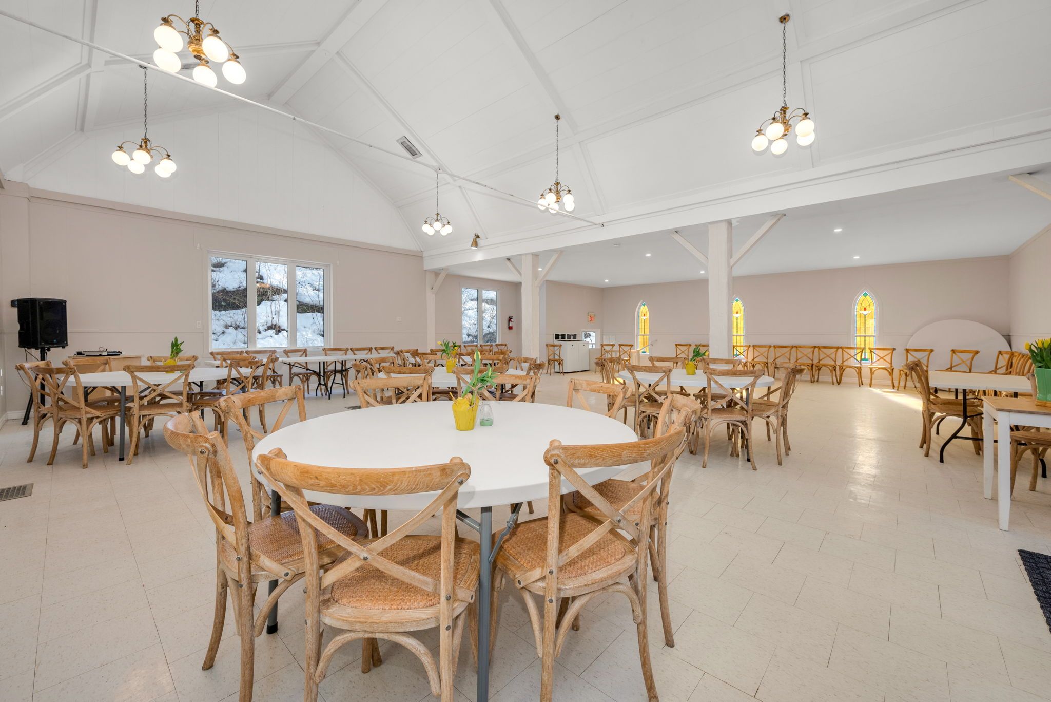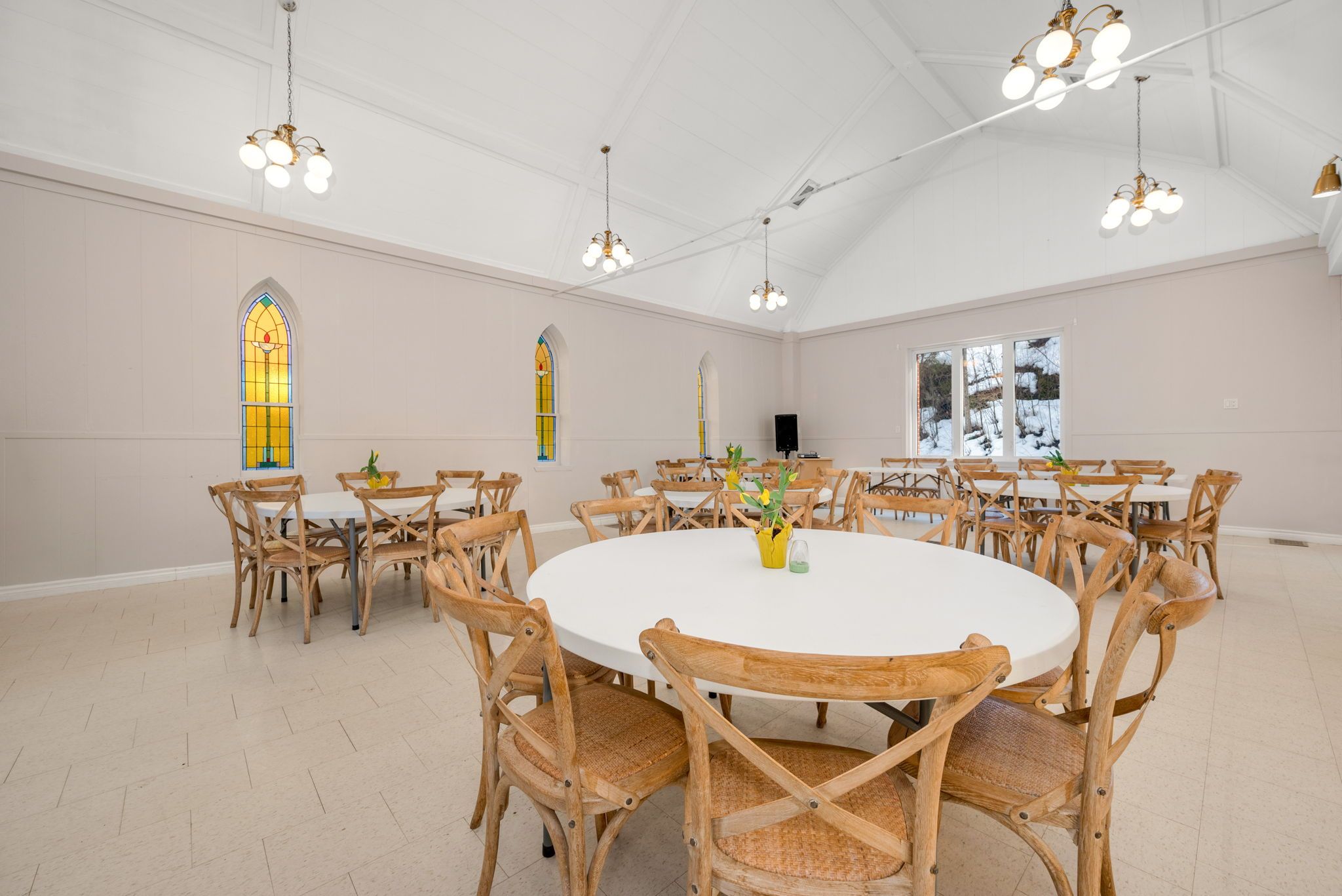 • Beautiful stained glass windows and soaring ceilings create a charming atmosphere.