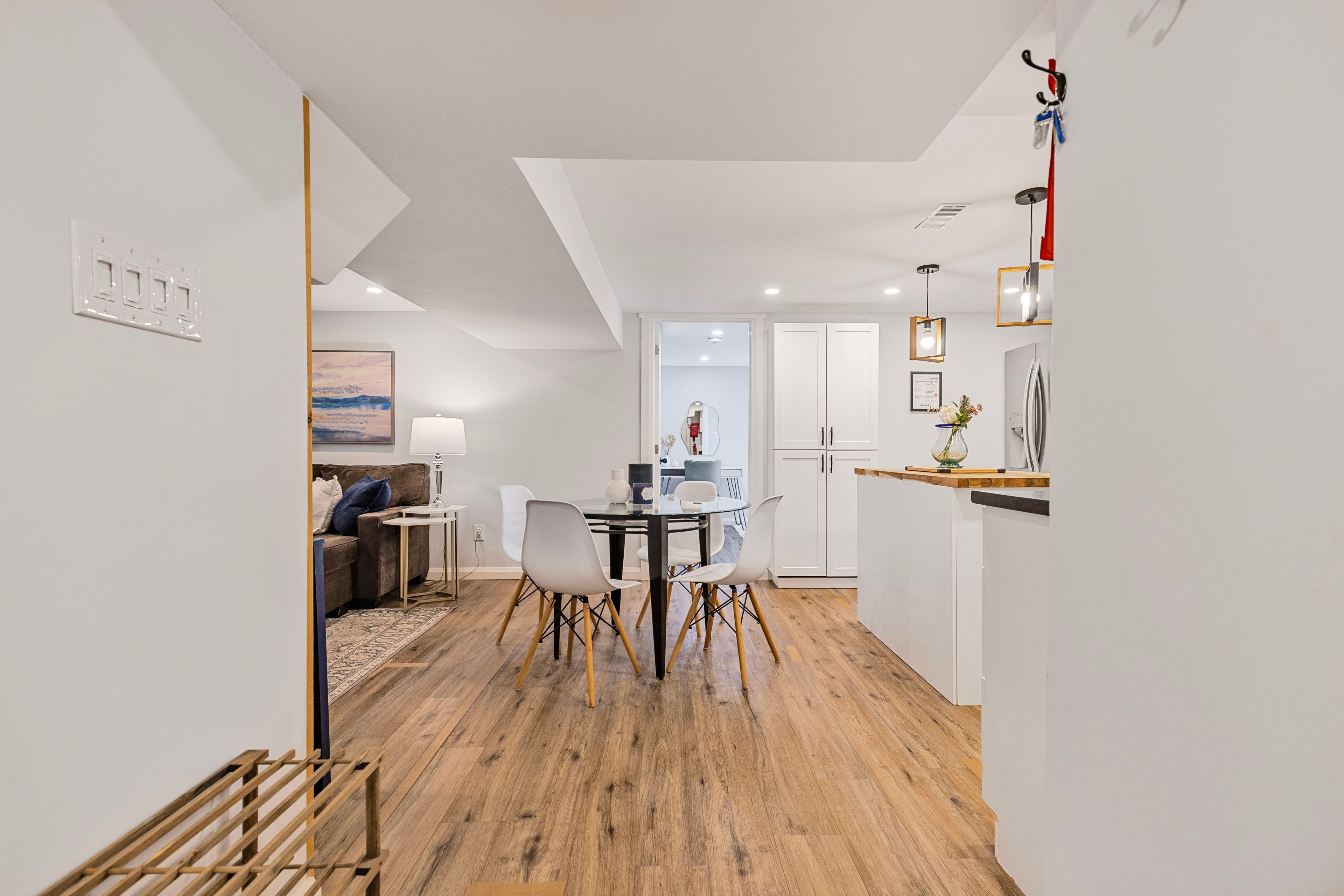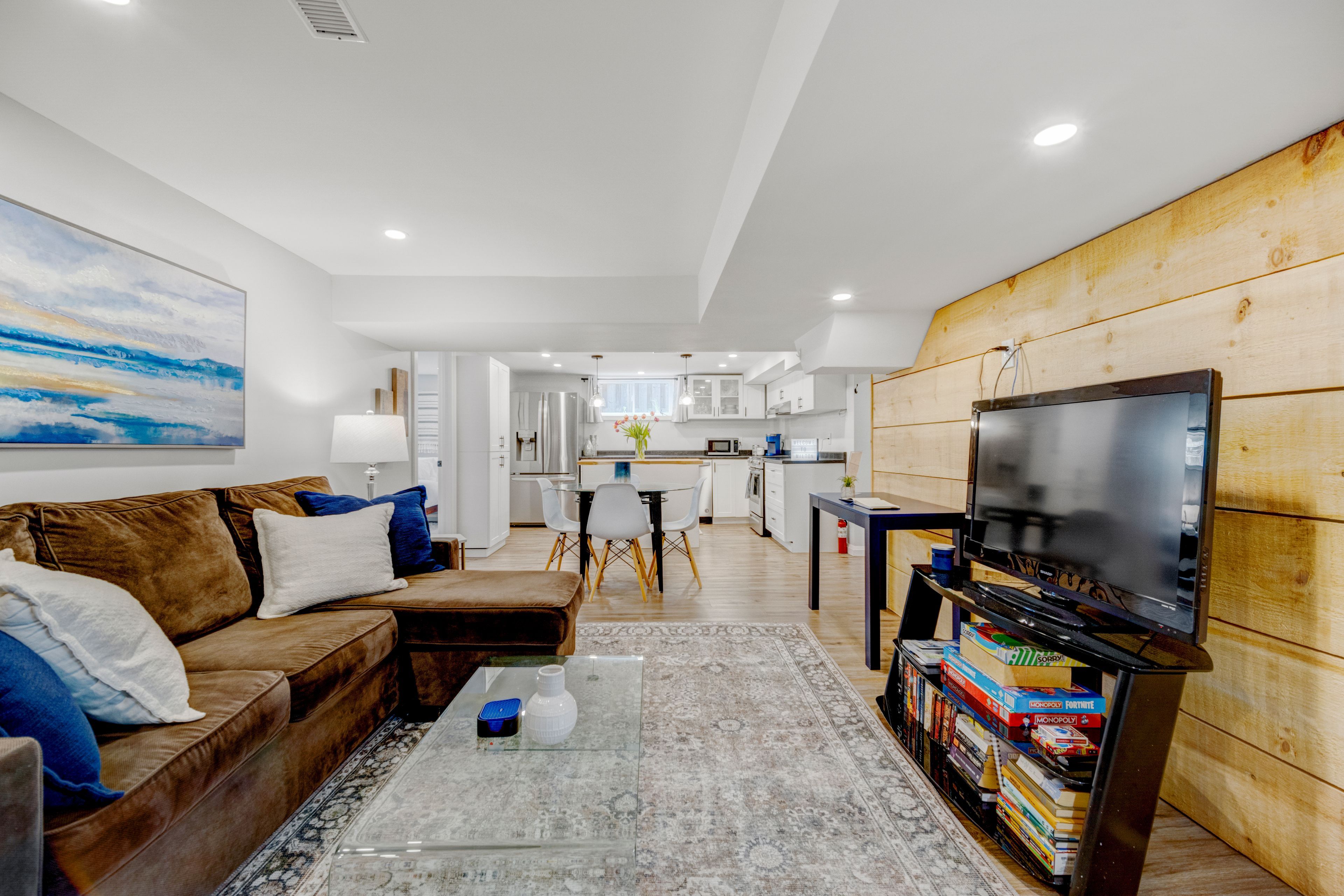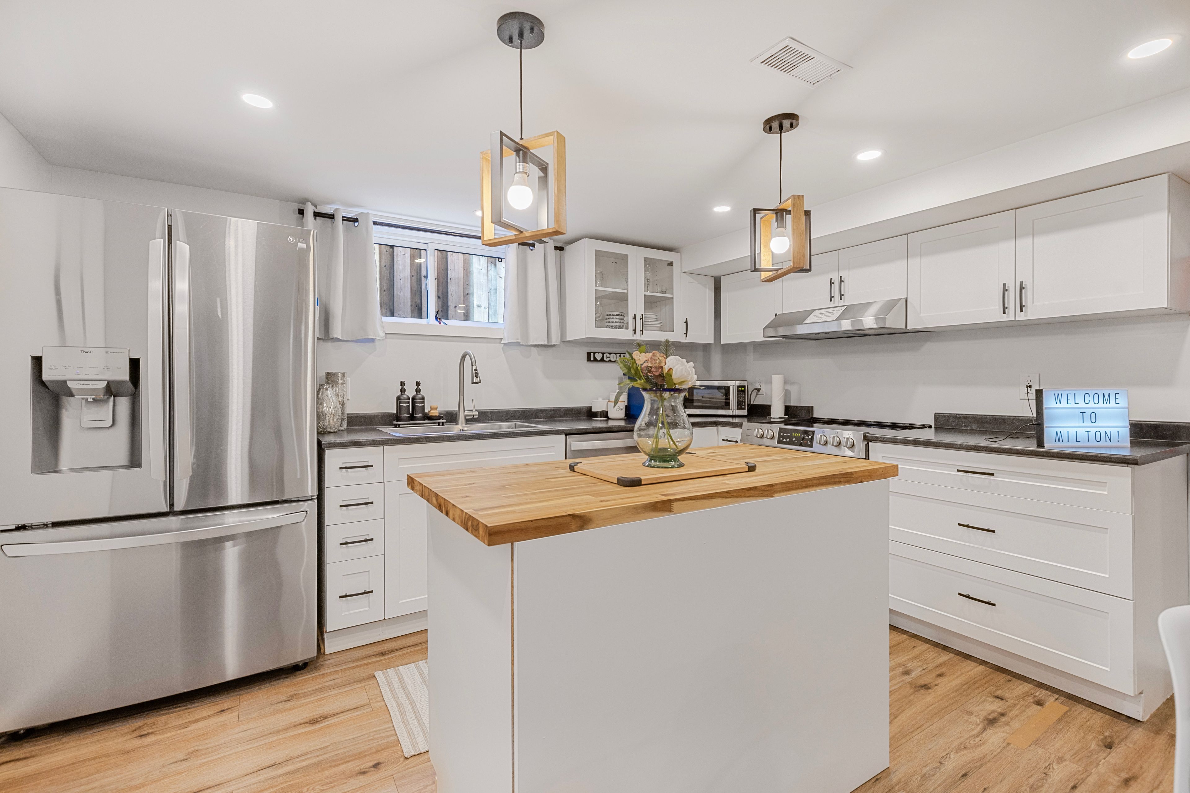 Bright, spacious, and private suite offering approx. 1,250 sq ft in the heart of downtown milton. Steps to boutique shops, restaurants, and mill pond, and minutes to halton's conservation areas. This beautifully finished space features two full bedrooms, a full bathroom, and private, non-shared laundry. The open-concept layout offers pot lights in every room, dimmable lighting, and oversized above-grade windows that bring in excellent natural light. The kitchen, dining, and living areas are generous in size and feel like a true apartment, not an afterthought. The kitchen is equipped with full-size stainless steel appliances, a gorgeous butcher block island and a pantry! Storage is exceptional, with a large walk-in closet off the living area plus wall-to-wall bedroom closets with built-in shelving. Neutral finishes throughout create a clean, modern feel. There is also a dedicated office nook ideal for a home office or study space. A newer high-efficiency furnace and heat pump provide efficient, reliable heating and cooling year-round. A huge, welcoming breezeway offers a ton of space as you walk in-unlike typical lower levels suite and entry into the suite is effortless with only six steps down! Tenant will also have a private outdoor area to enjoy!