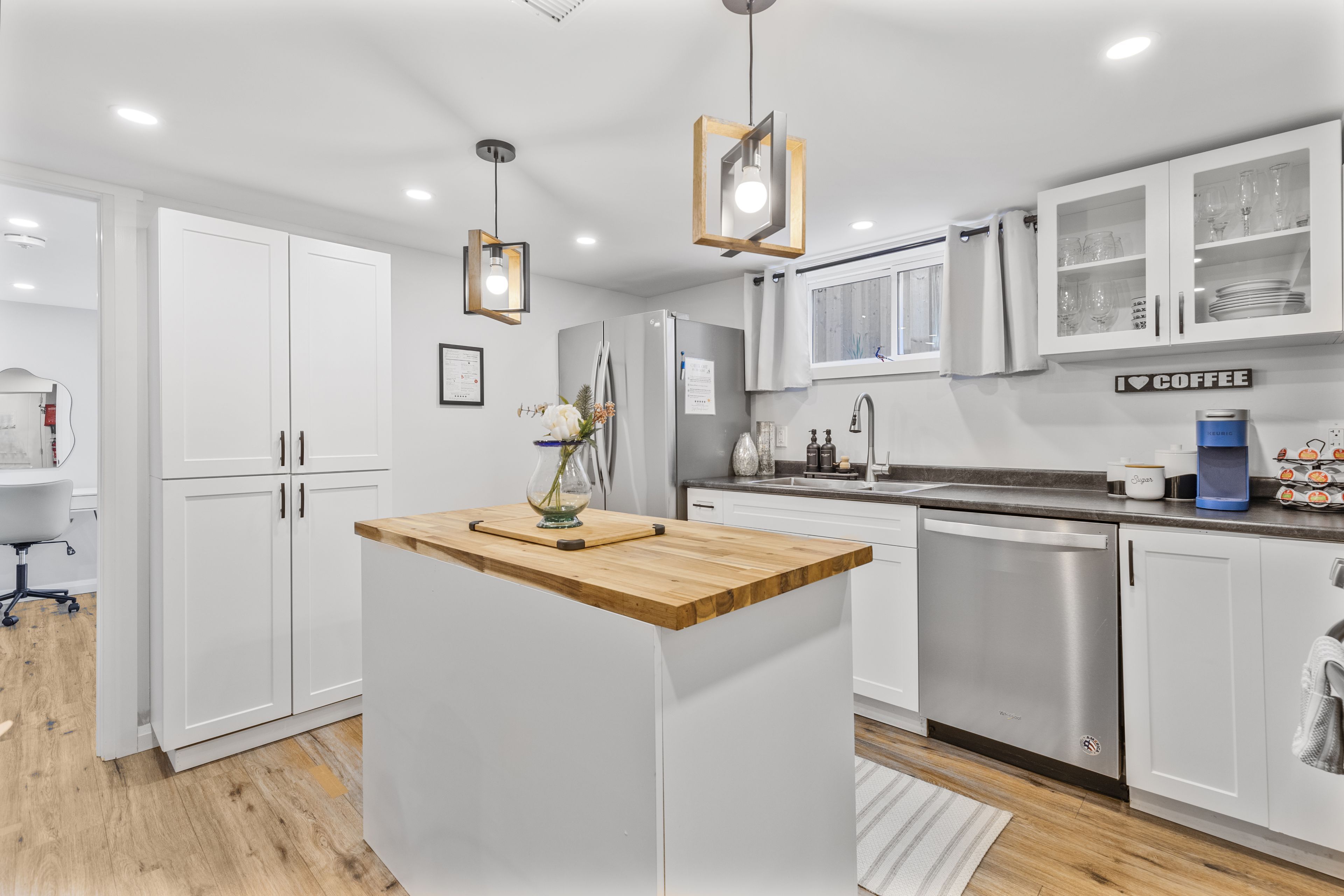 • Full kitchen with stainless steel appliances and a butcher block island.