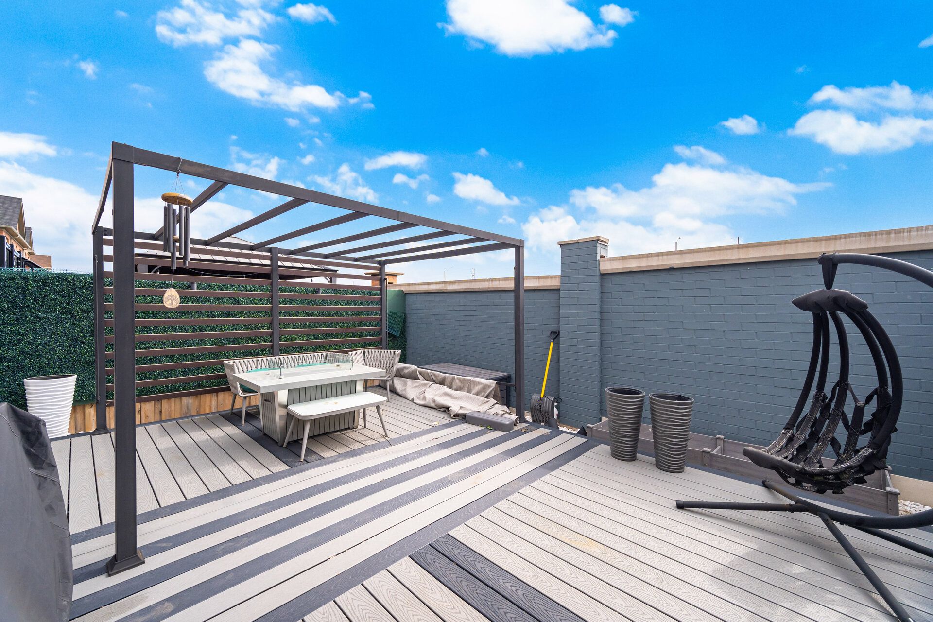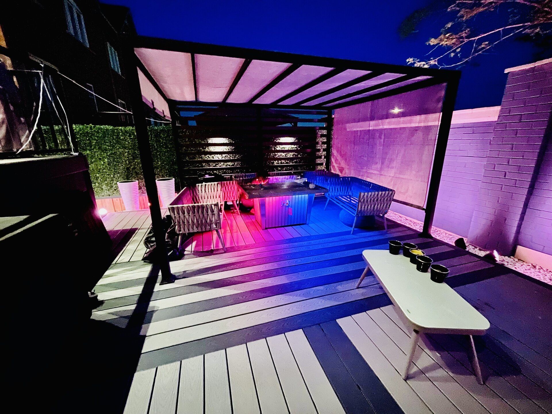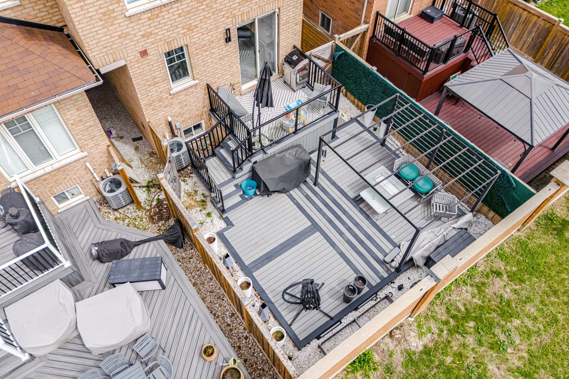 • Backyard oasis with composite decking and glass railings for entertaining.
