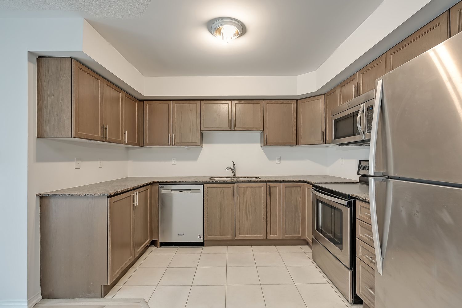 • Modern kitchen features stainless steel appliances and granite counters.