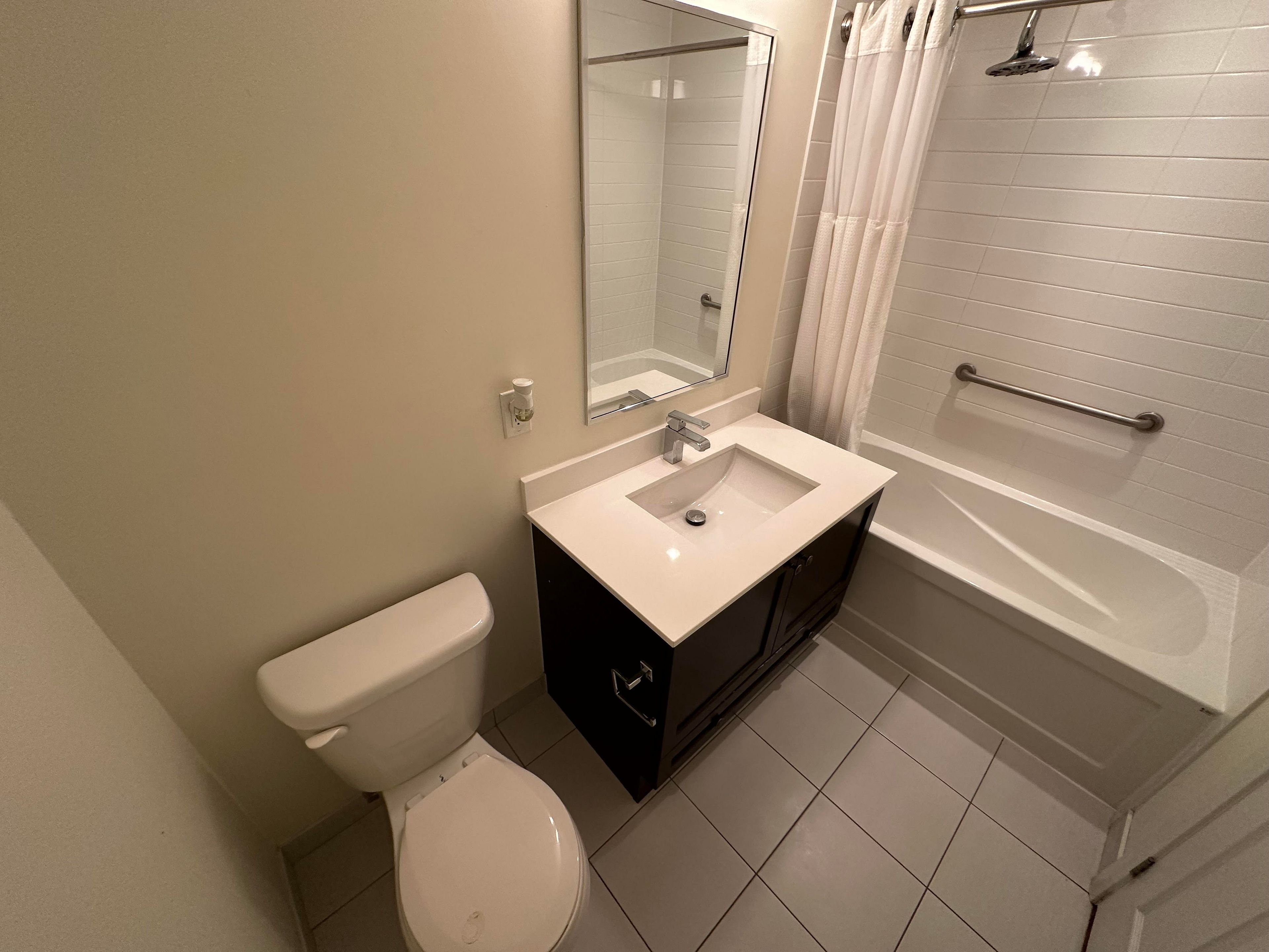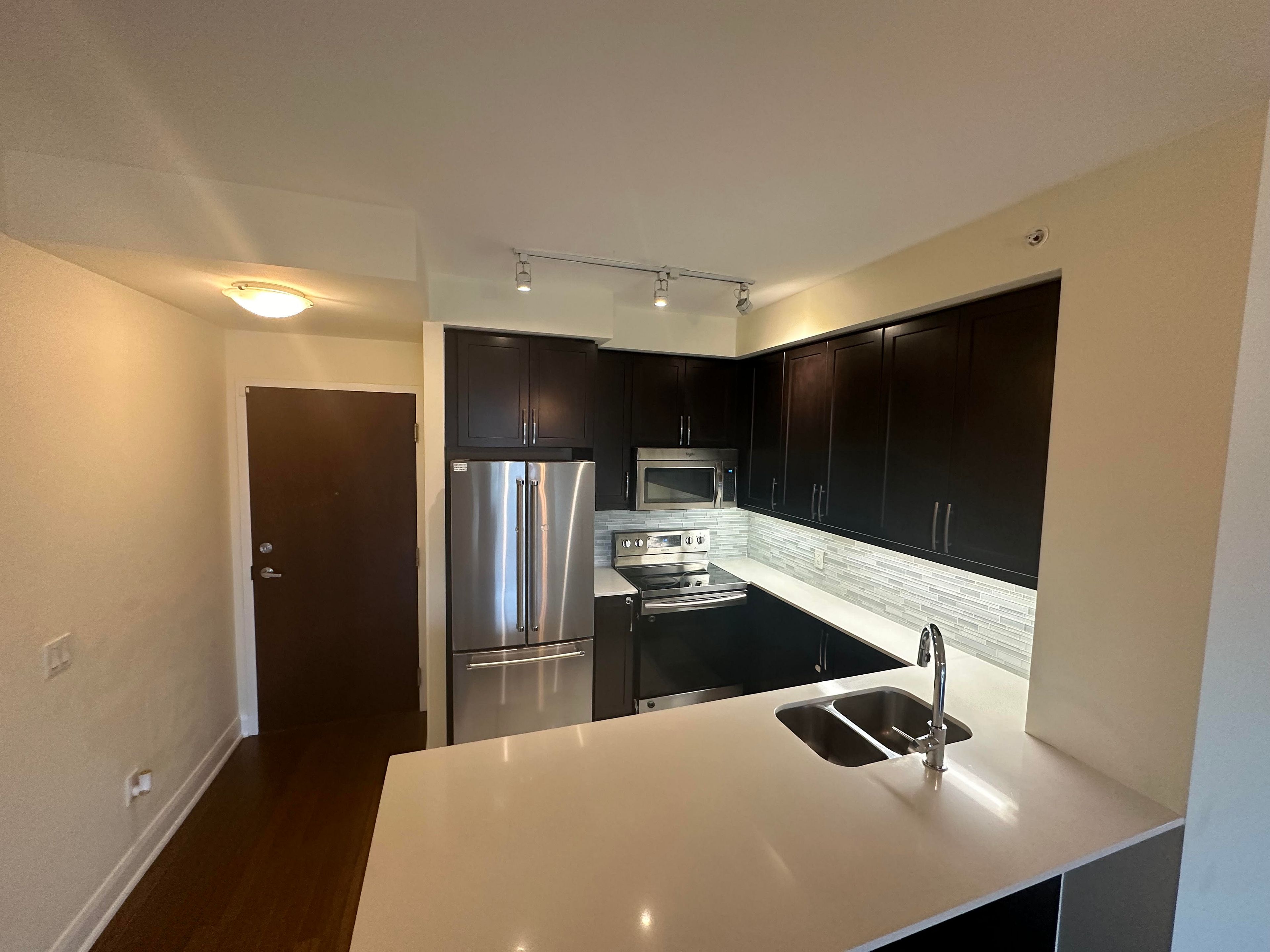 • Modern kitchen with quartz countertops and stainless steel appliances.